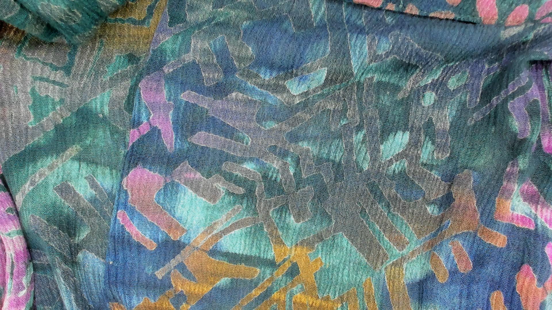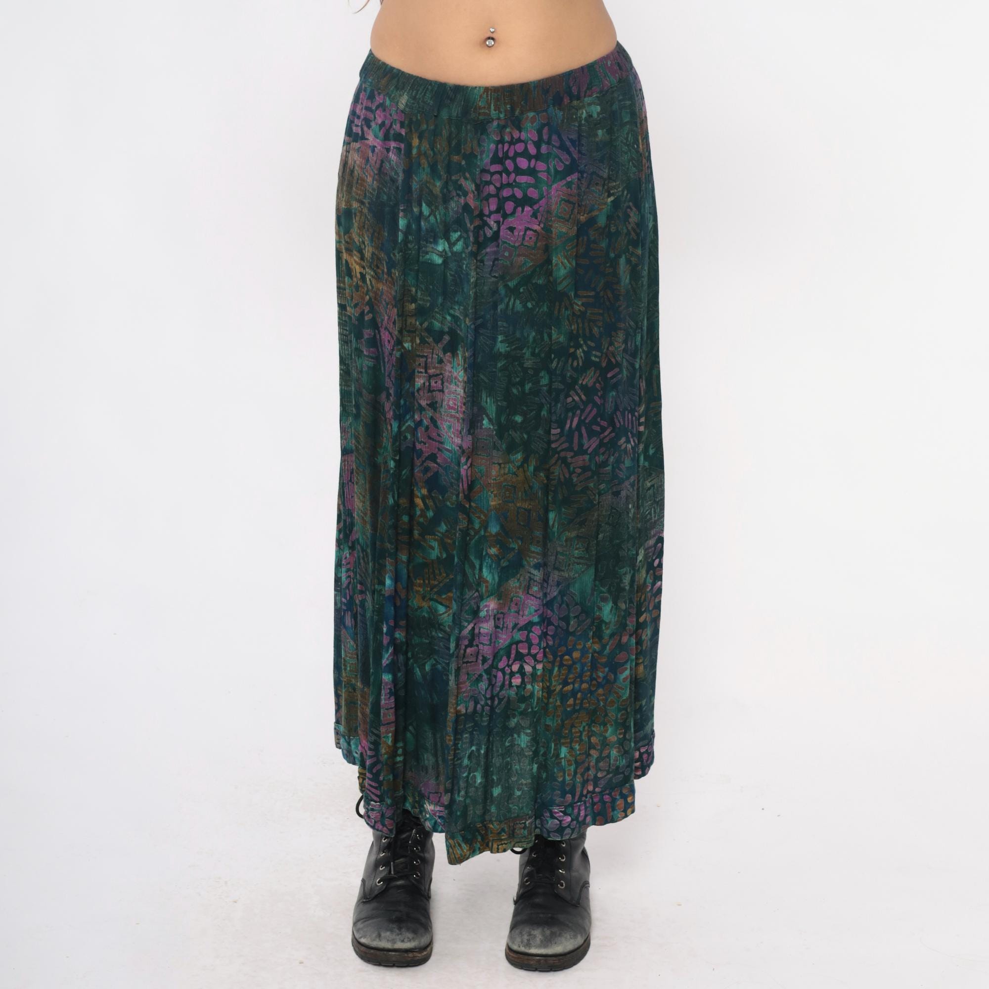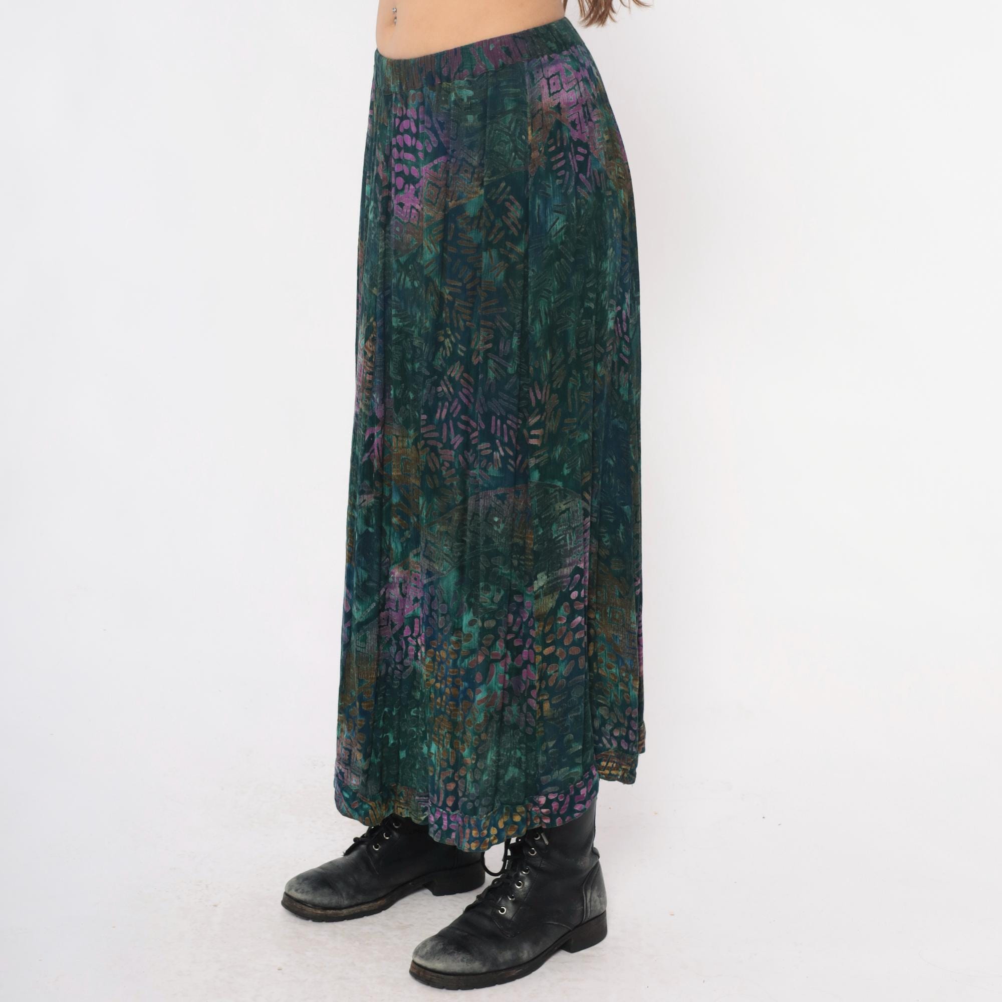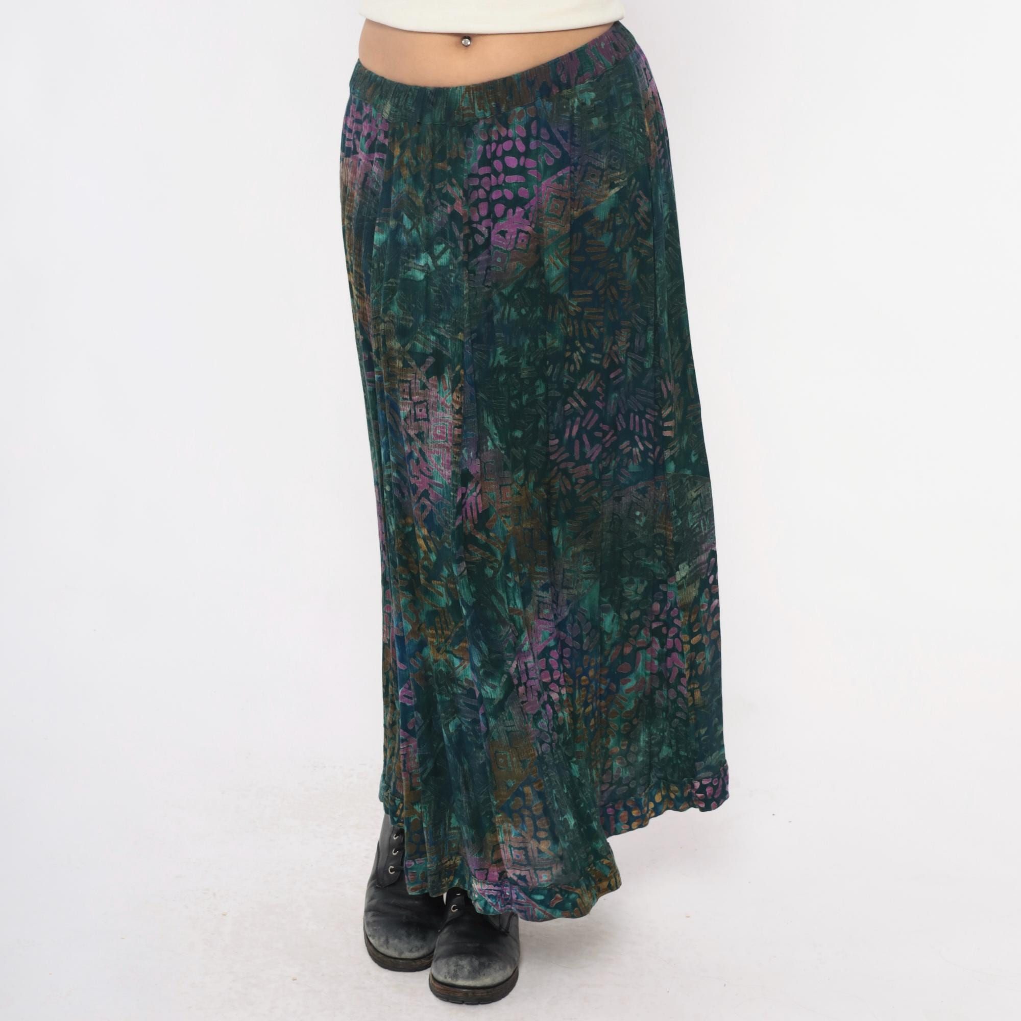 90s dark green maxi skirt from Lost River Clothing Co with abstract geometric print in teal, purple, navy, and gold. Elastic waistband, full A-line silhouette.