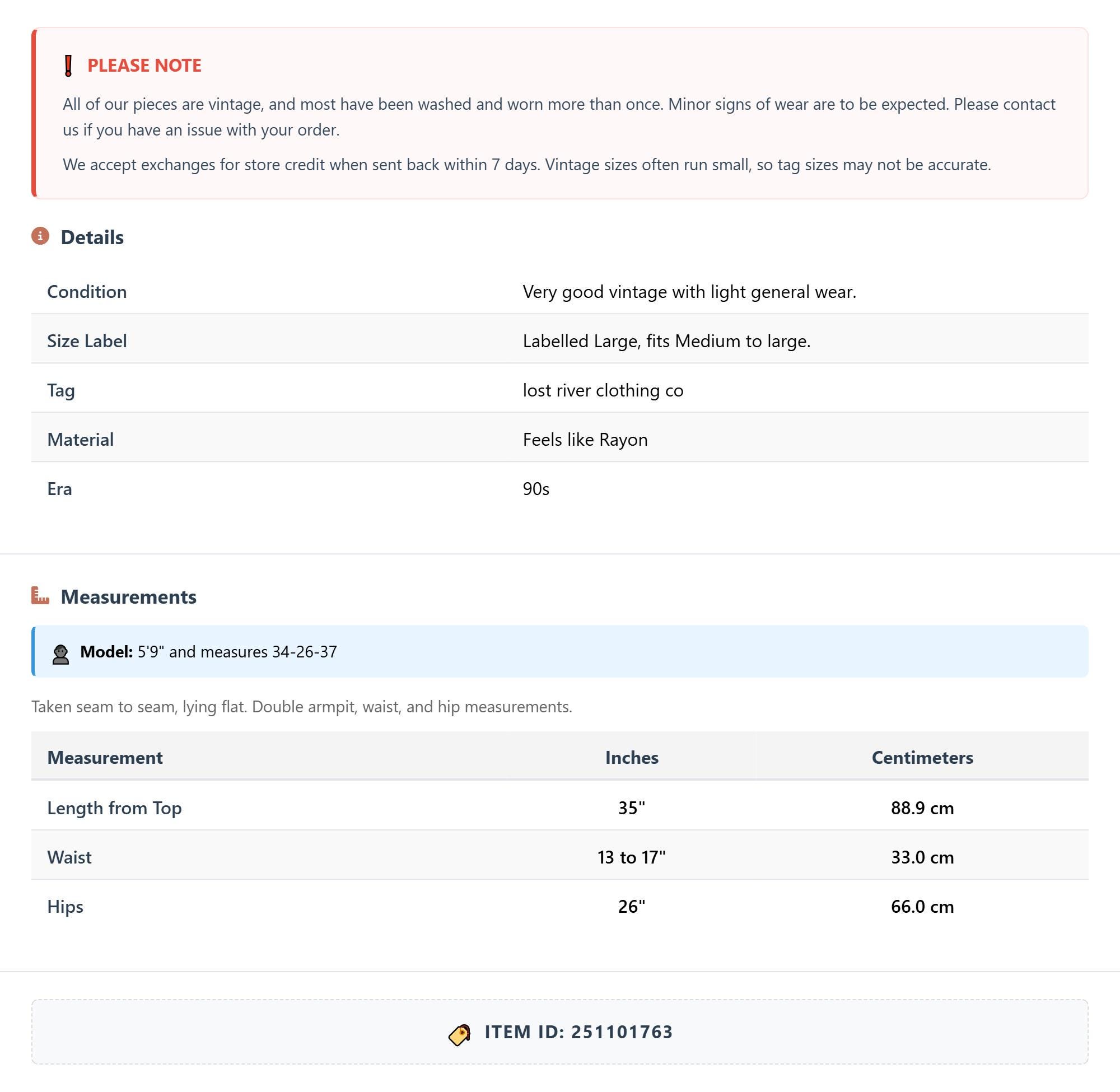 Suggested sizes are estimates only; see measurements for exact sizing. Vintage sizes often run small, so tag sizes may not be accurate.