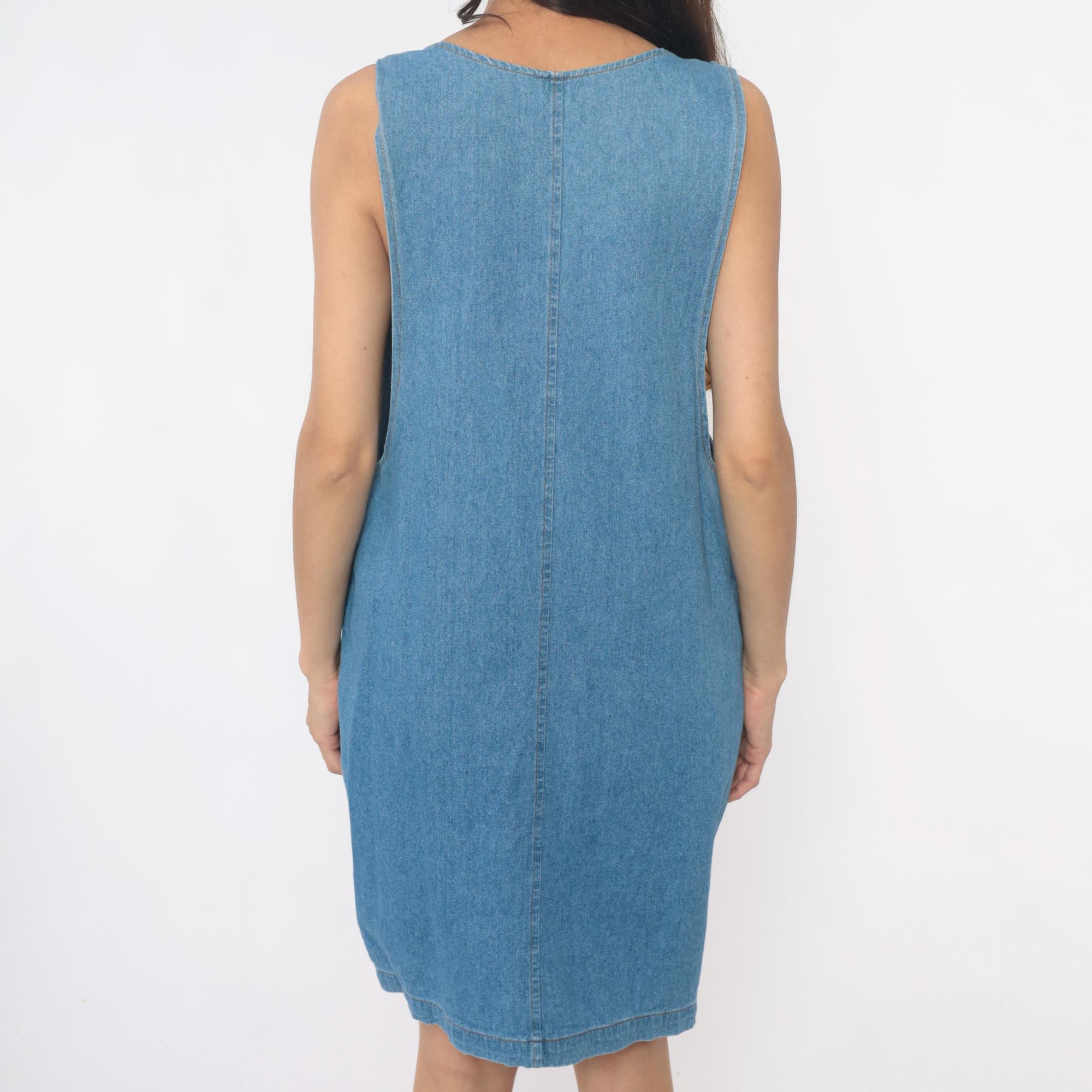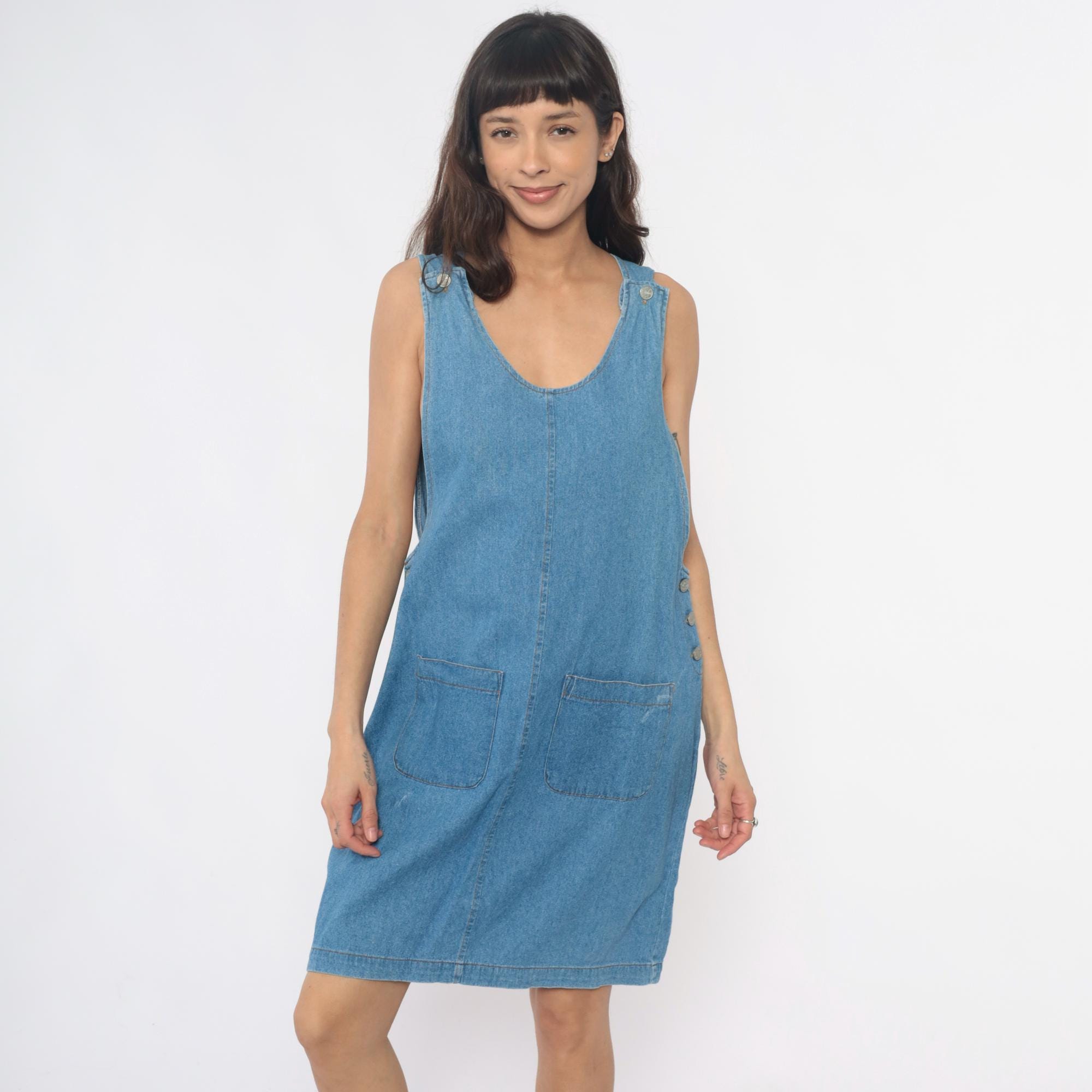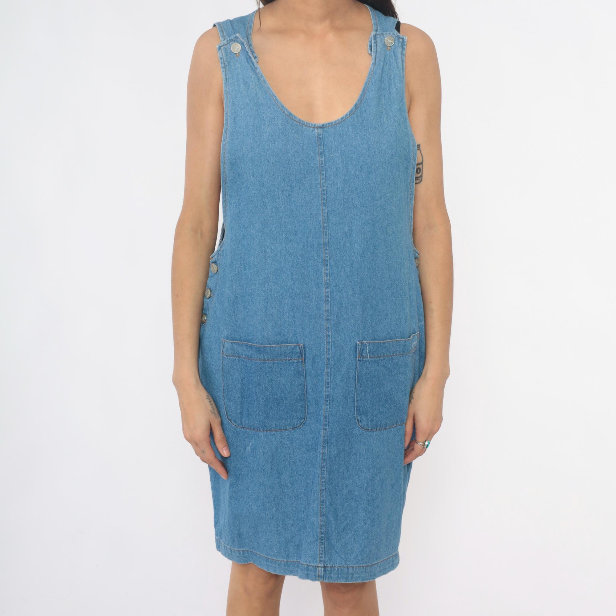 90s light blue denim dress from fads with scoop neckline and decorative metal buttons at the shoulders. Button closures run down each side of the dress, two front patch pockets at the hips.