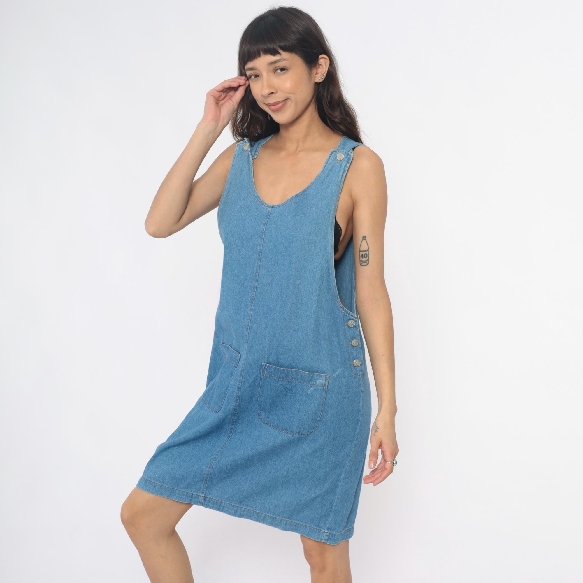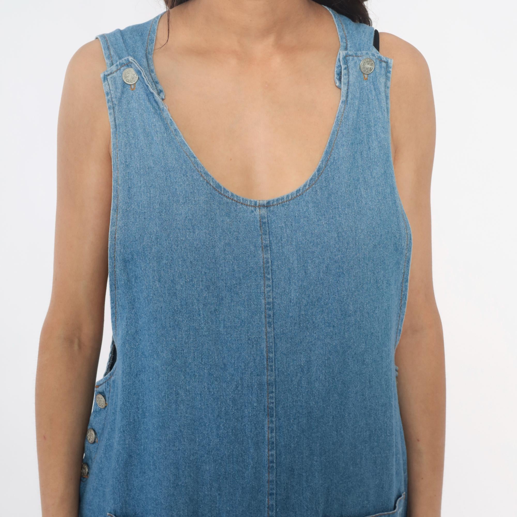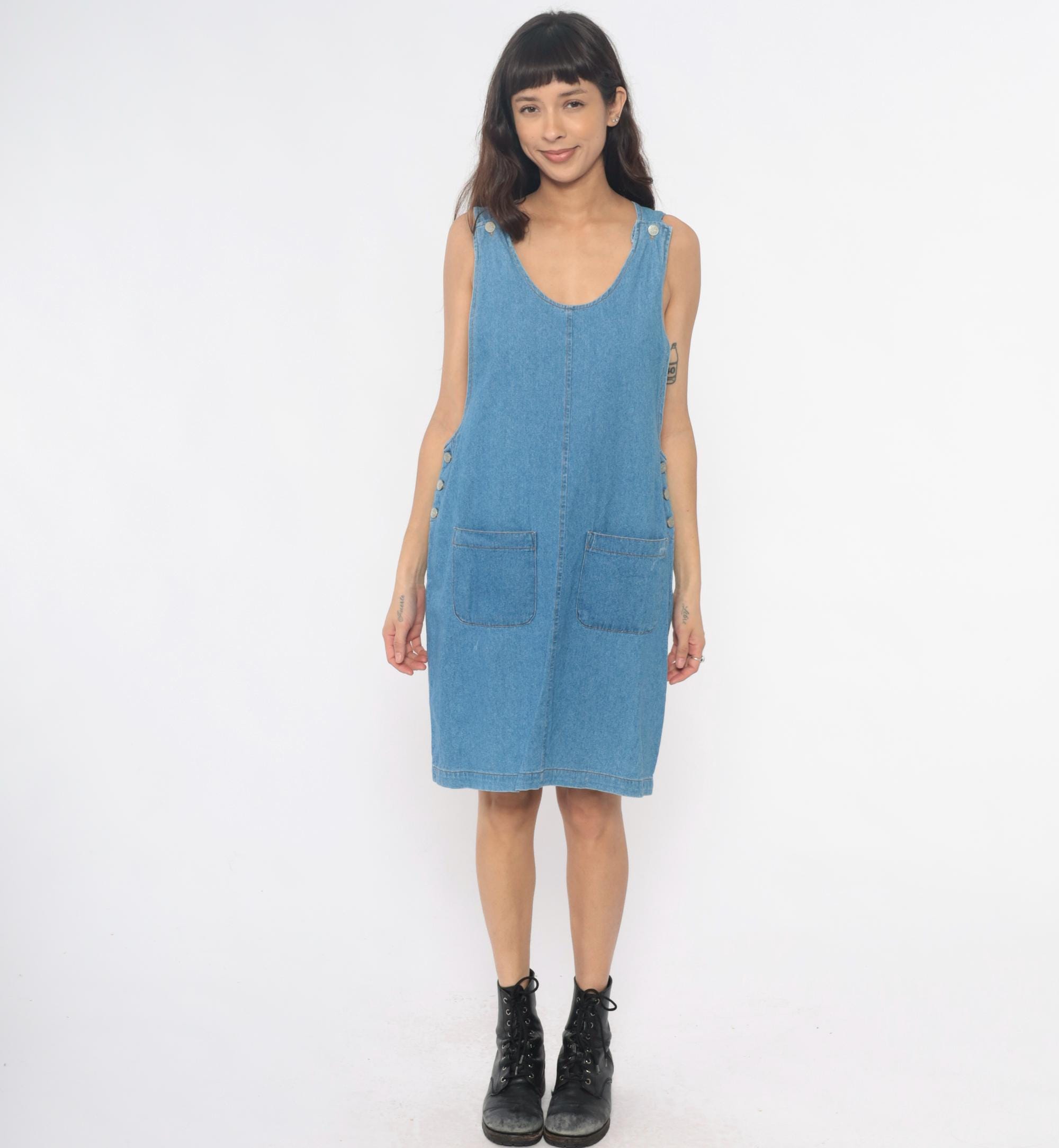 90s light blue denim dress from fads with scoop neckline and decorative metal buttons at the shoulders. Button closures run down each side of the dress, two front patch pockets at the hips.