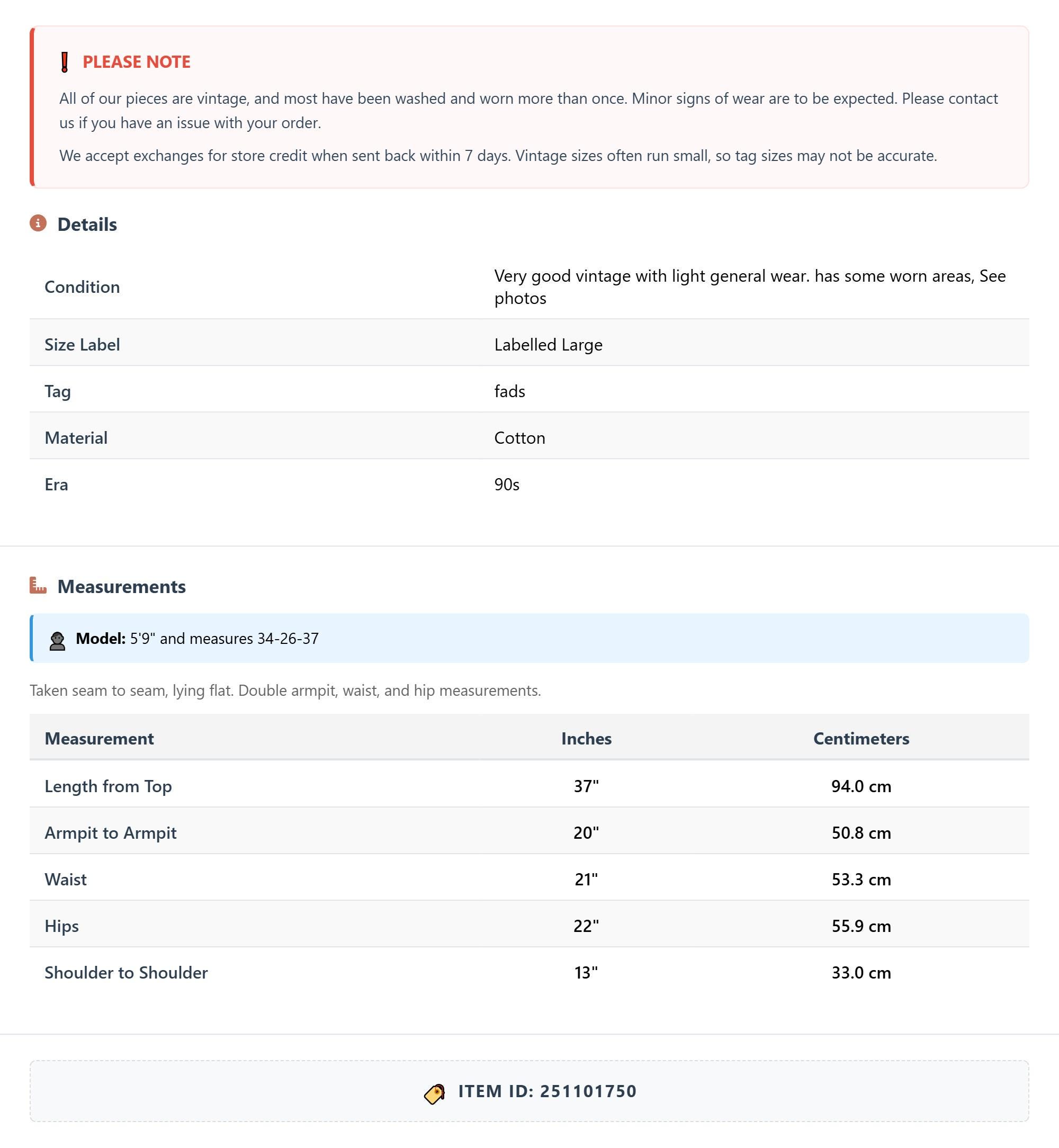 All of our pieces are vintage, and most have been washed and worn more than once. Minor signs of wear are to be expected. Please contact us if you have an issue with your order. We accept exchanges for store credit when sent back within 7 days.