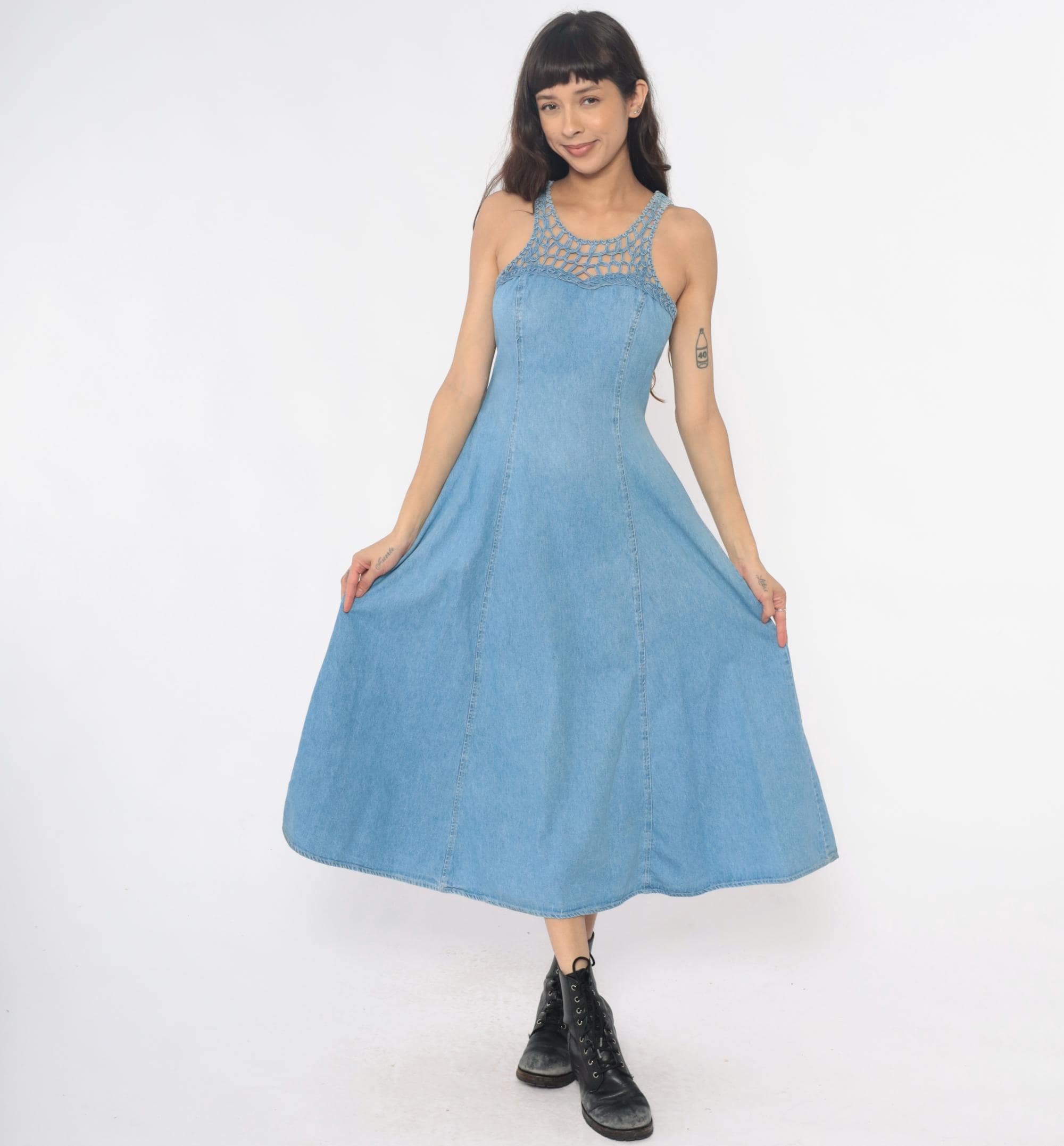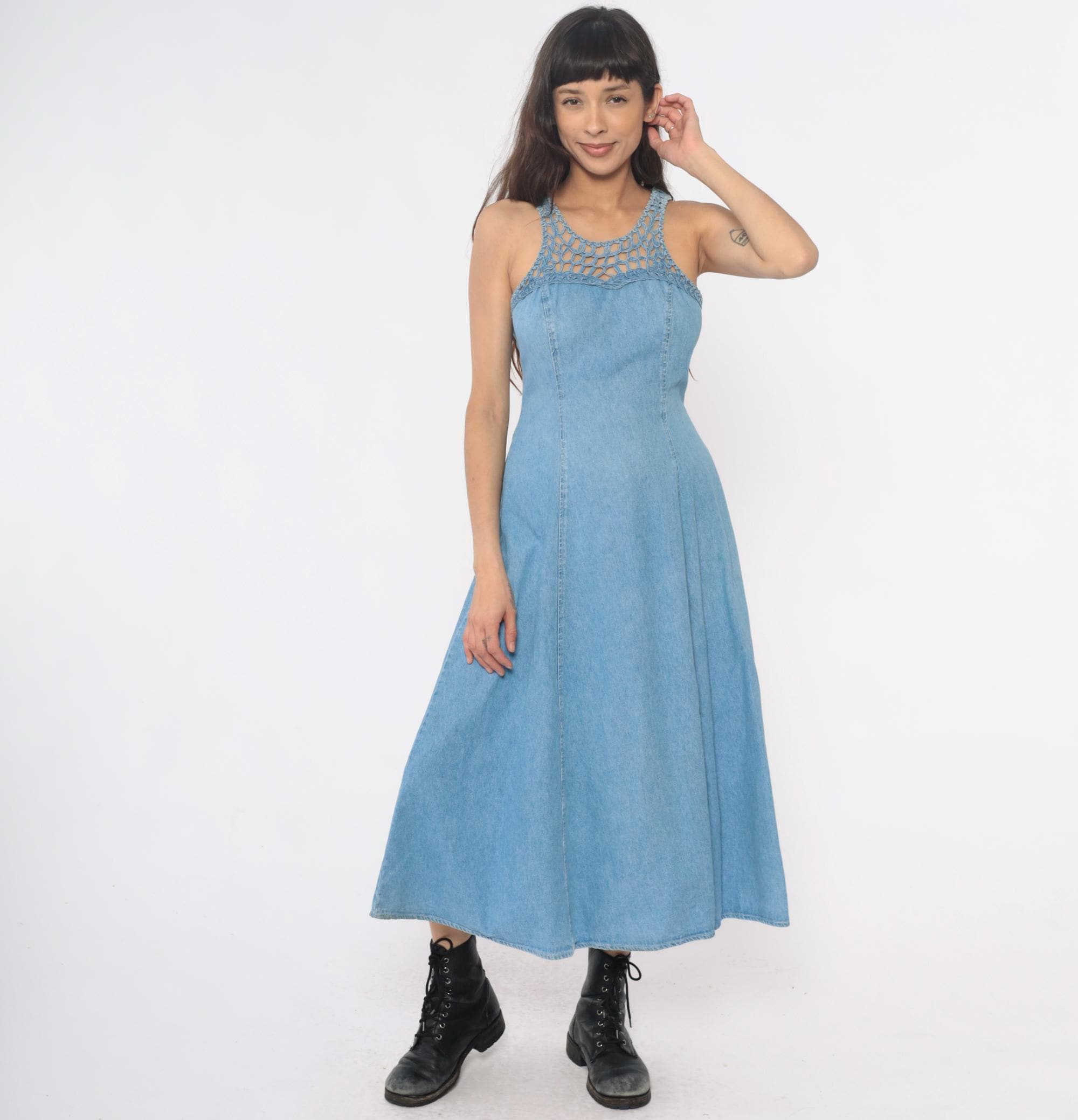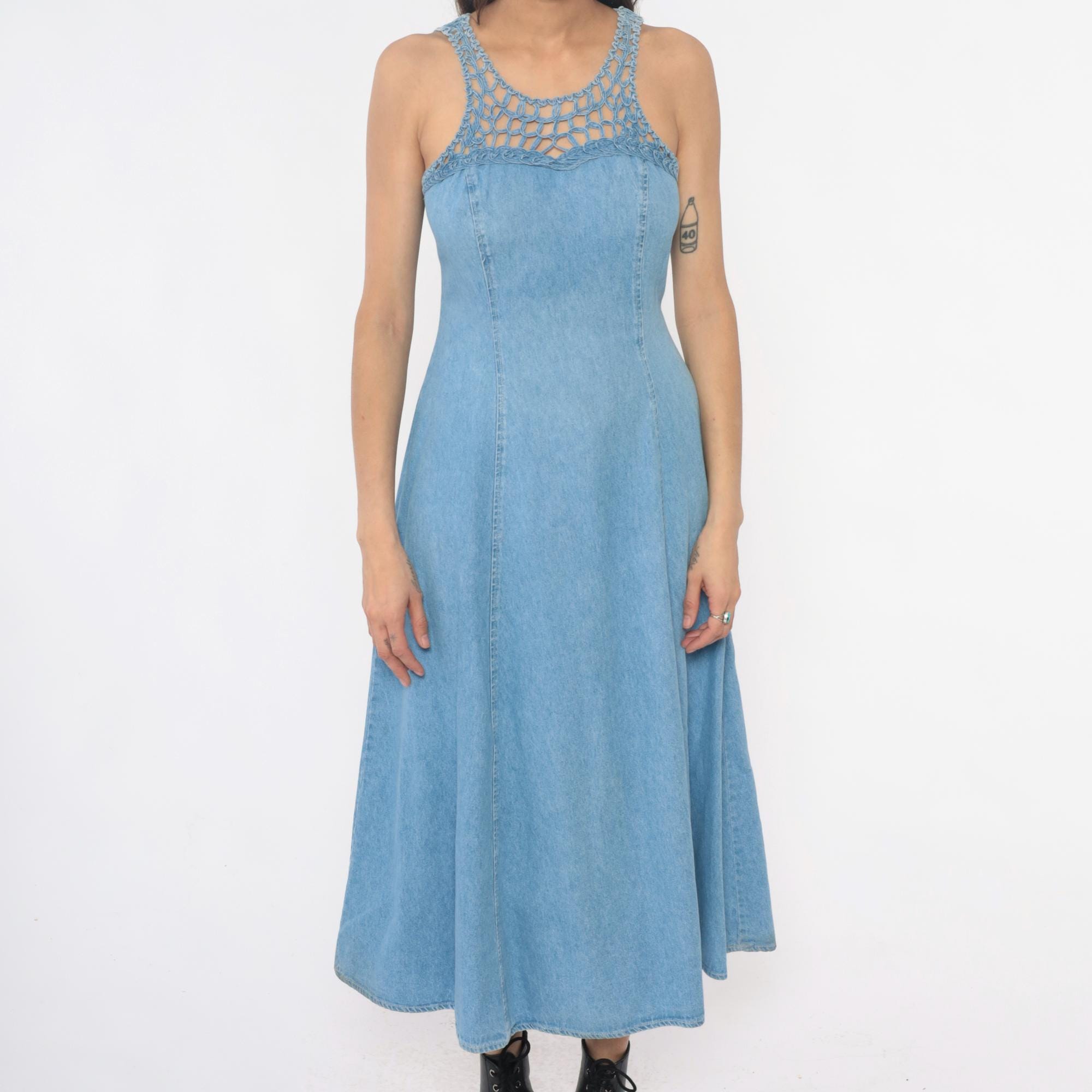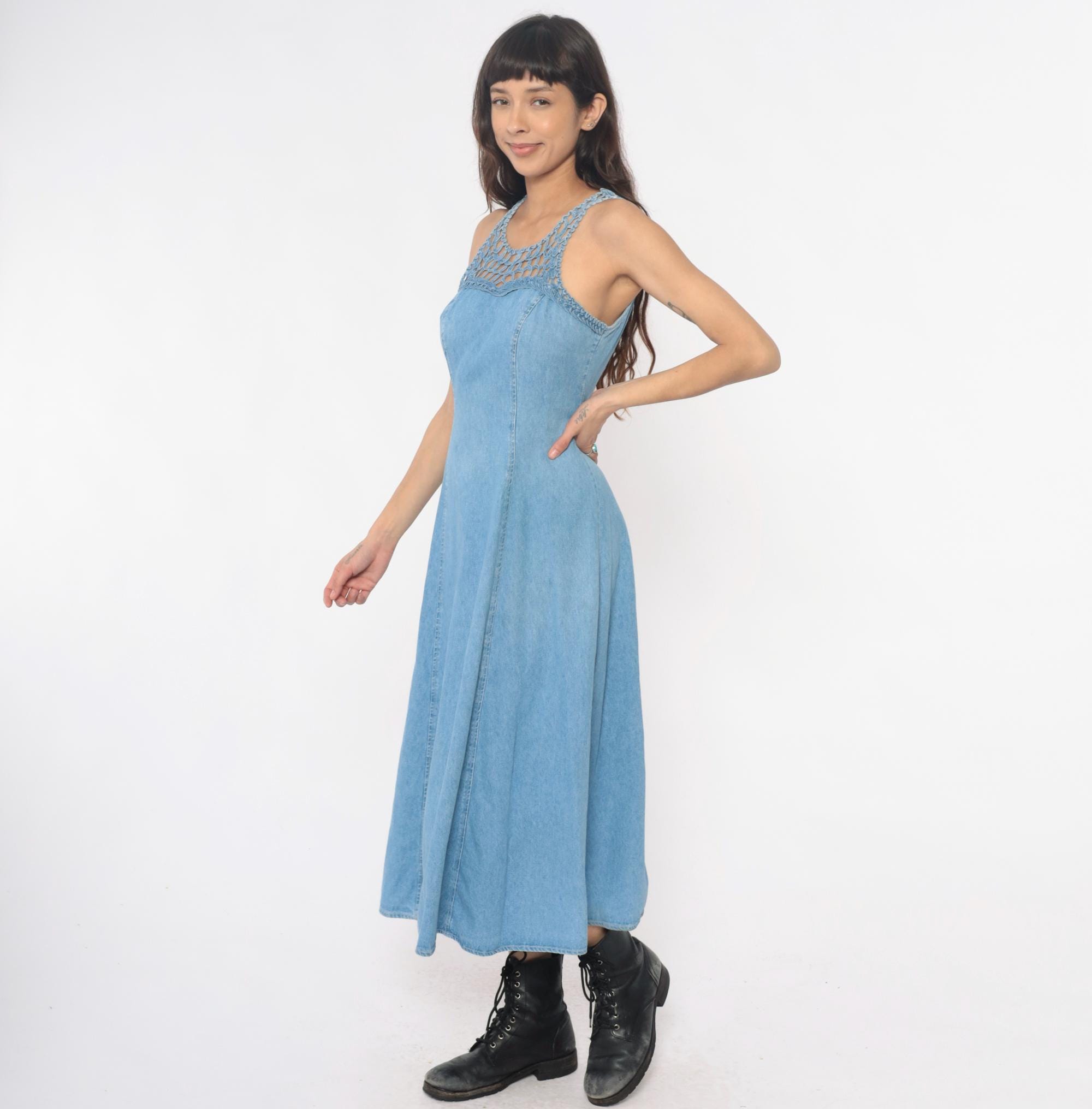 90s light blue denim maxi dress from jody california with crochet macramé neckline and racerback sleeves. Back zipper closure with corset-style lacing at waist. A-line skirt with full-length hem.