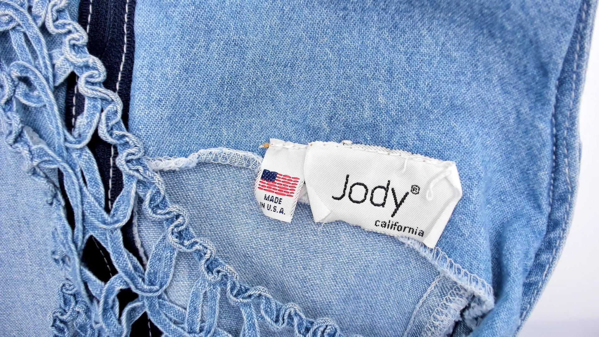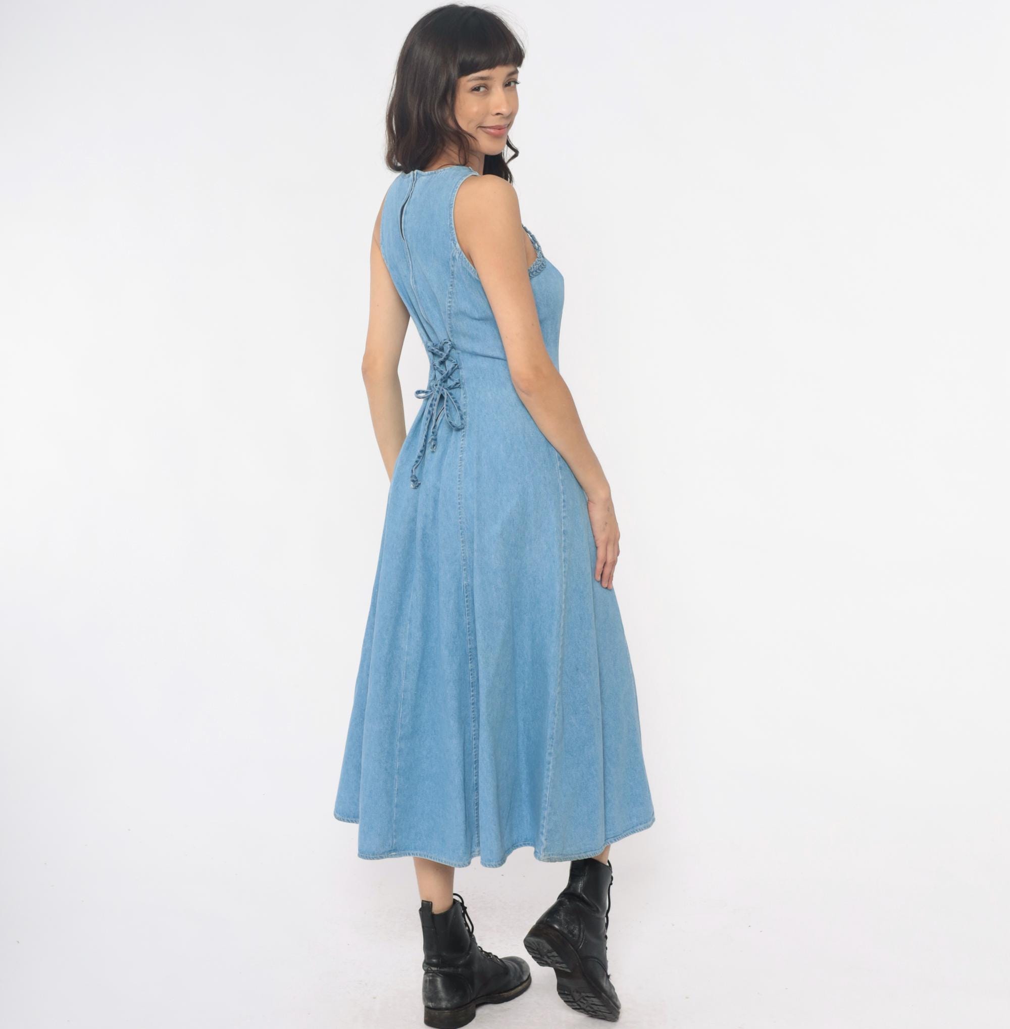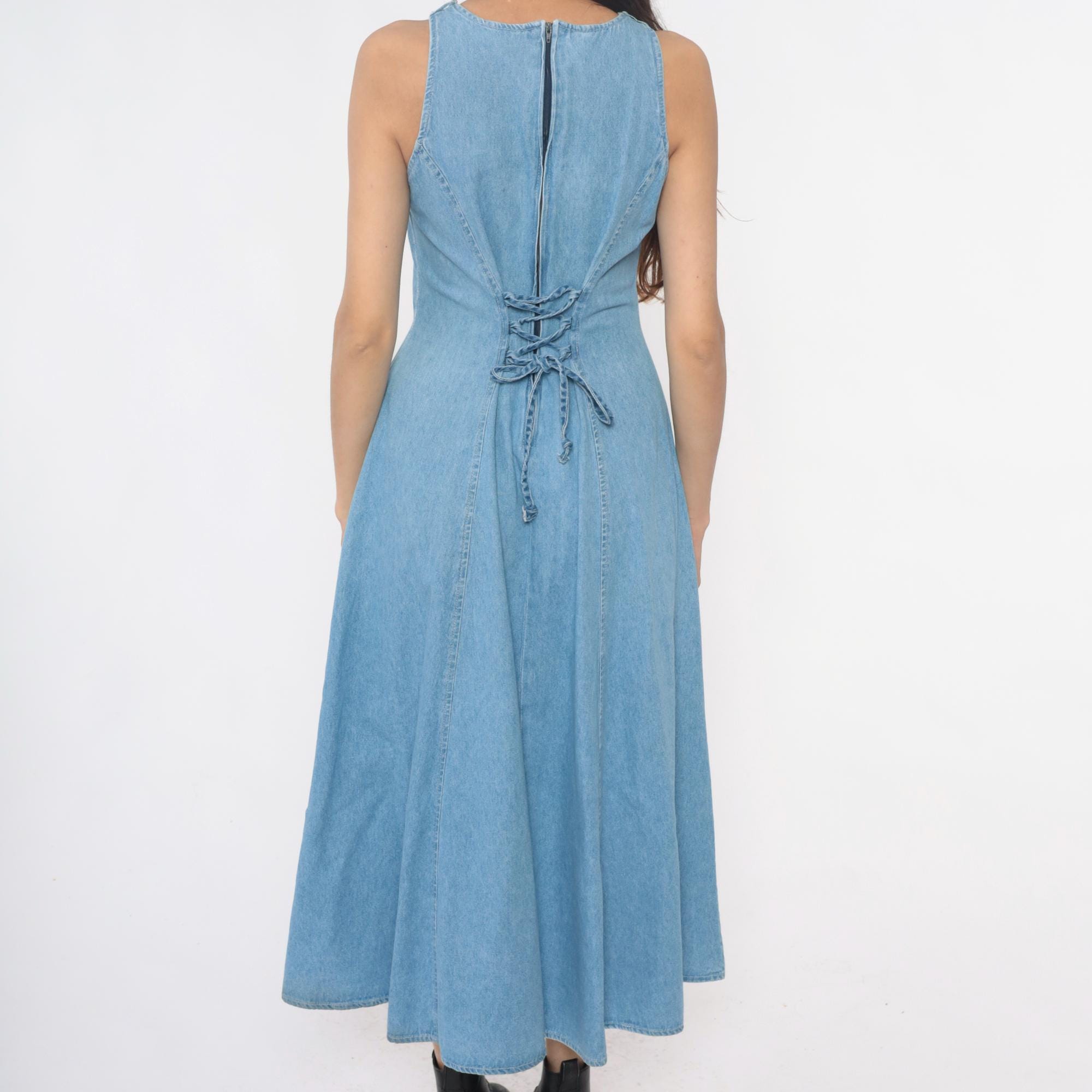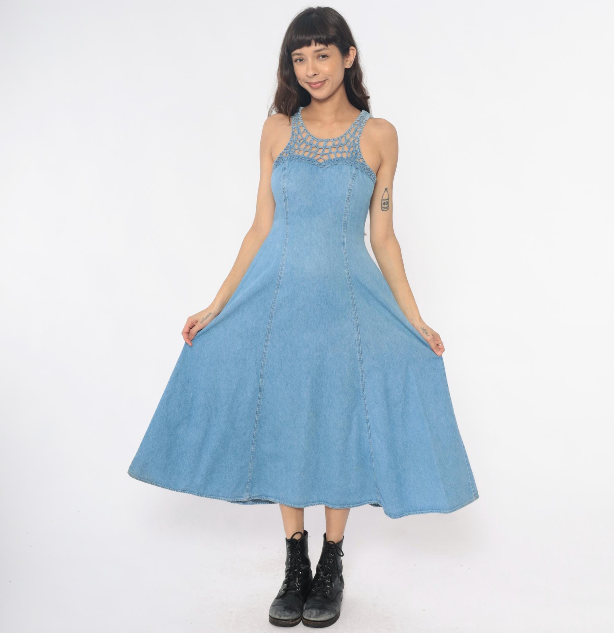 90s light blue denim maxi dress from jody california with crochet macramé neckline and racerback sleeves. Back zipper closure with corset-style lacing at waist. A-line skirt with full-length hem.