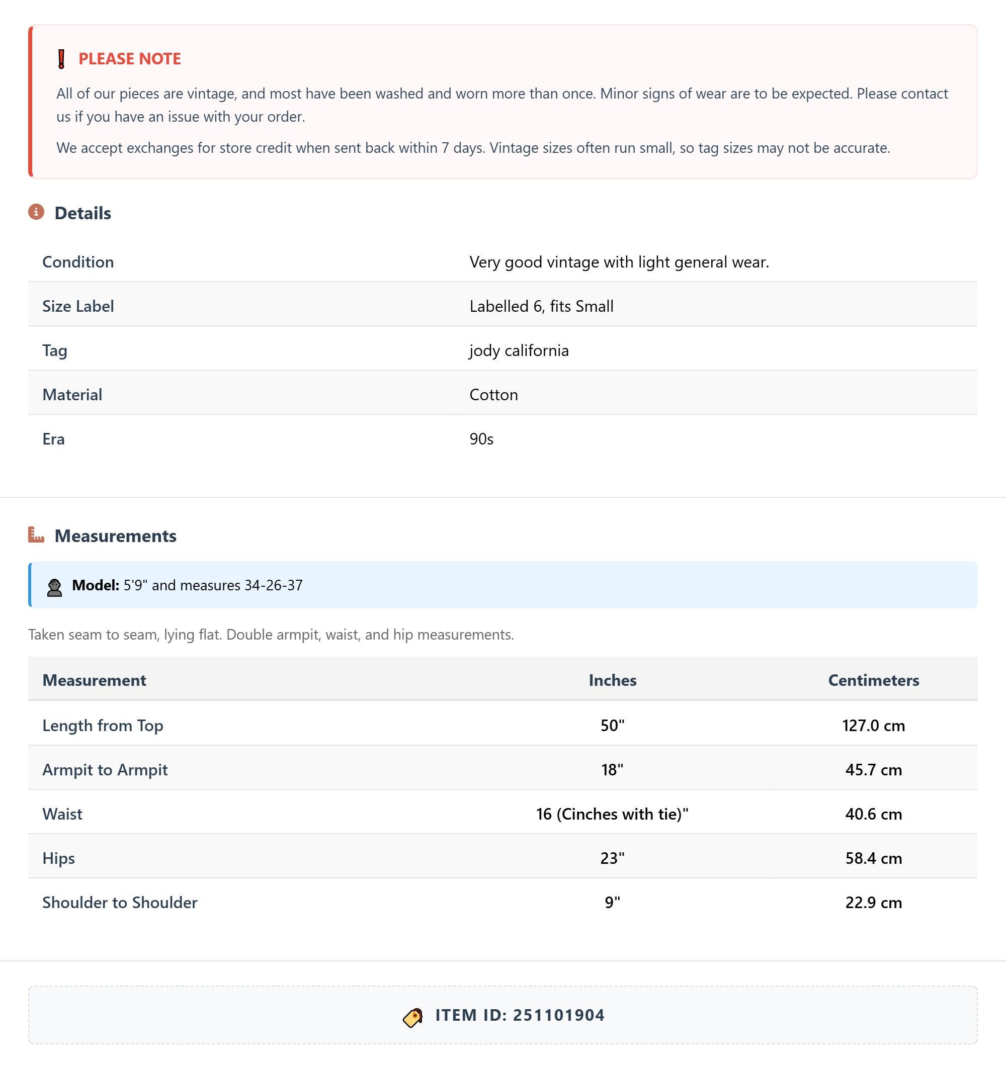 All of our pieces are vintage, and most have been washed and worn more than once. Minor signs of wear are to be expected. Please contact us if you have an issue with your order. We accept exchanges for store credit when sent back within 7 days.