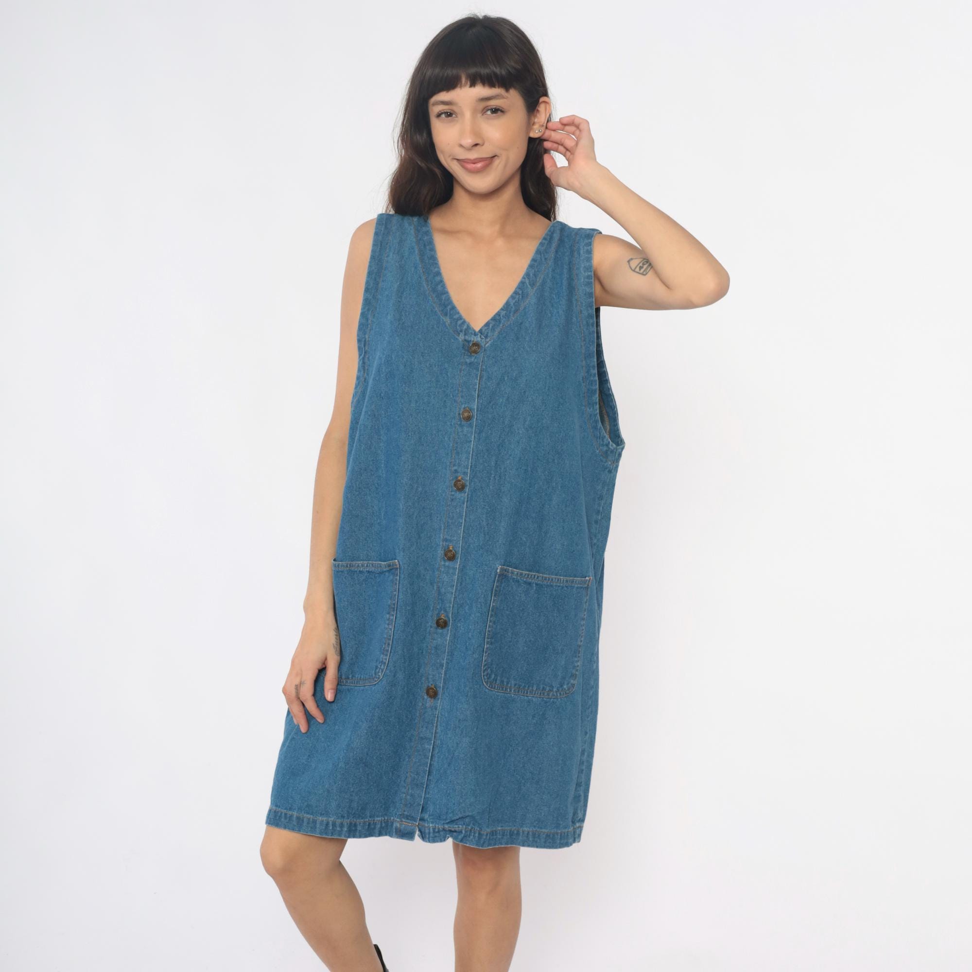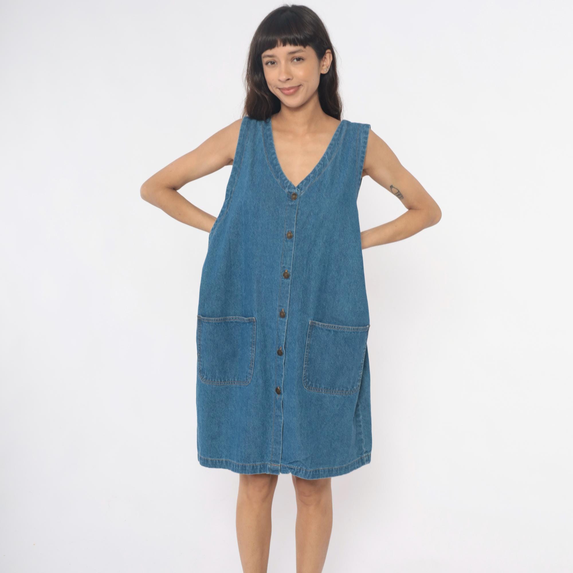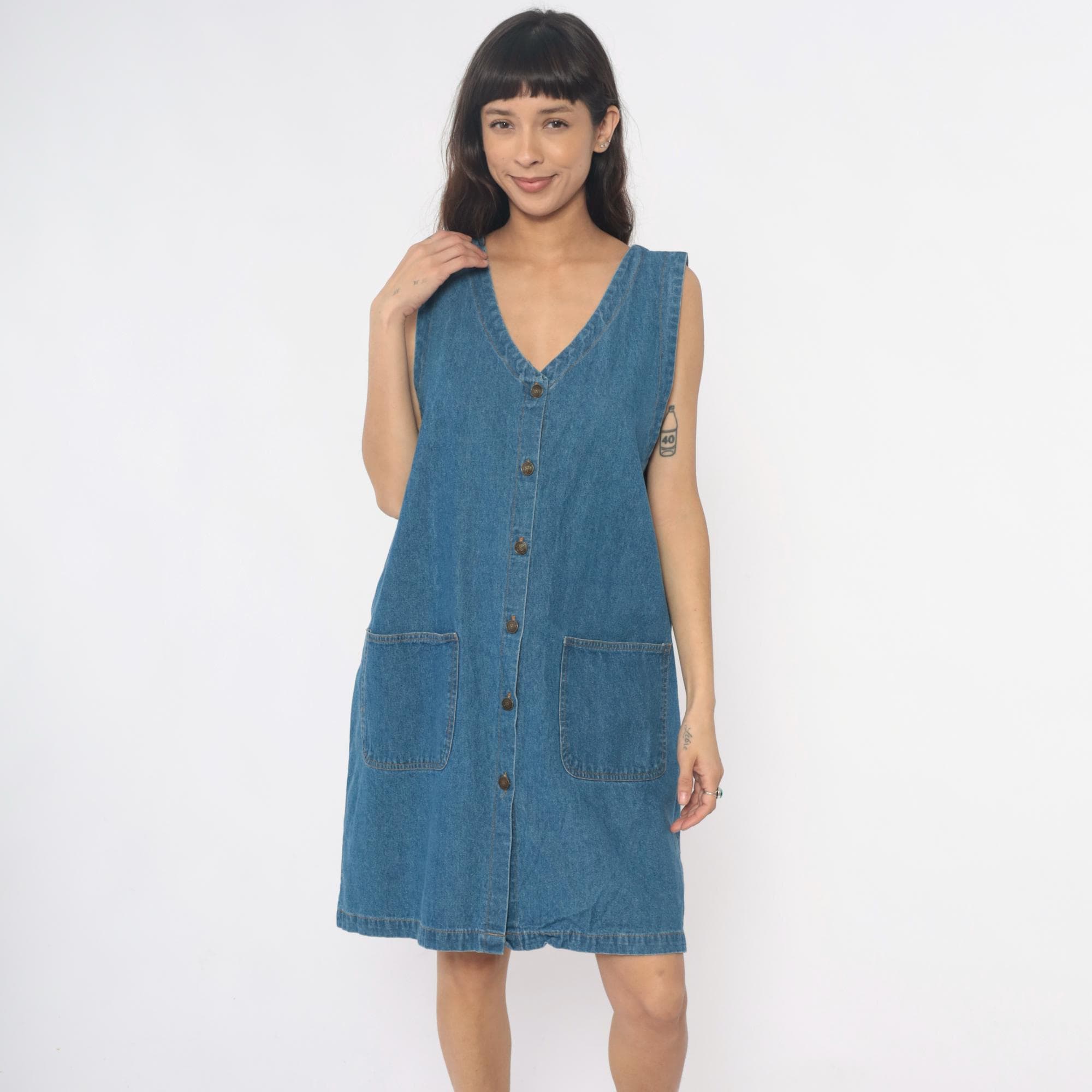 90s denim dress from Laura Katherine with V-neckline and full button front closure. Sleeveless with two front patch pockets. Medium blue wash throughout.
