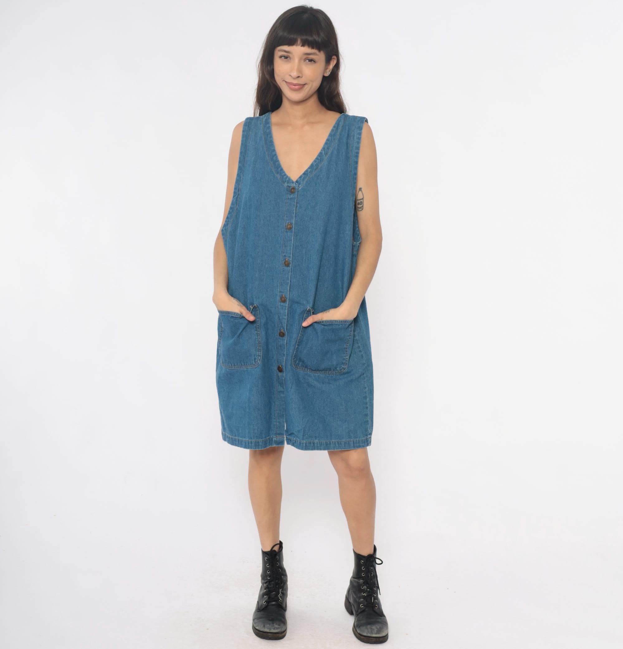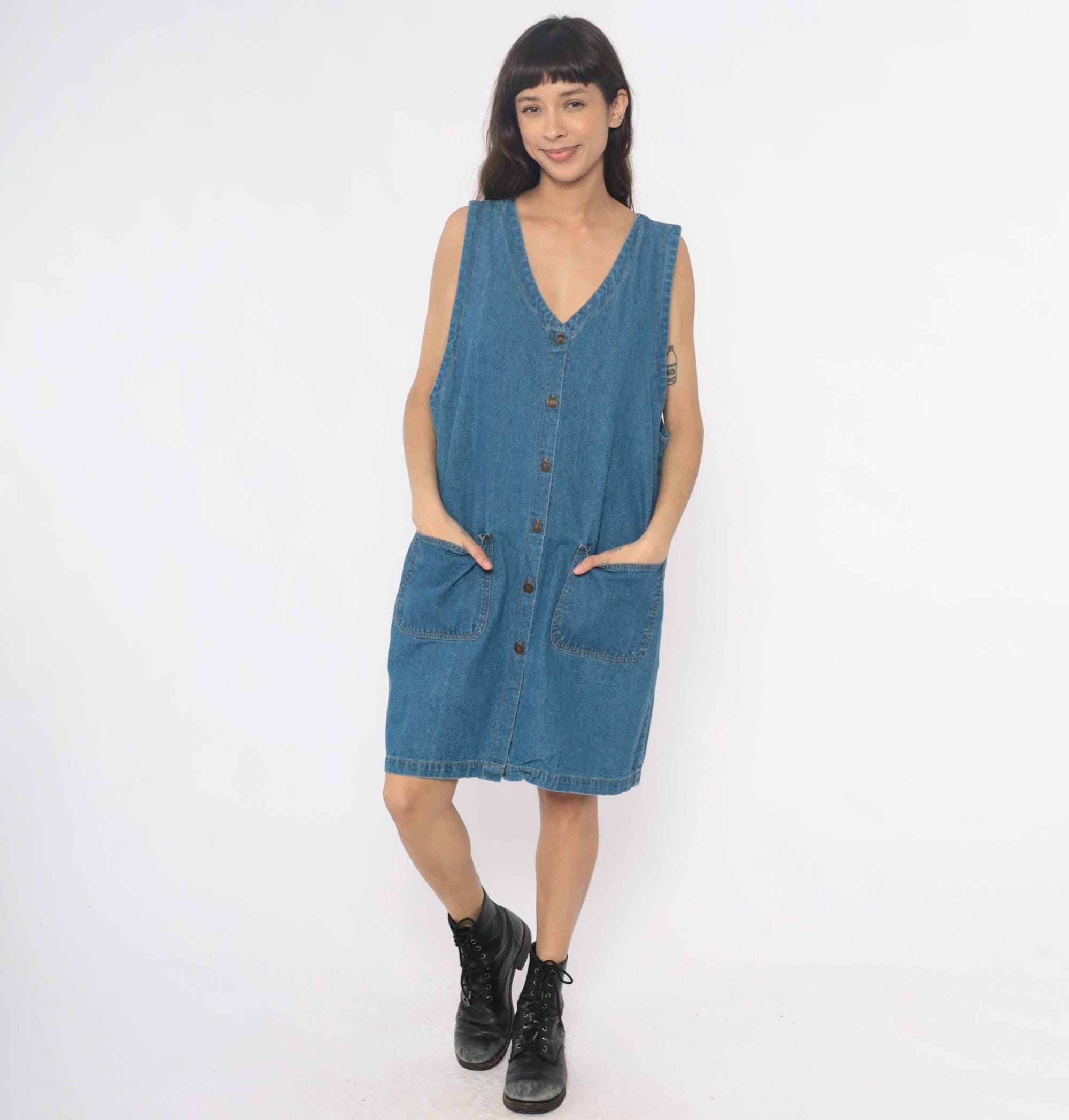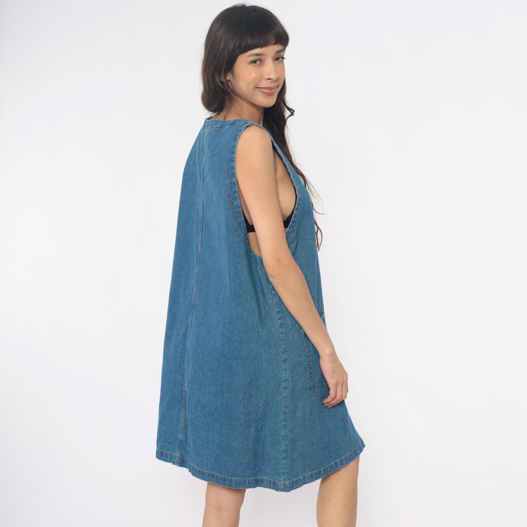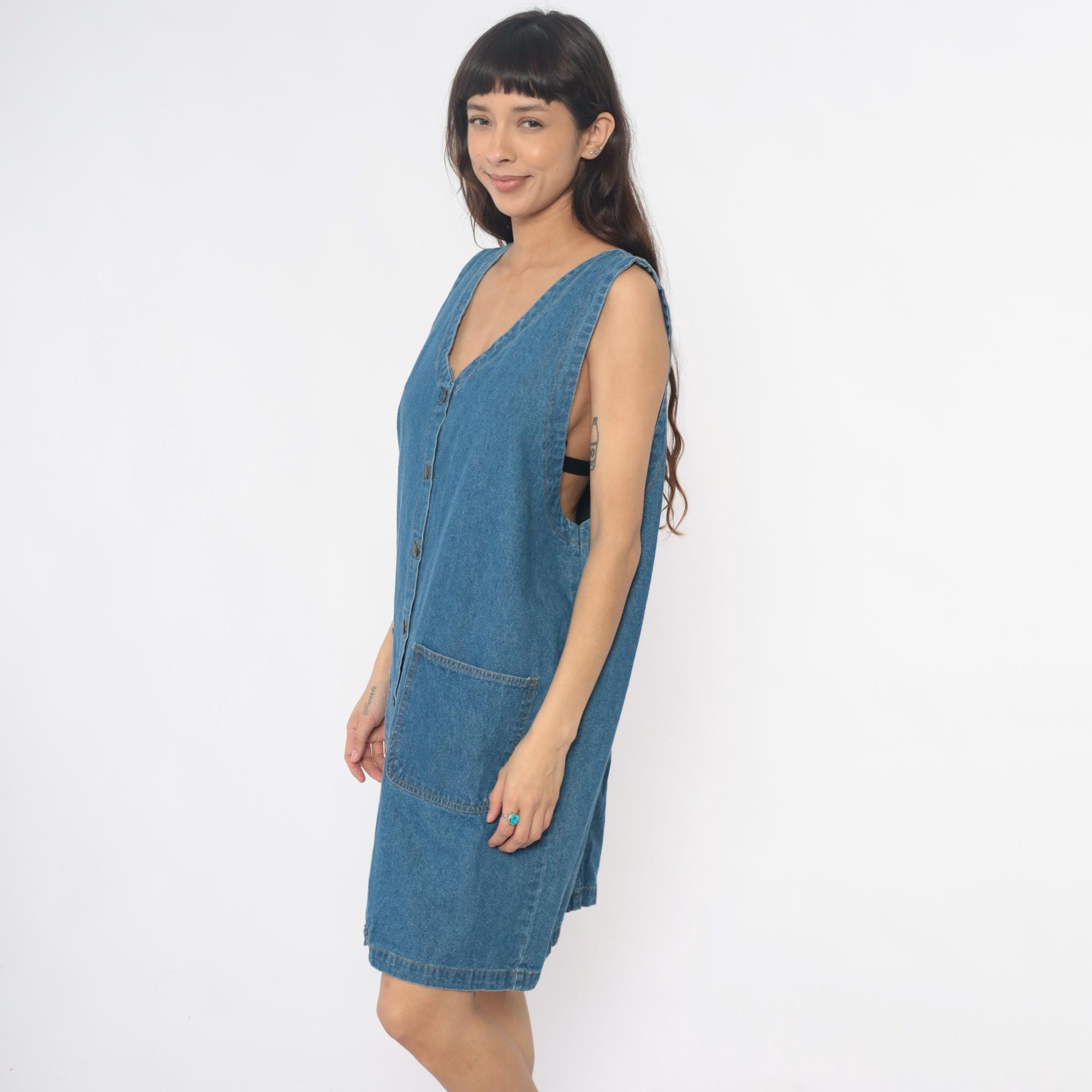 90s denim dress from Laura Katherine with V-neckline and full button front closure. Sleeveless with two front patch pockets. Medium blue wash throughout.