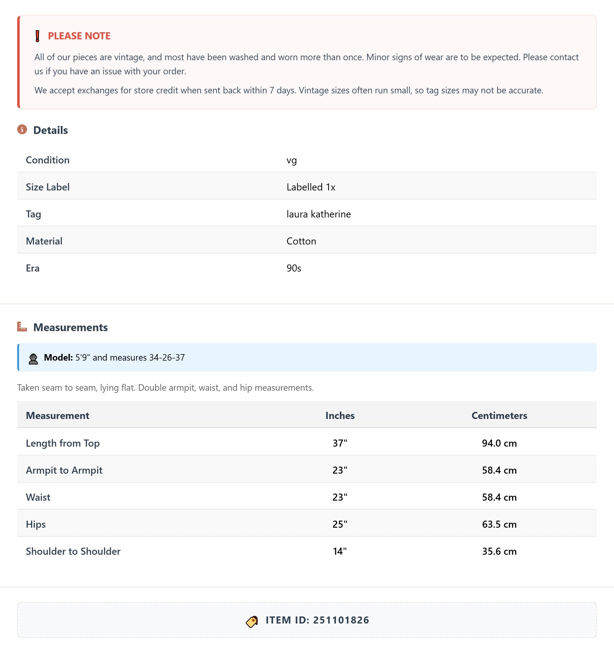 All of our pieces are vintage, and most have been washed and worn more than once. Minor signs of wear are to be expected. Please contact us if you have an issue with your order. We accept exchanges for store credit when sent back within 7 days.