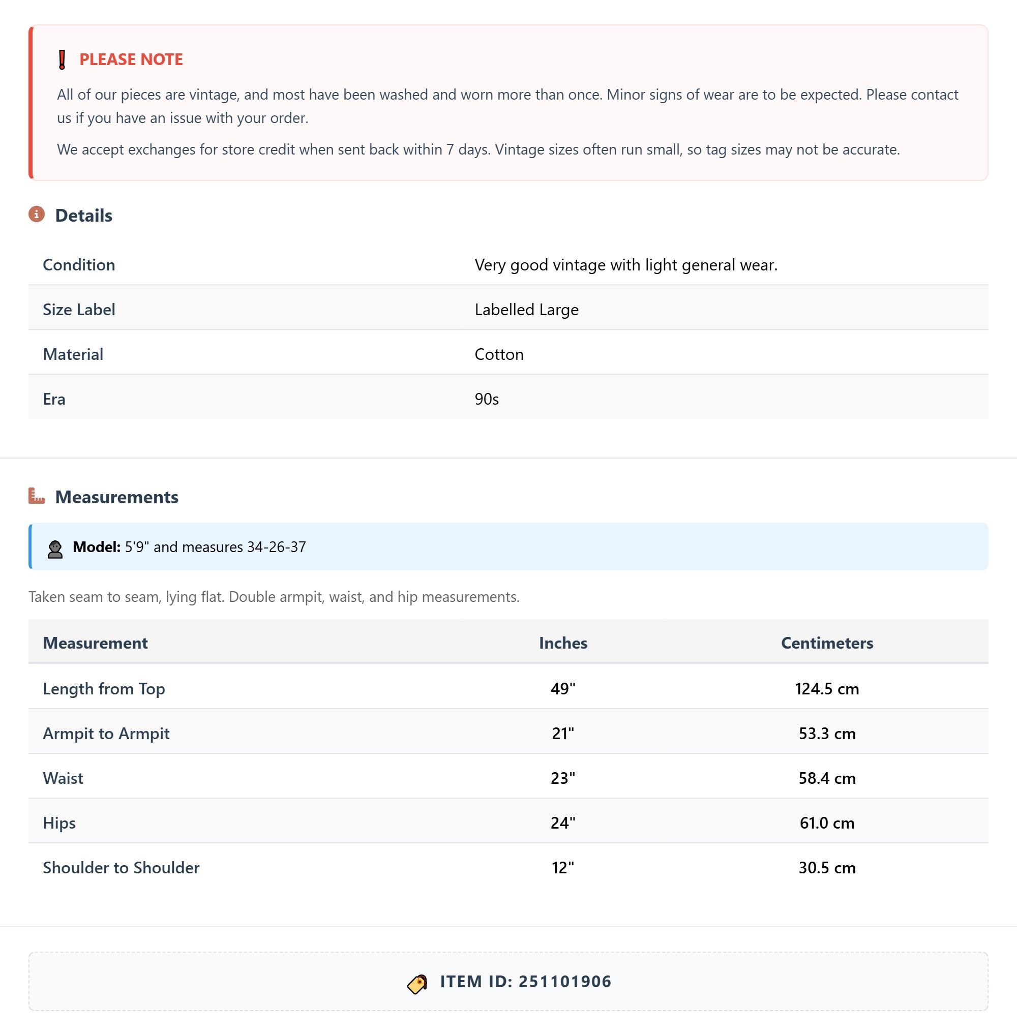 All of our pieces are vintage, and most have been washed and worn more than once. Minor signs of wear are to be expected. Please contact us if you have an issue with your order. We accept exchanges for store credit when sent back within 7 days.