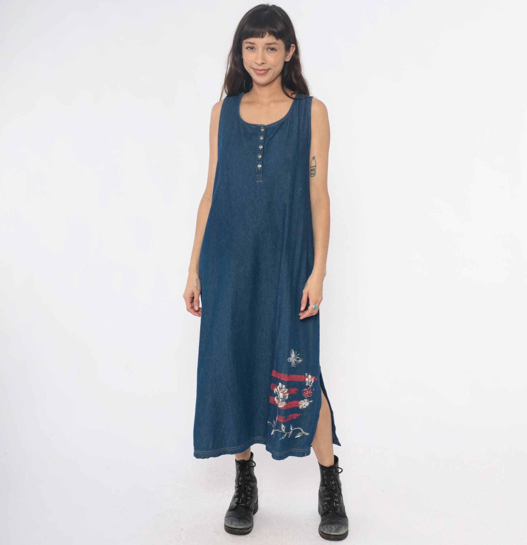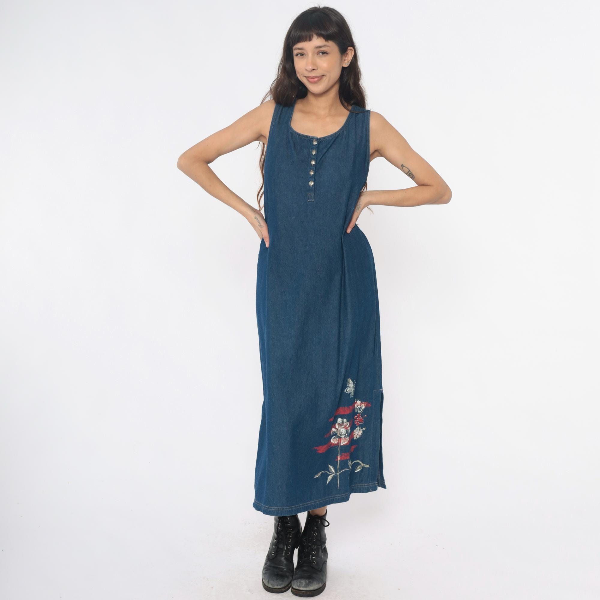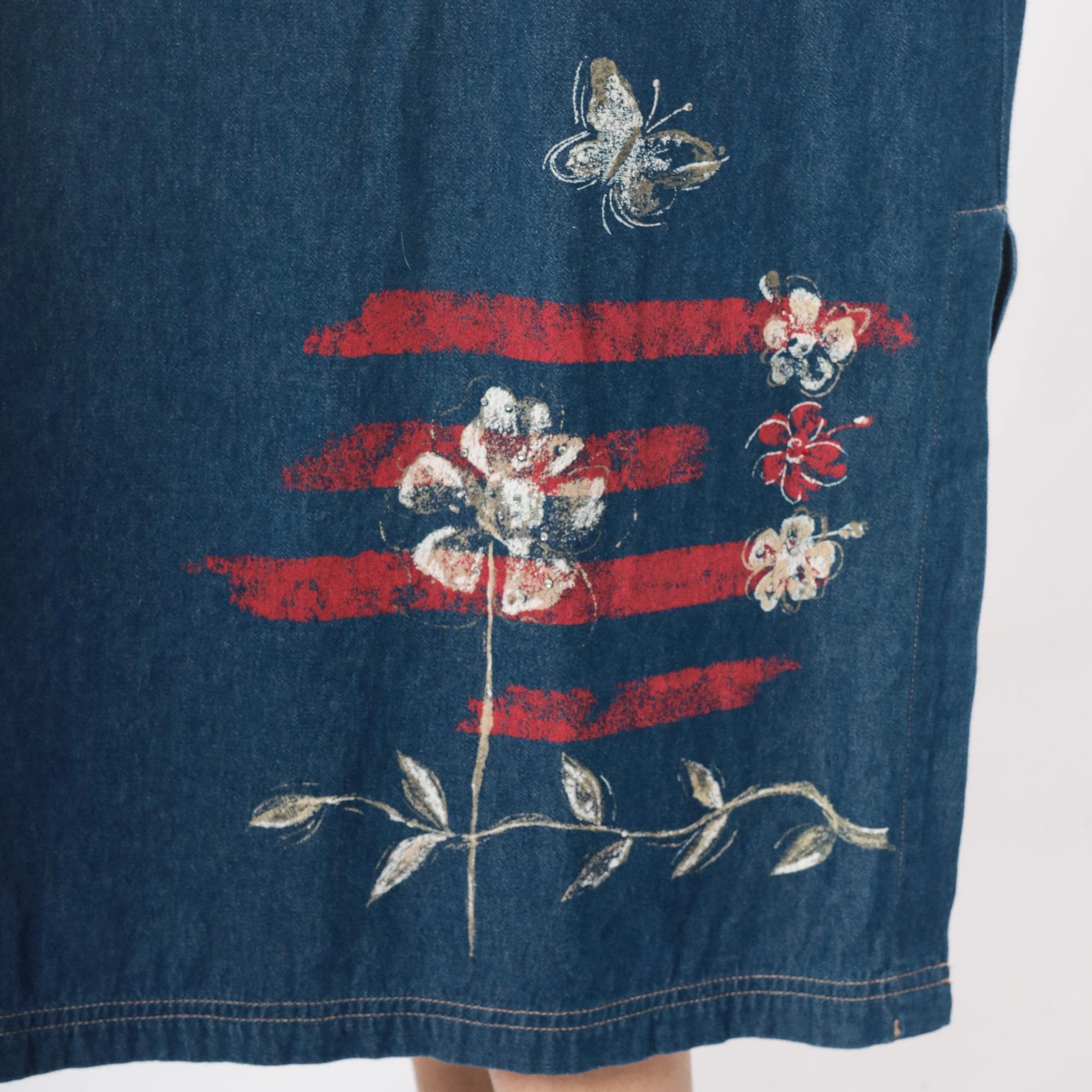 90s blue denim maxi dress with sleeveless tank silhouette and scoop neckline. Button placket at center front, loose straight column fit. Painted floral design on lower left front with red horizontal stripes, cream and white flowers, butterfly motif, and vine details.
