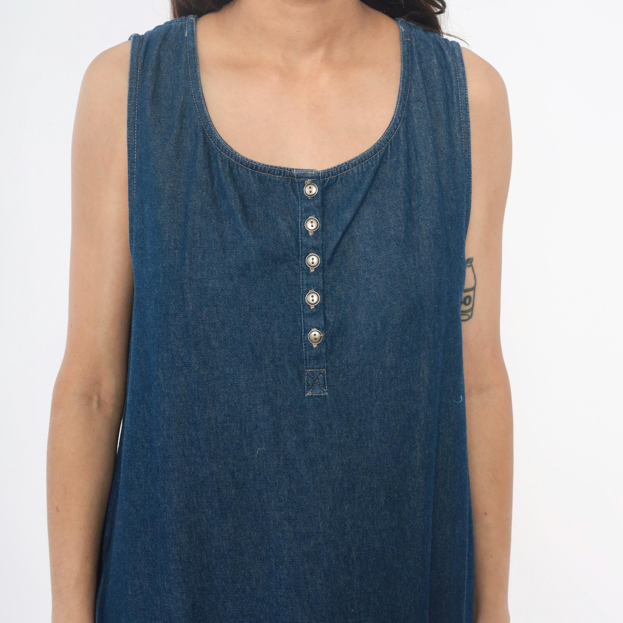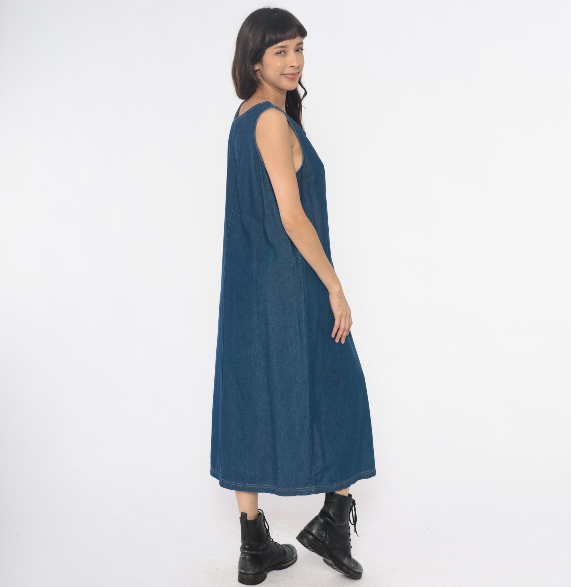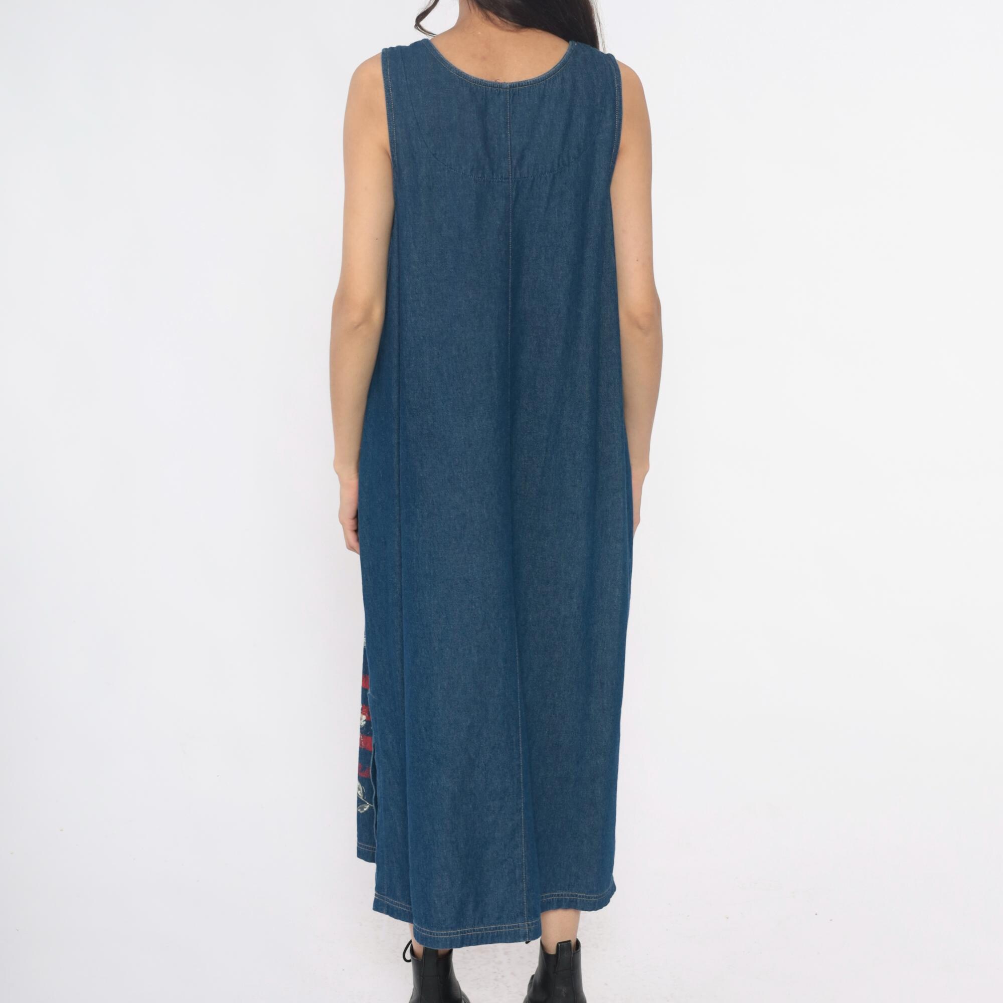 90s blue denim maxi dress with sleeveless tank silhouette and scoop neckline. Button placket at center front, loose straight column fit. Painted floral design on lower left front with red horizontal stripes, cream and white flowers, butterfly motif, and vine details.