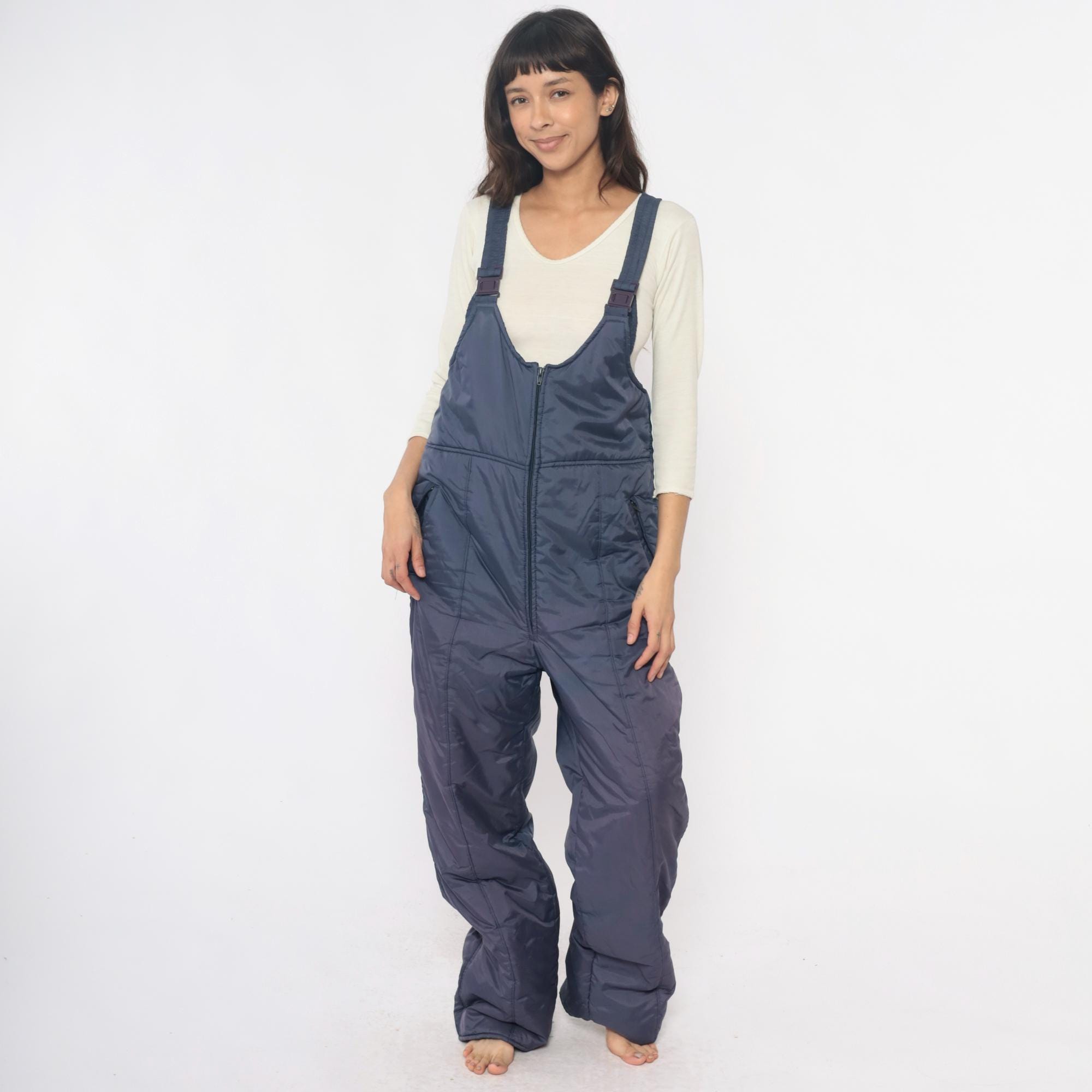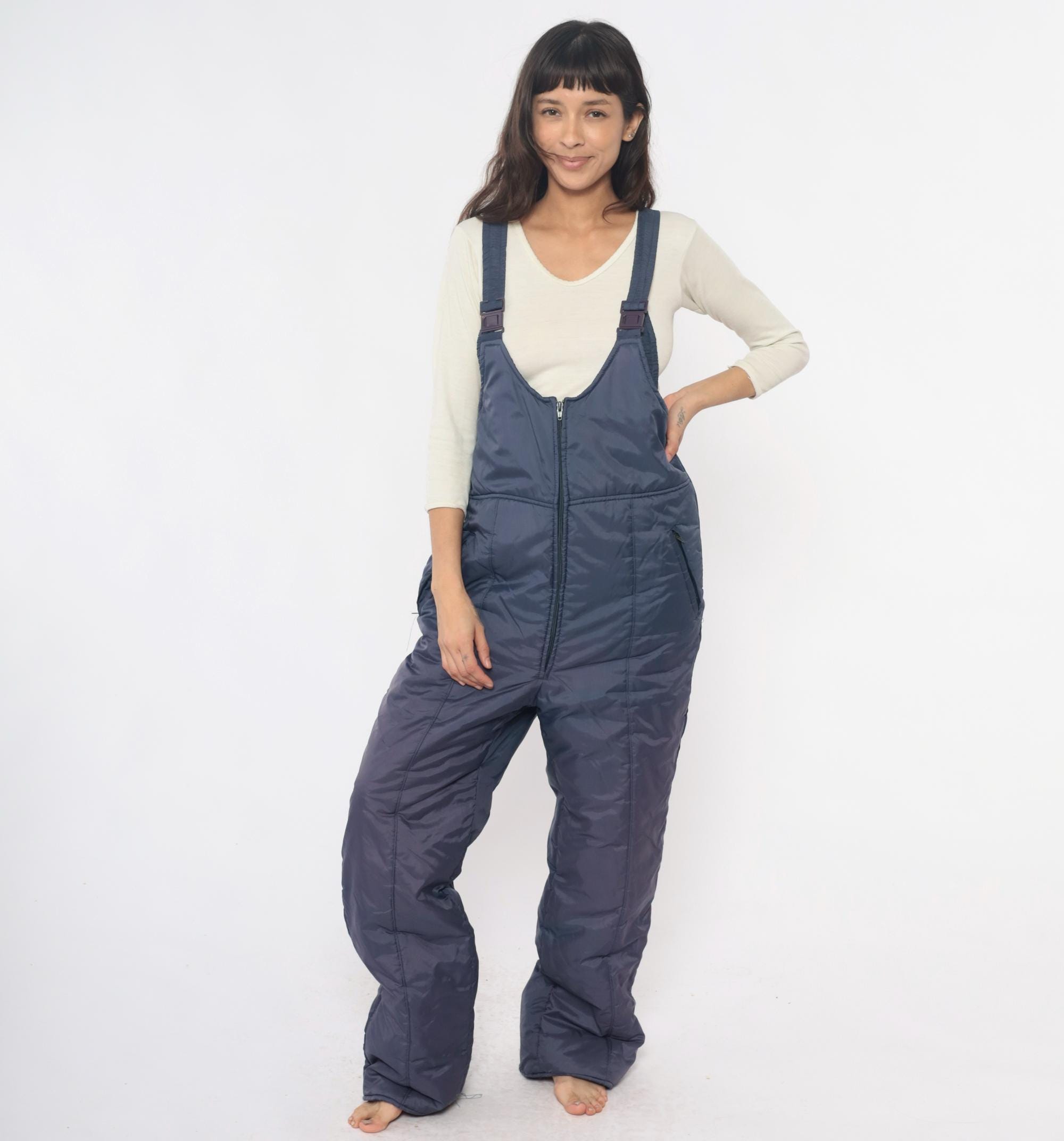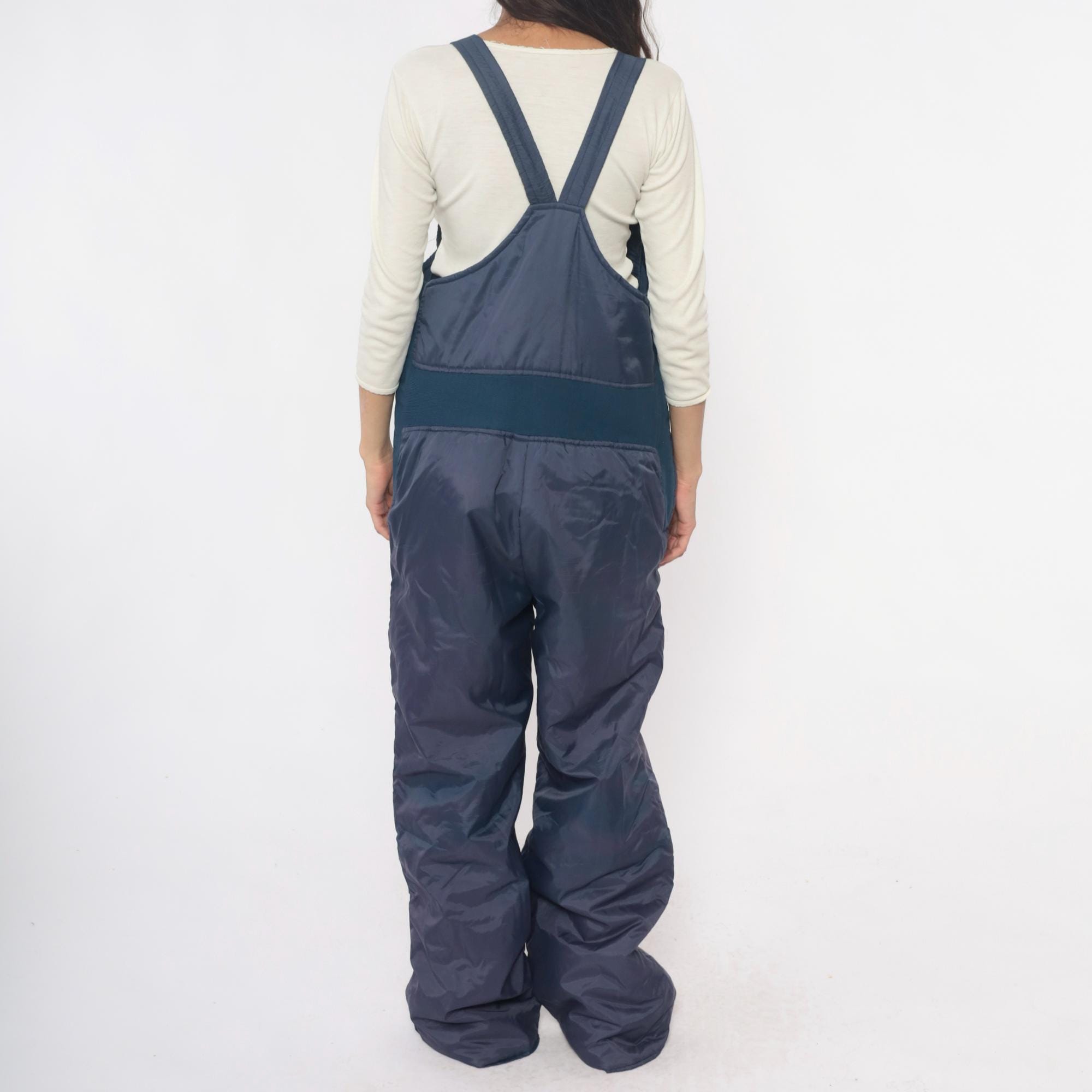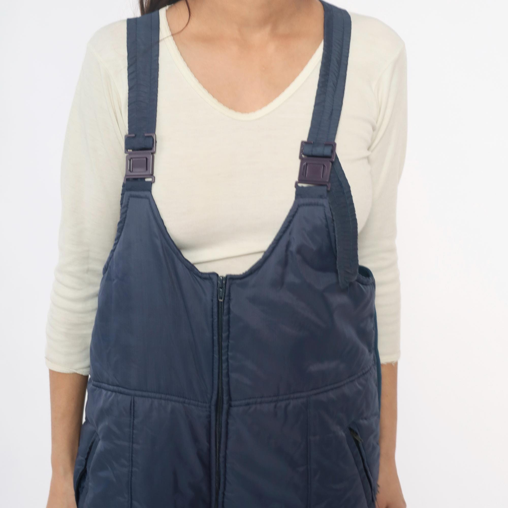 80s navy ski bib overalls from Sunshine Mountain with adjustable shoulder straps with clip buckles and full front zipper closure on high-waist bib. Side seam pockets, elastic band at back waist, wide straight legs.