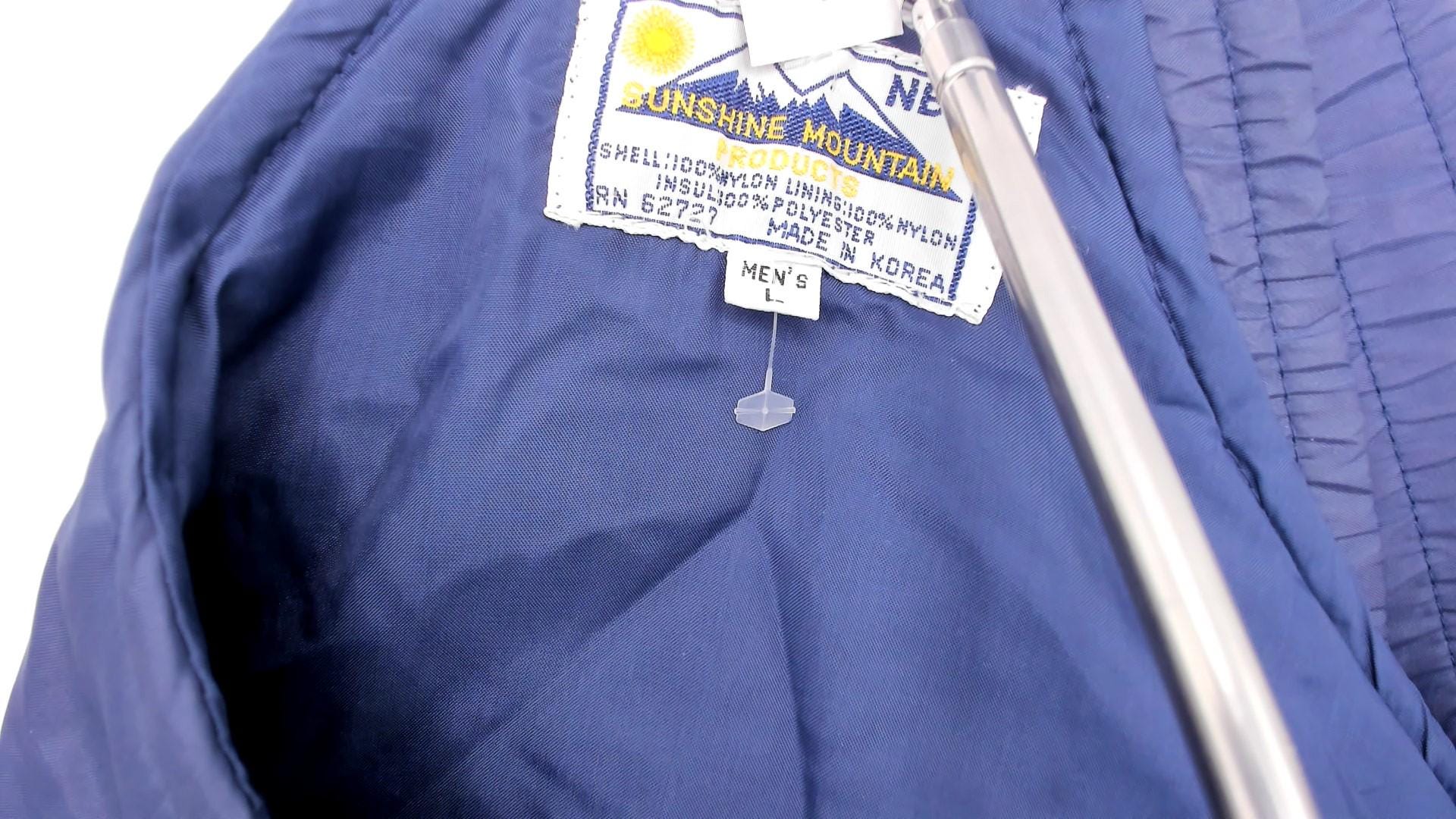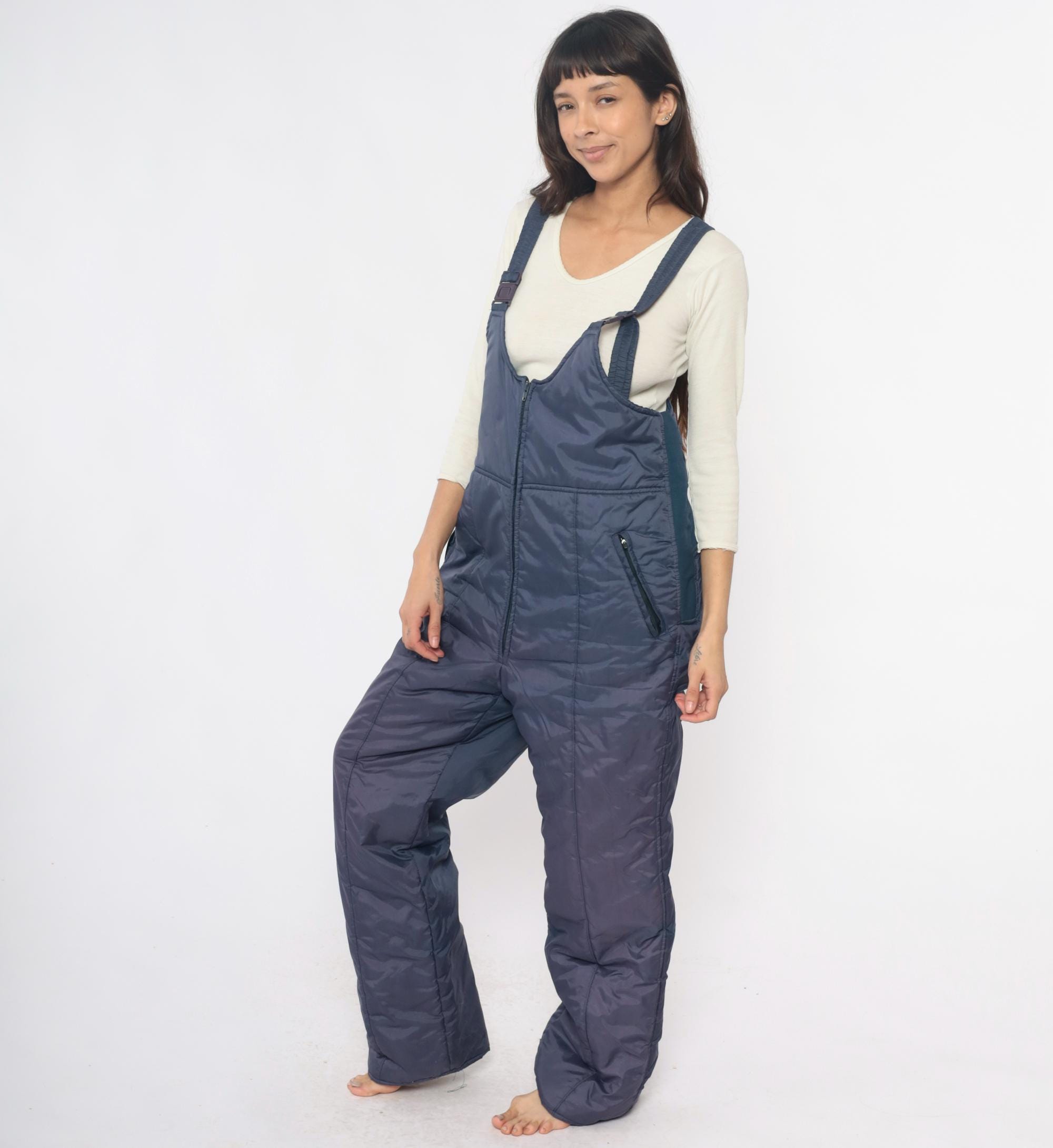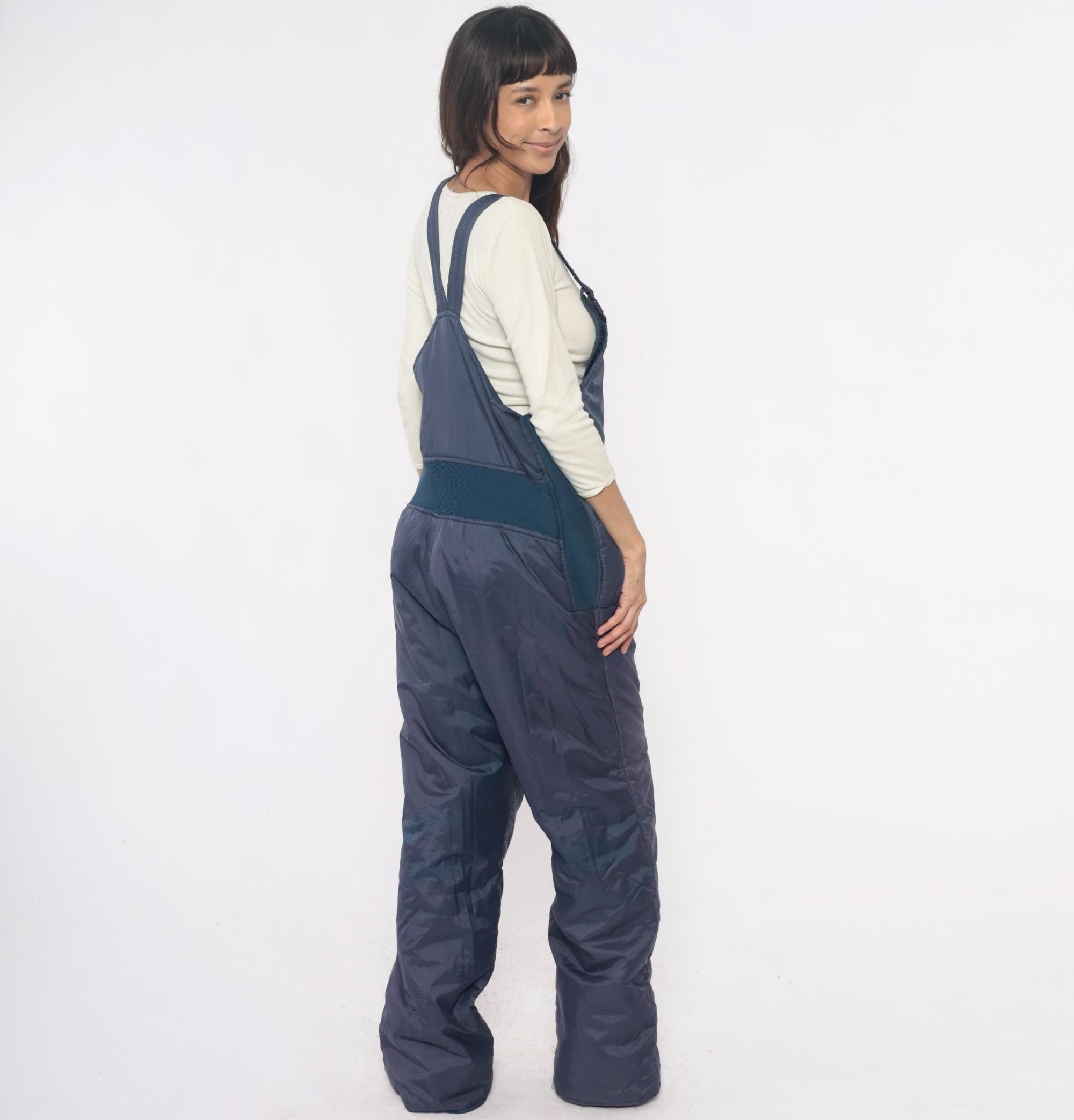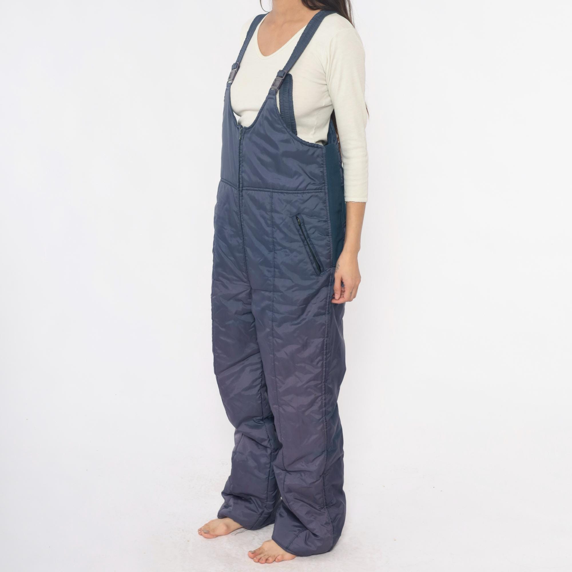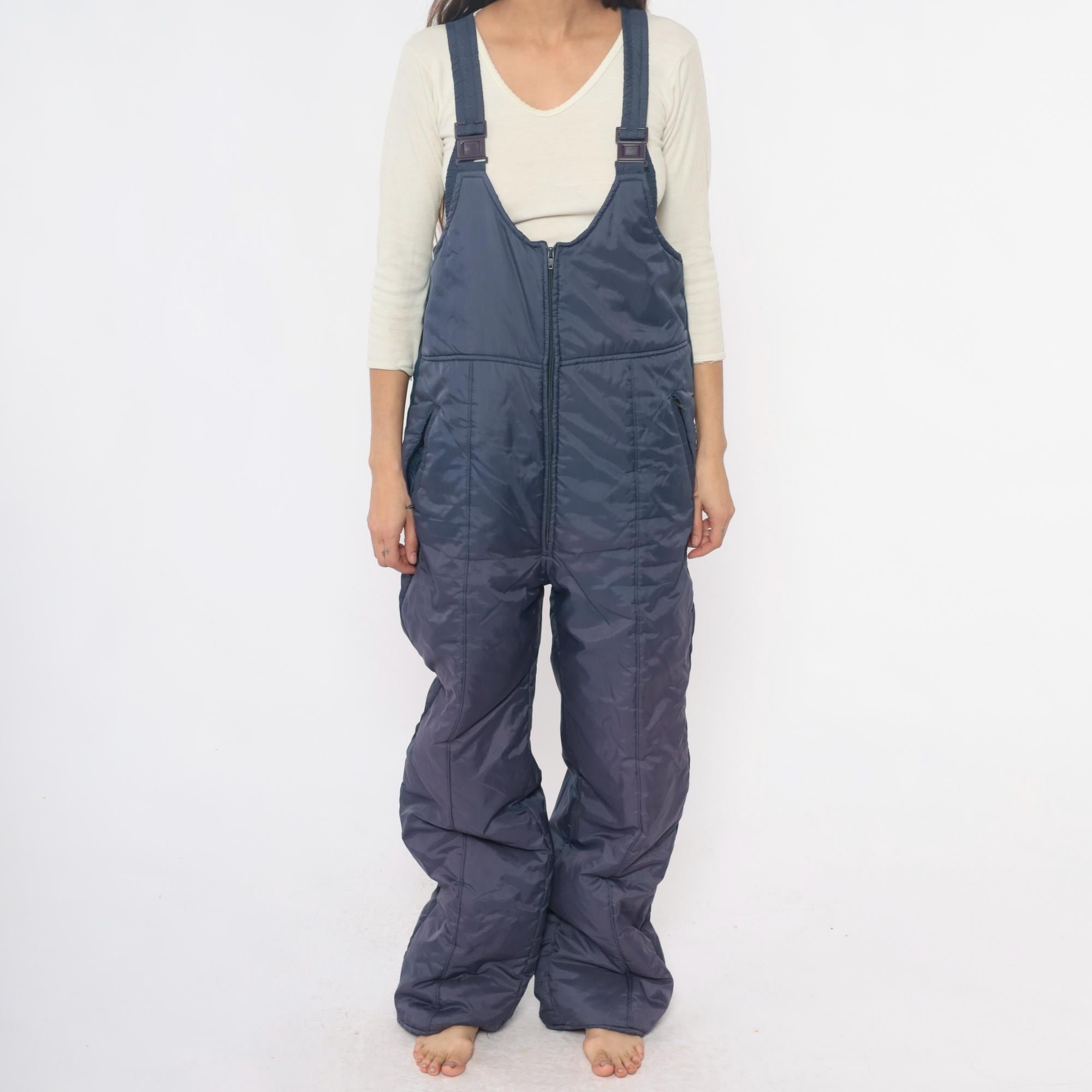 80s navy ski bib overalls from Sunshine Mountain with adjustable shoulder straps with clip buckles and full front zipper closure on high-waist bib. Side seam pockets, elastic band at back waist, wide straight legs.