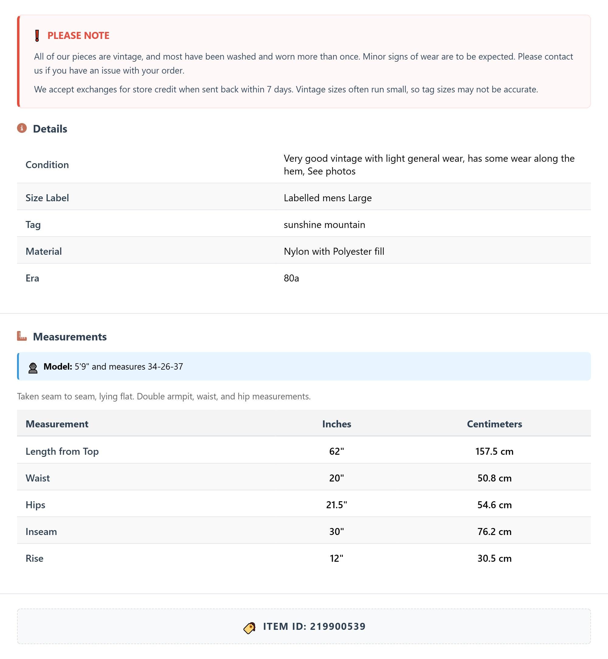 All of our pieces are vintage, and most have been washed and worn more than once. Minor signs of wear are to be expected. Please contact us if you have an issue with your order. We accept exchanges for store credit when sent back within 7 days.