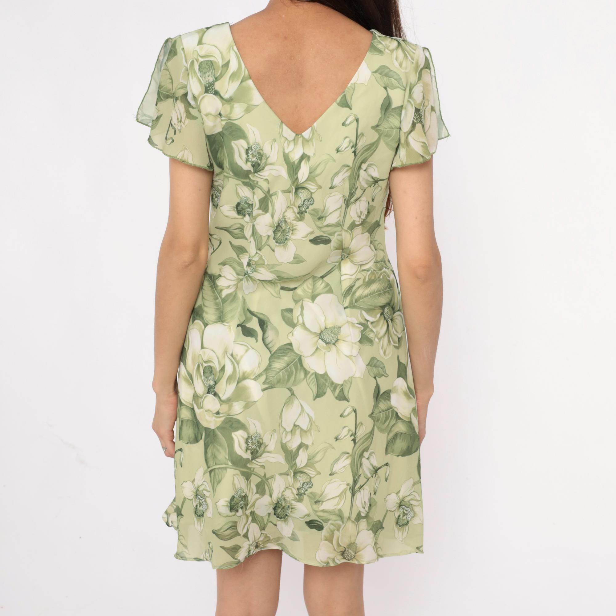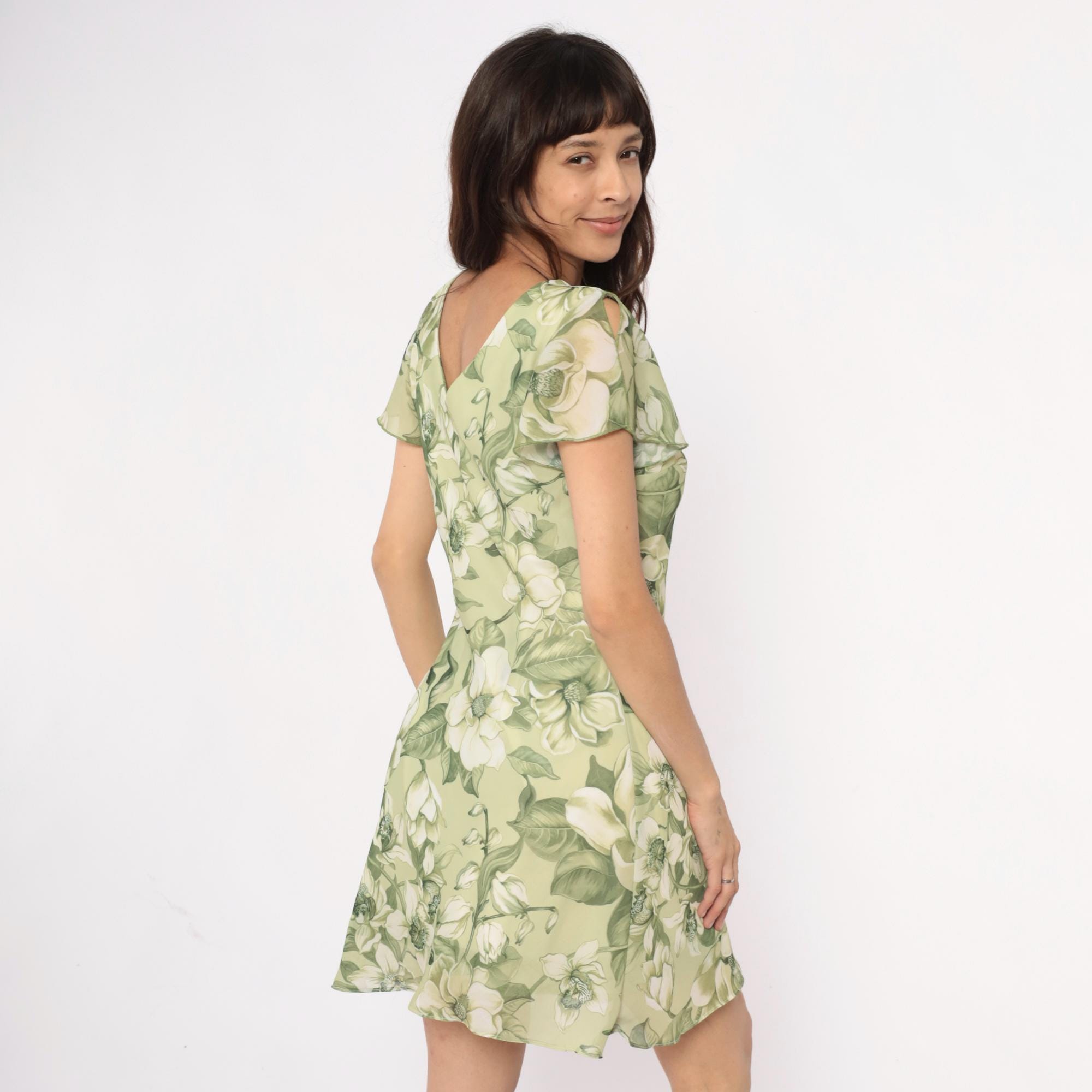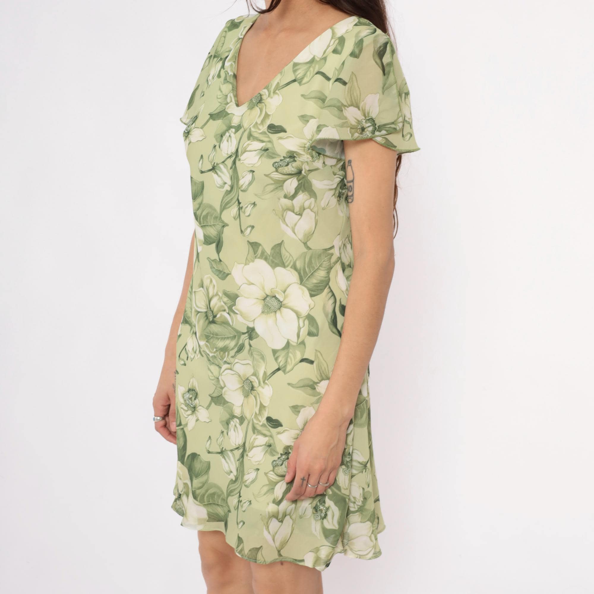 90s pale yellow floral dress with large-scale magnolia print in white and green across the fabric. V-neck front and back, short flutter sleeves, A-line skirt with above-knee length. Pullover with no closures.