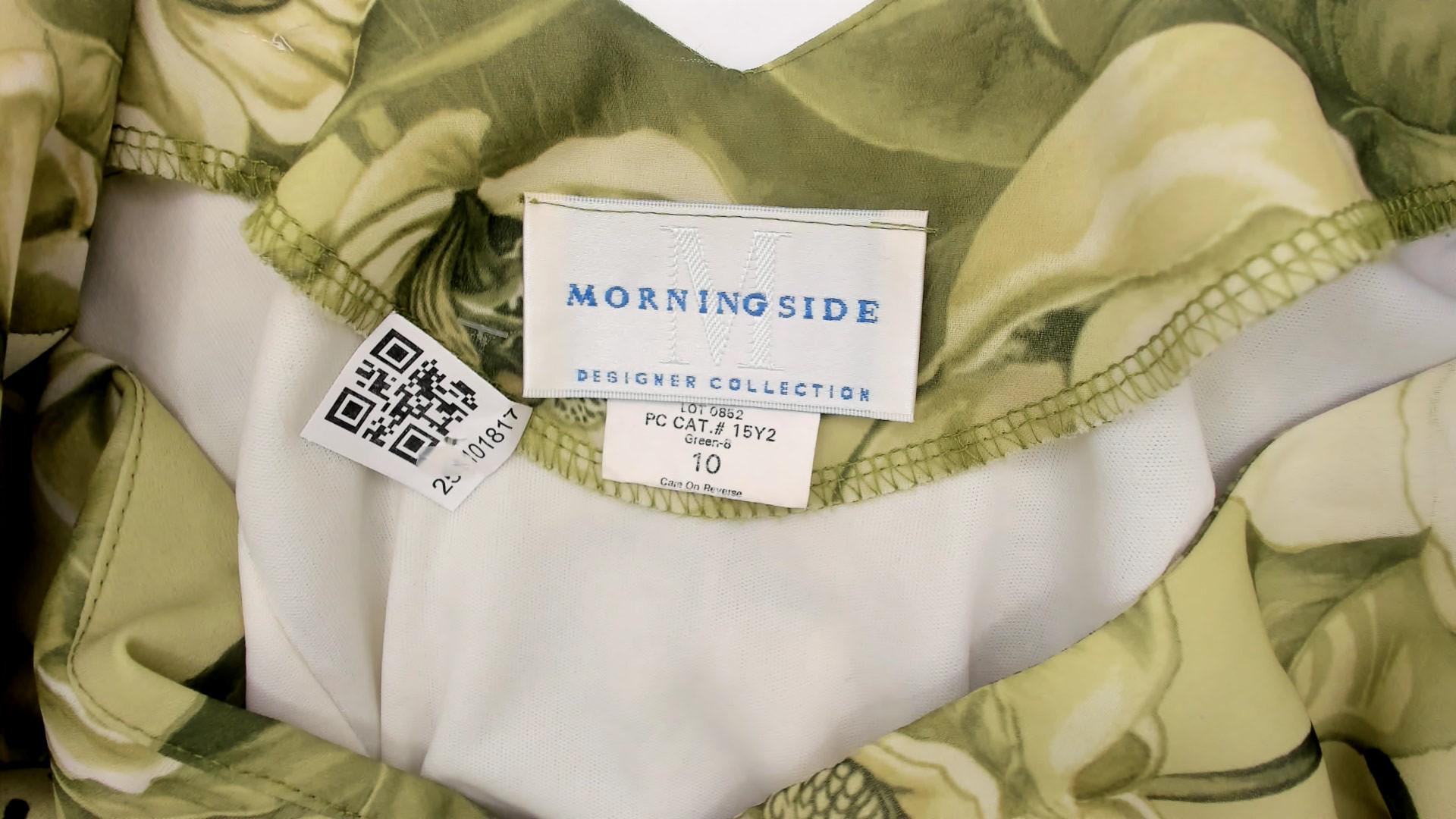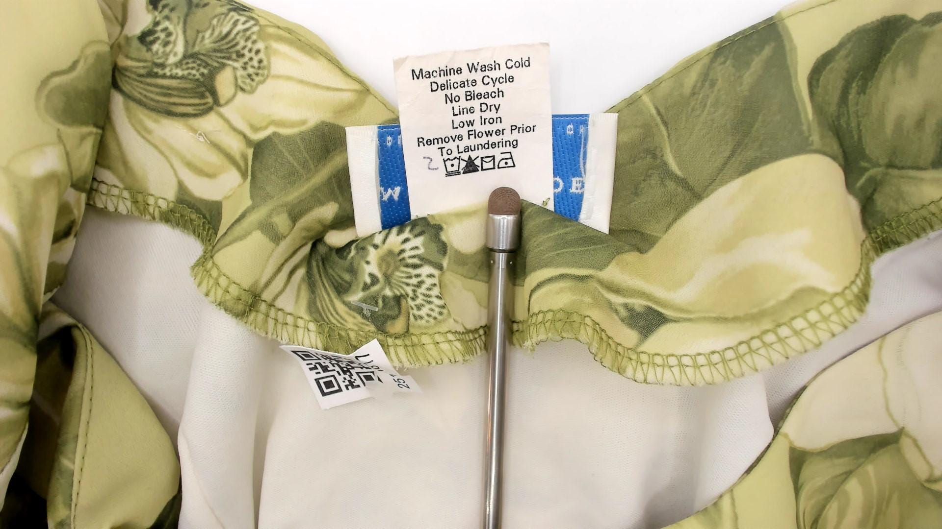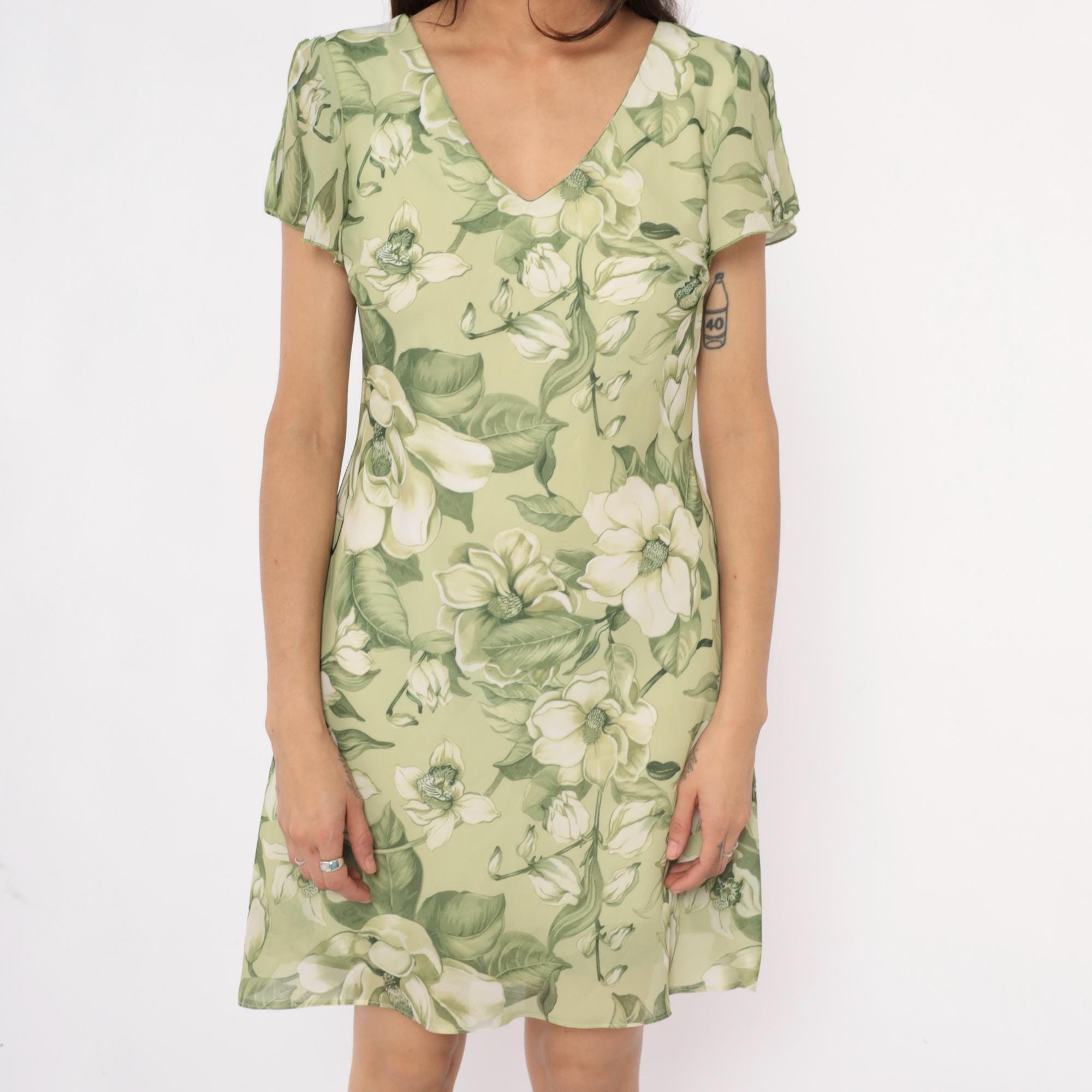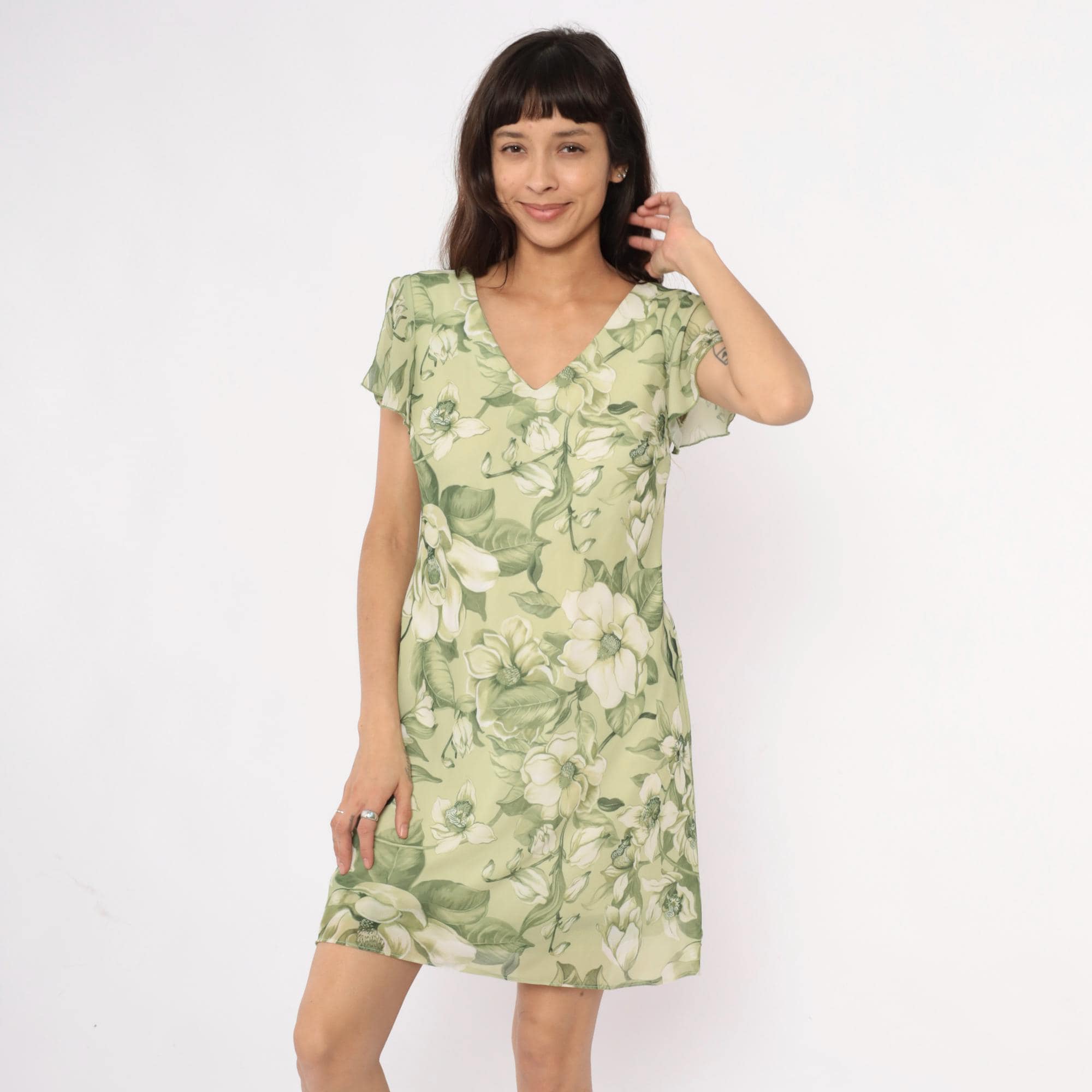90s pale yellow floral dress with large-scale magnolia print in white and green across the fabric. V-neck front and back, short flutter sleeves, A-line skirt with above-knee length. Pullover with no closures.