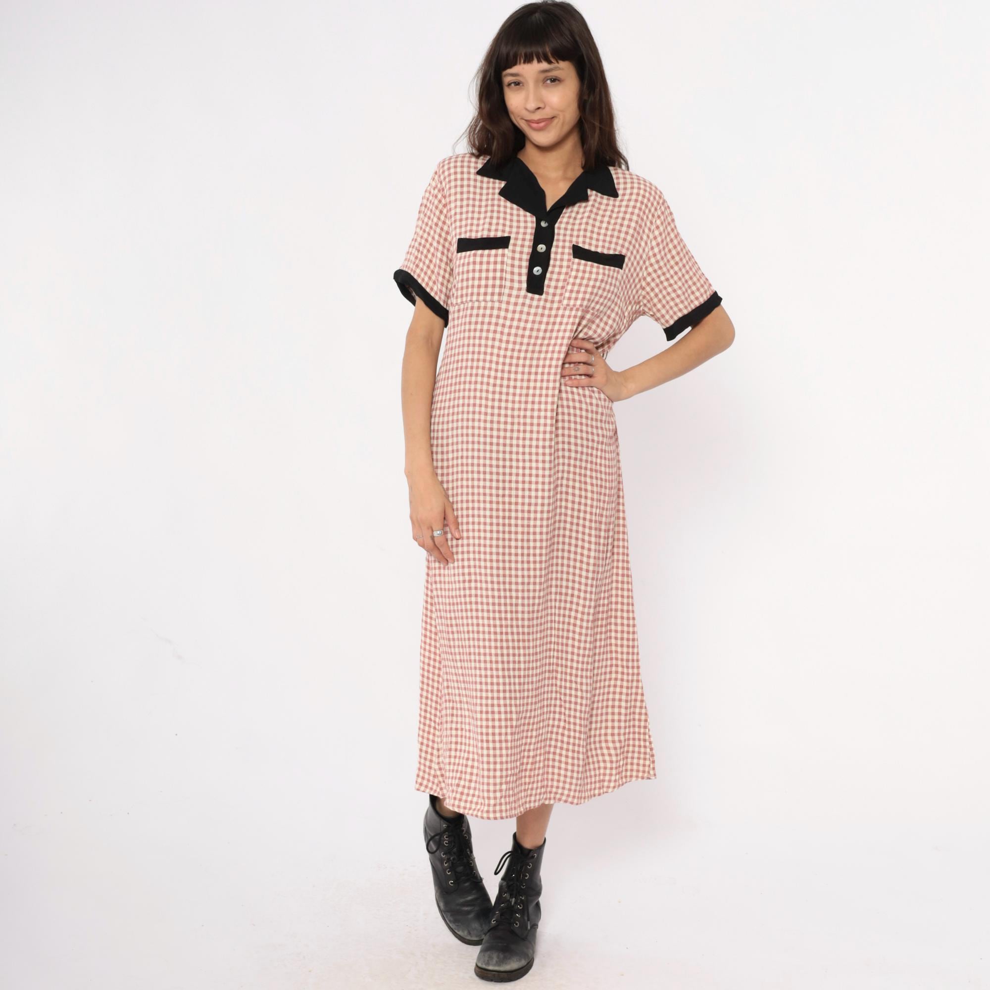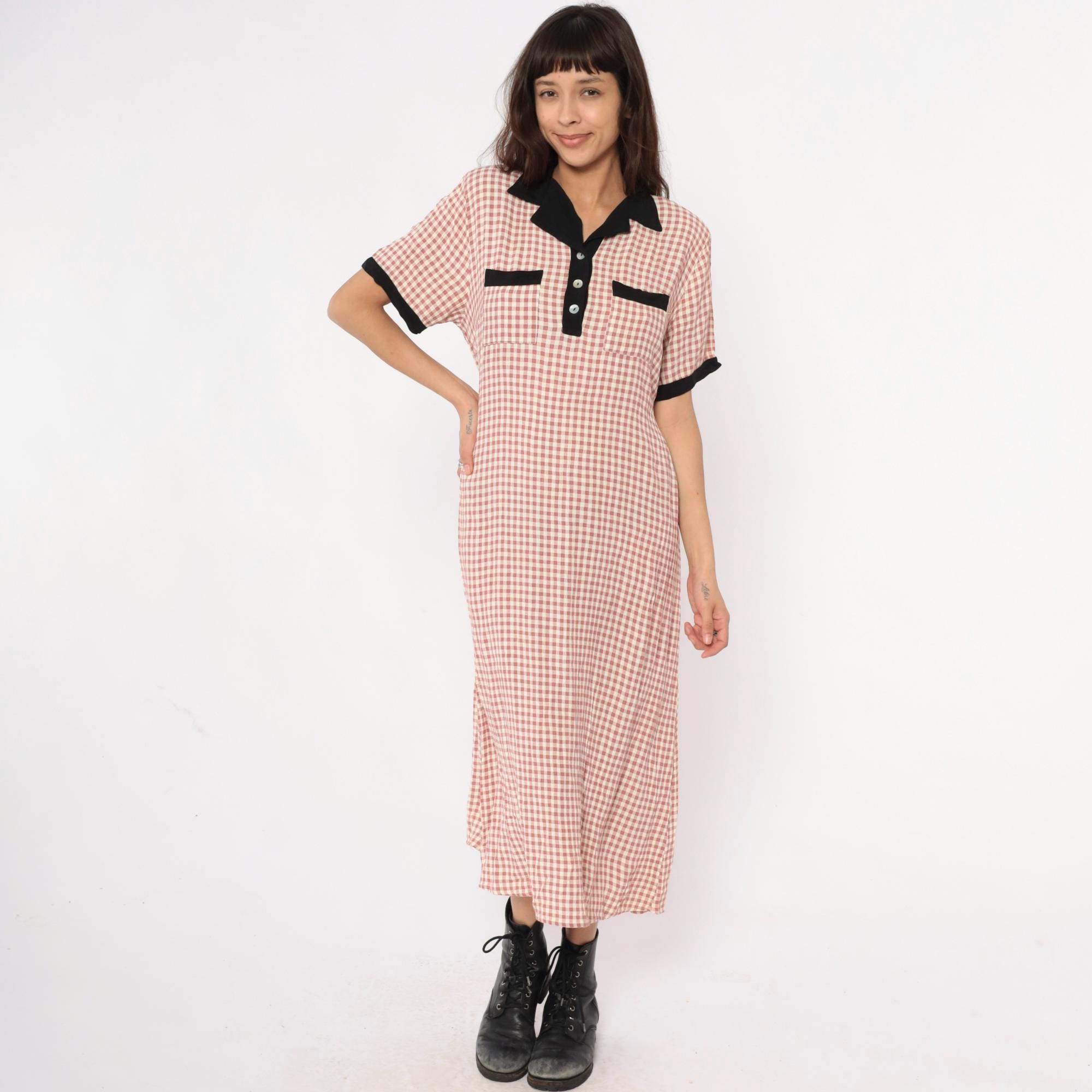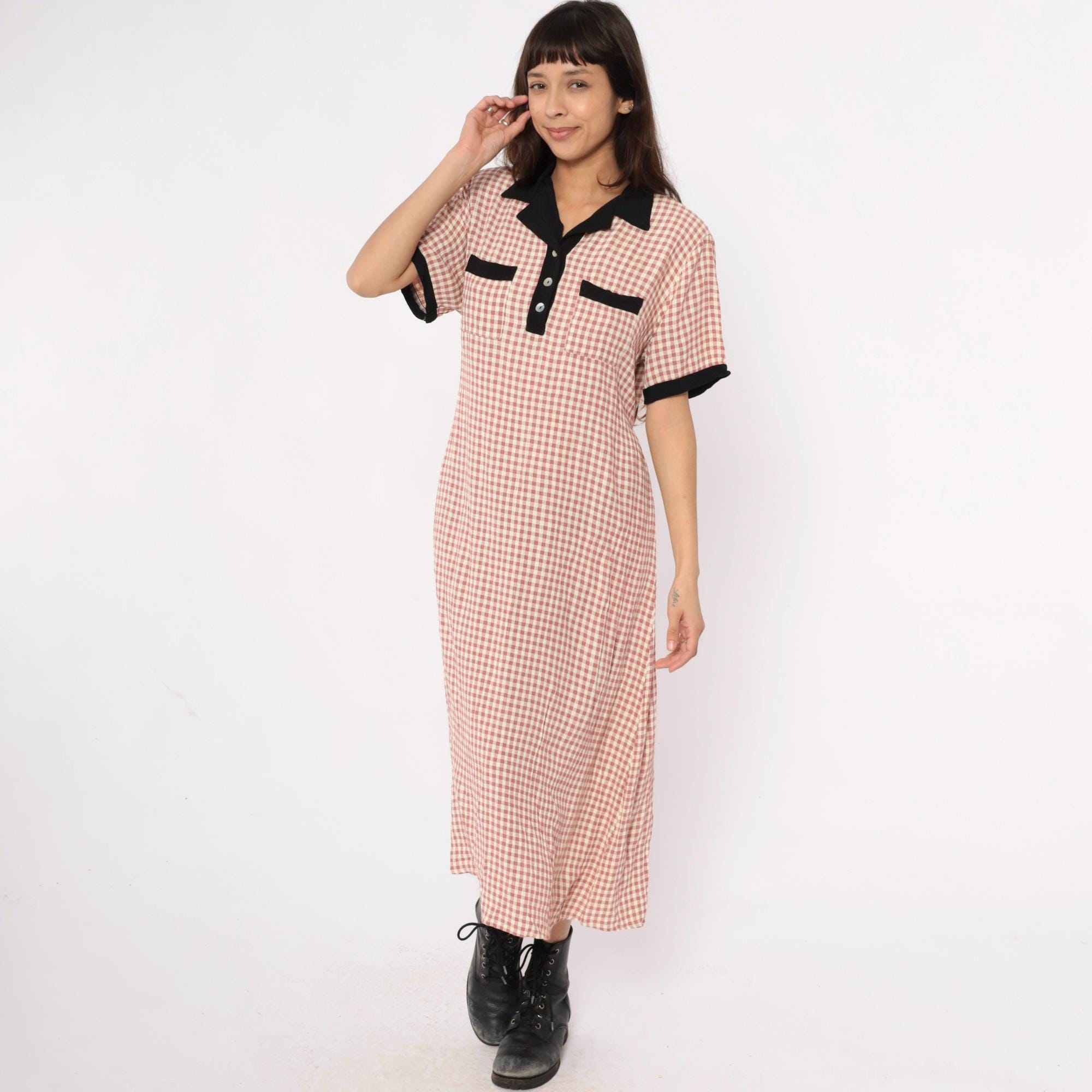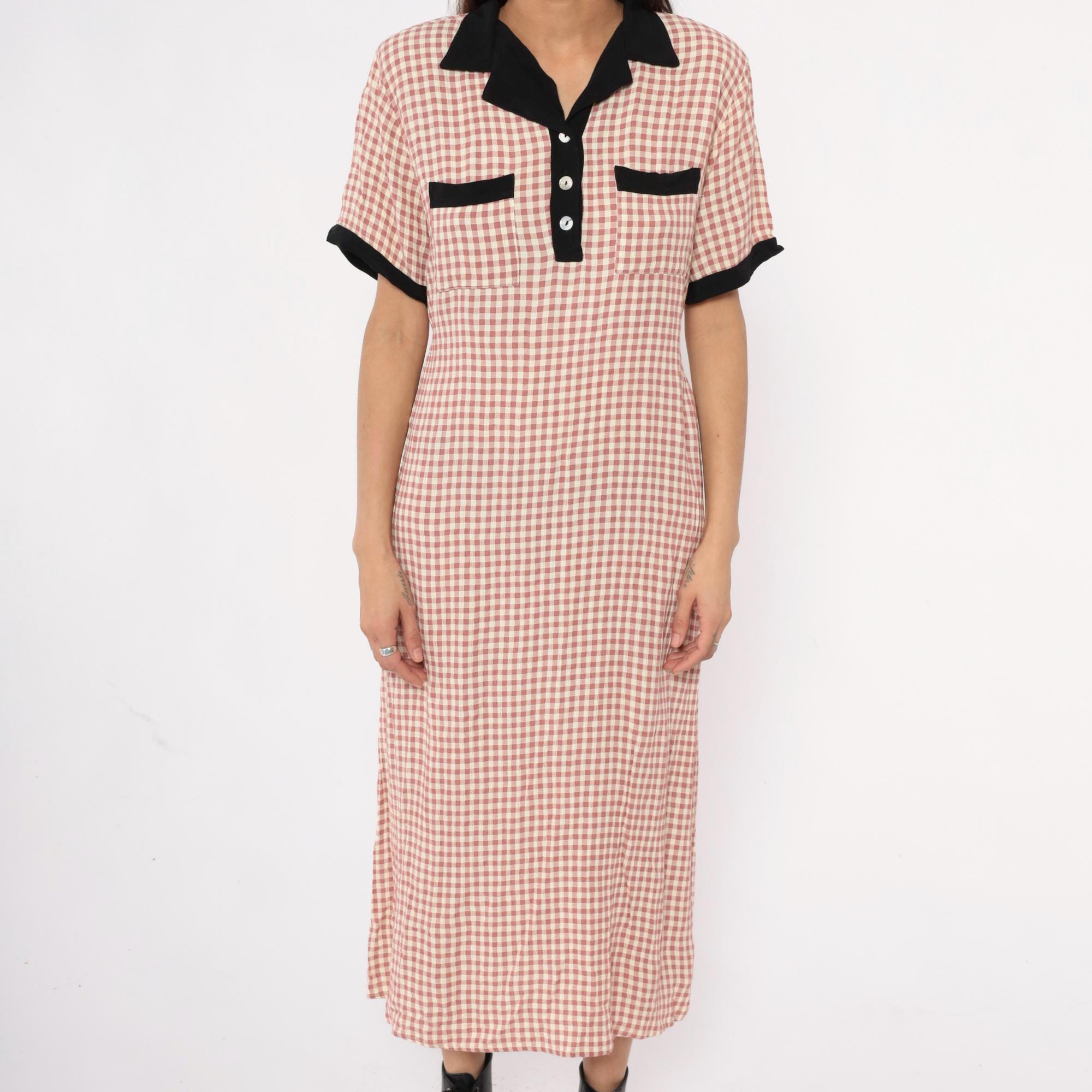 90s faint red and beige gingham check maxi dress from impressions with black contrast collar, button placket, chest pockets, and sleeve cuffs. Polo-style collar with partial button front closure, short sleeves, two chest pockets with black trim.