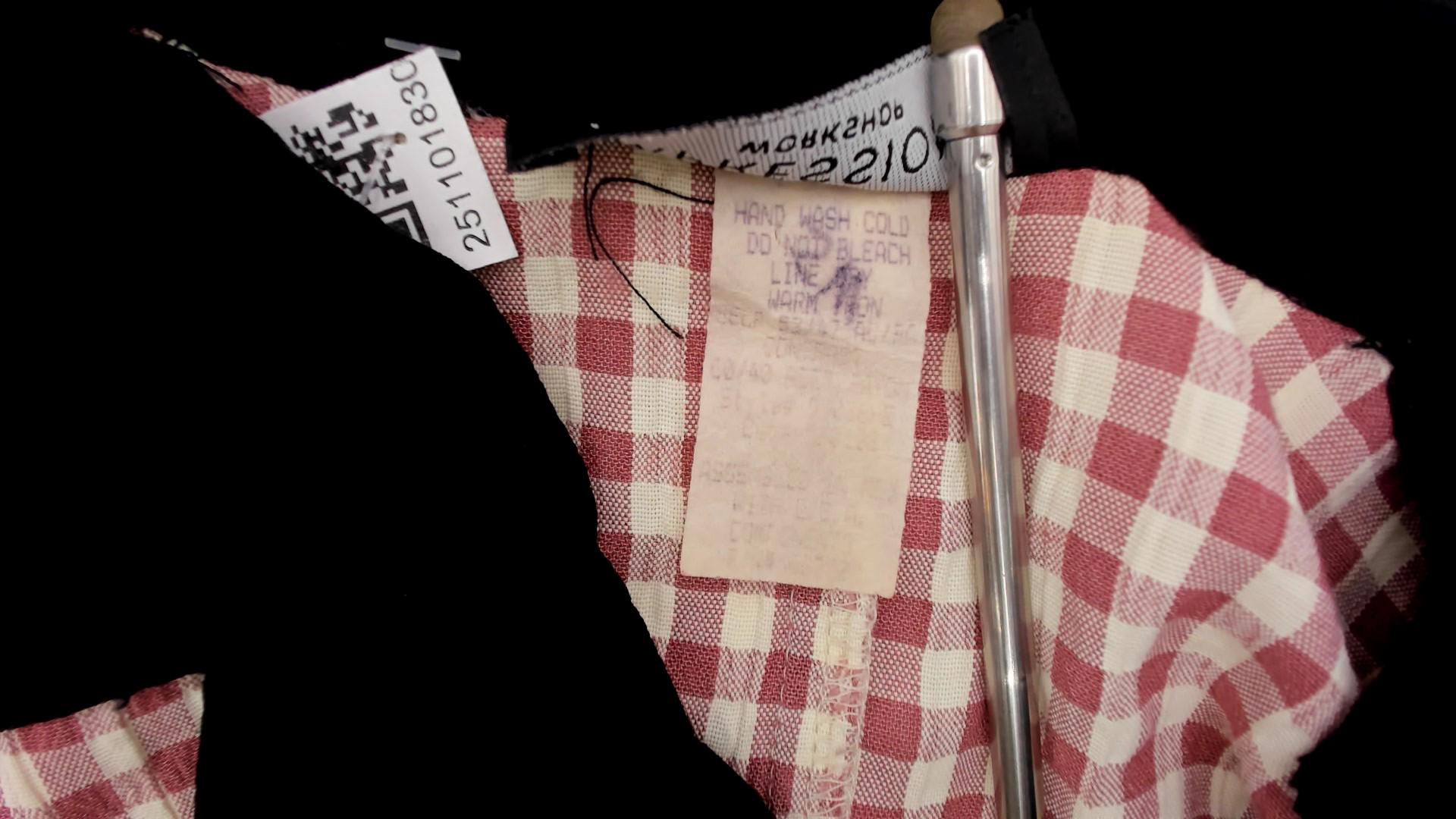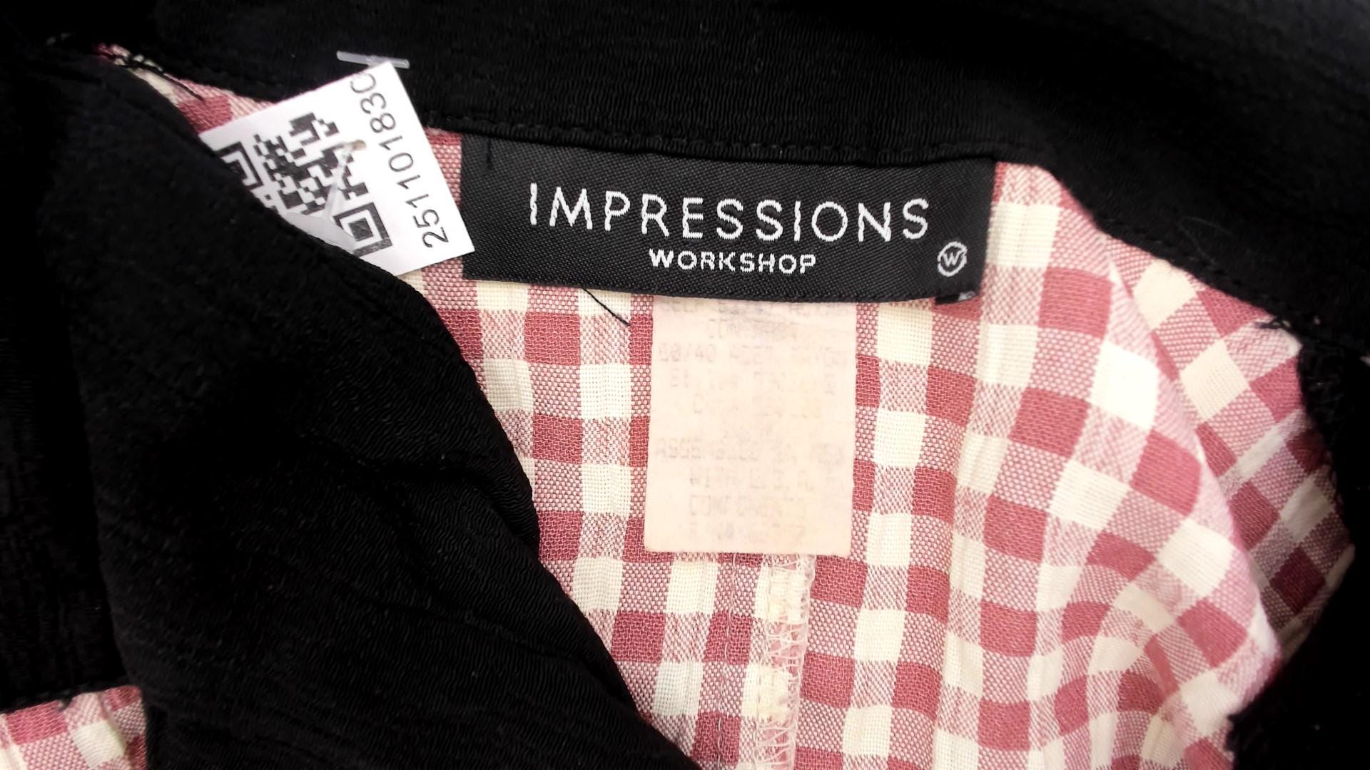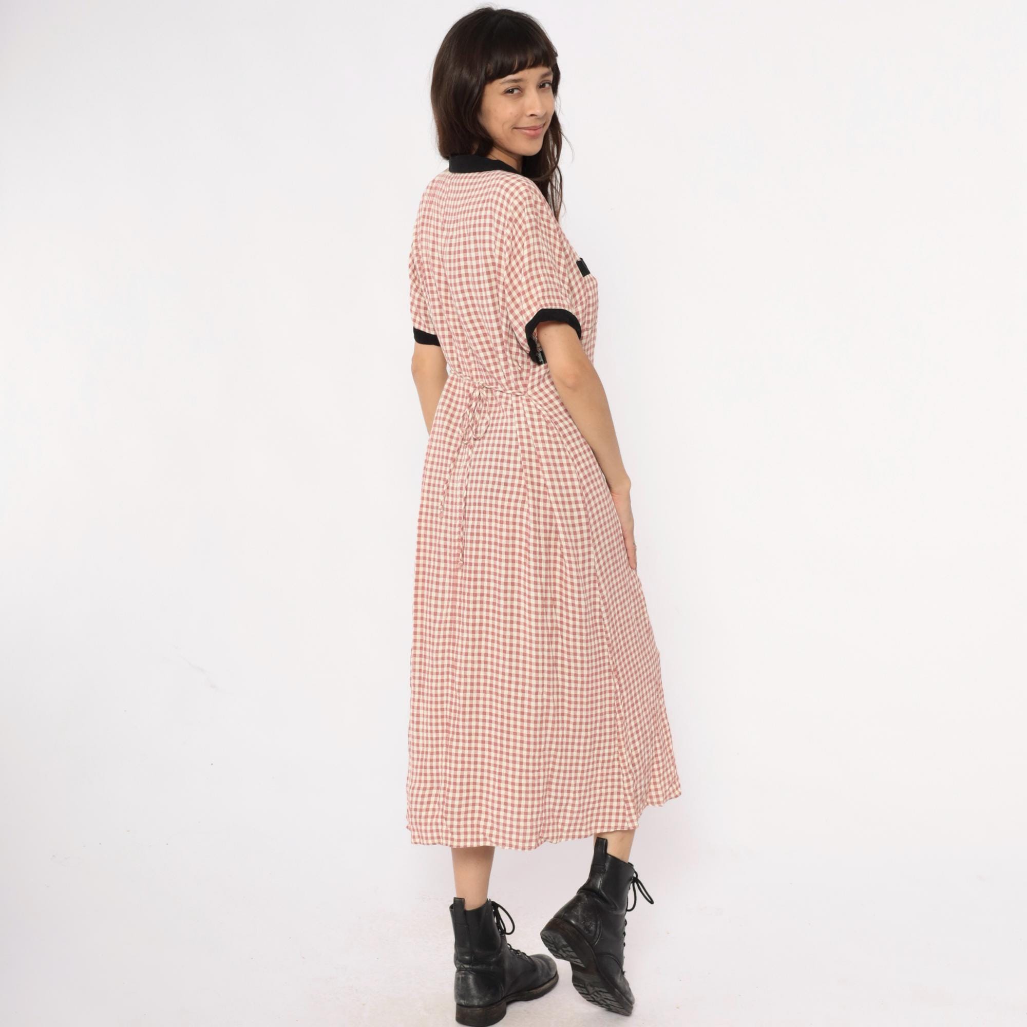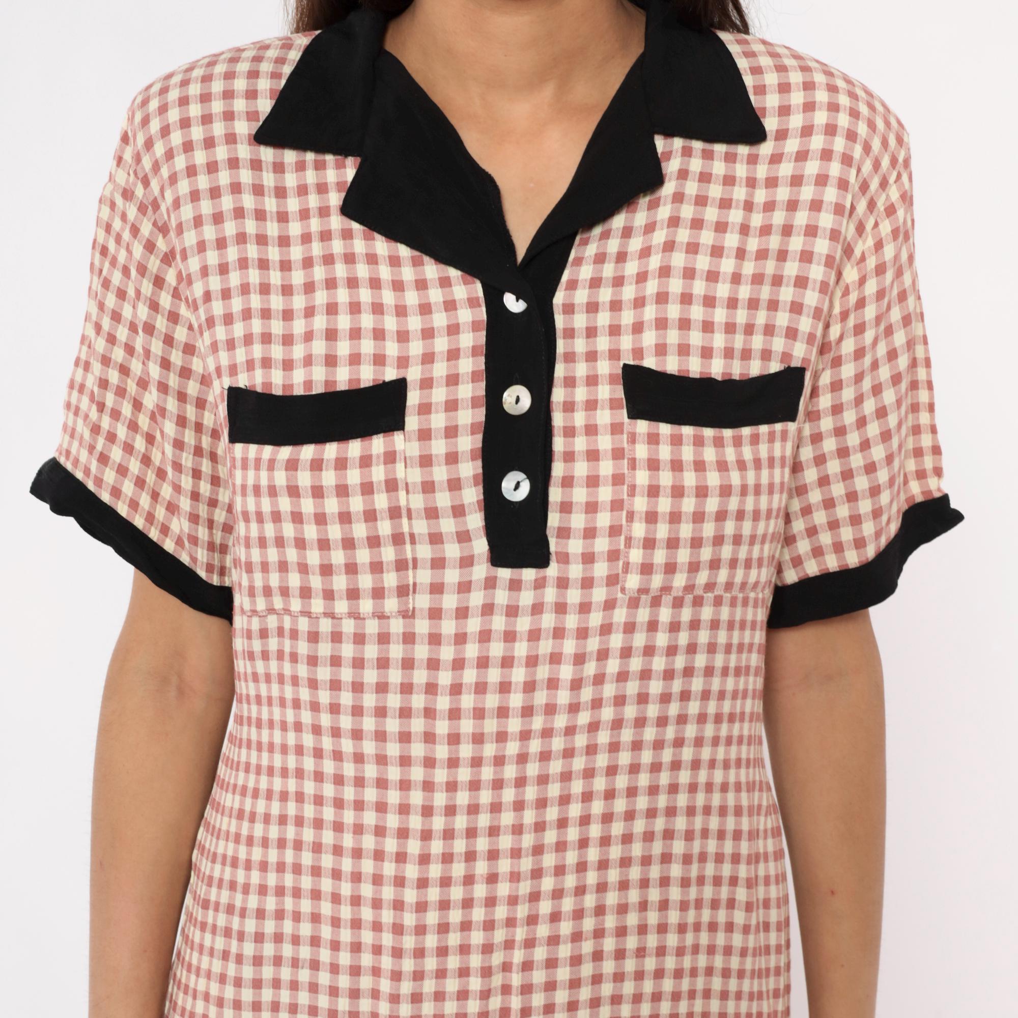90s faint red and beige gingham check maxi dress from impressions with black contrast collar, button placket, chest pockets, and sleeve cuffs. Polo-style collar with partial button front closure, short sleeves, two chest pockets with black trim.
