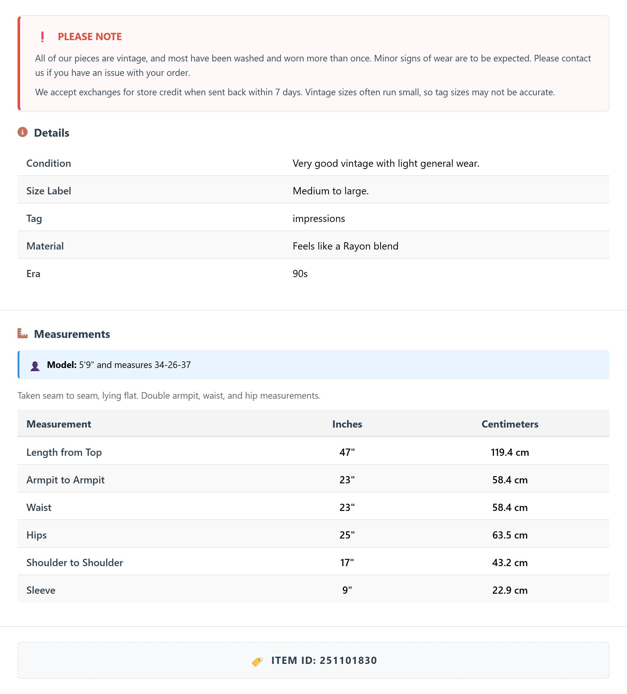 All of our pieces are vintage, and most have been washed and worn more than once. Minor signs of wear are to be expected. Please contact us if you have an issue with your order. We accept exchanges for store credit when sent back within 7 days.