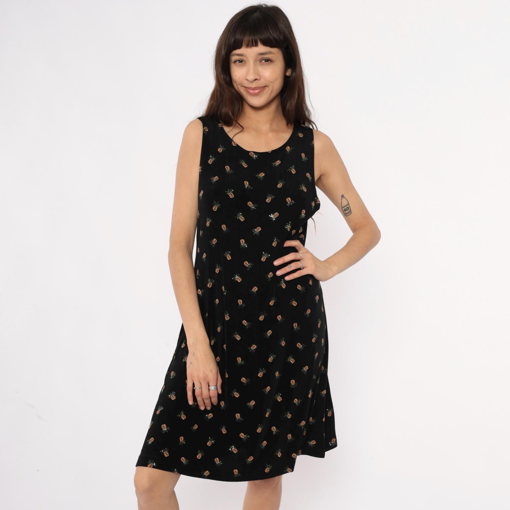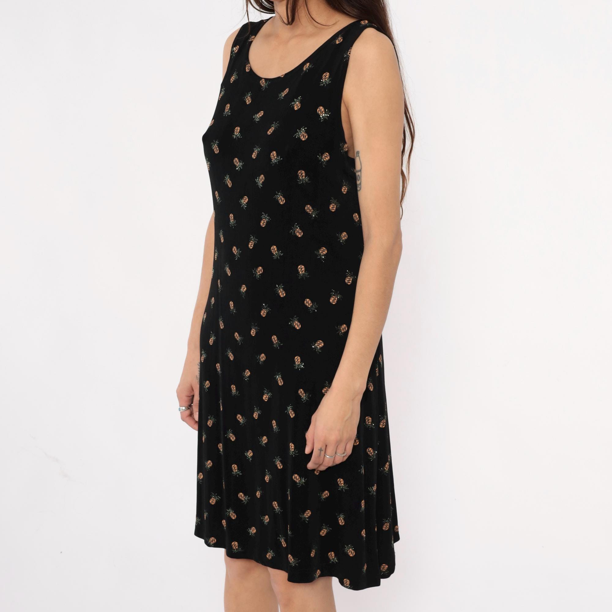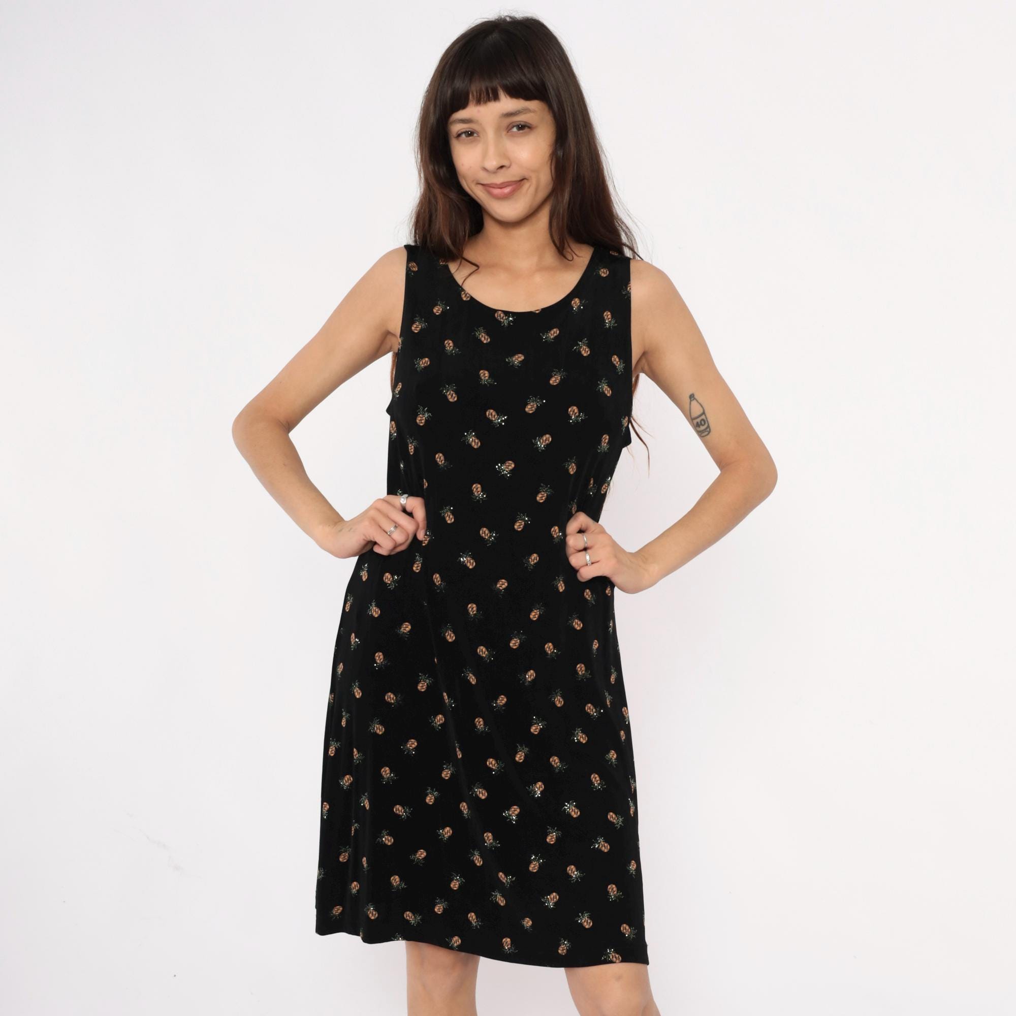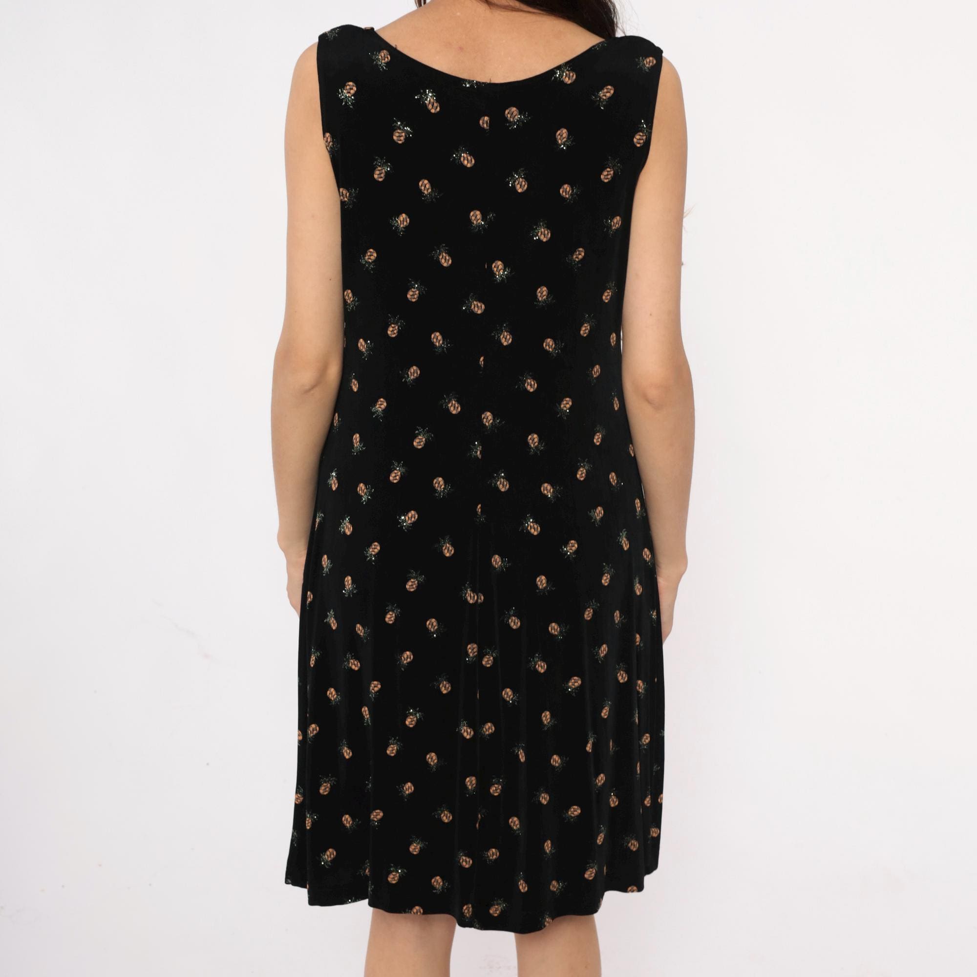 90s black sleeveless dress from ronni nicole with all-over pineapple print in tan and silver tones. Scoop neckline, shift silhouette with slight A-line shape.