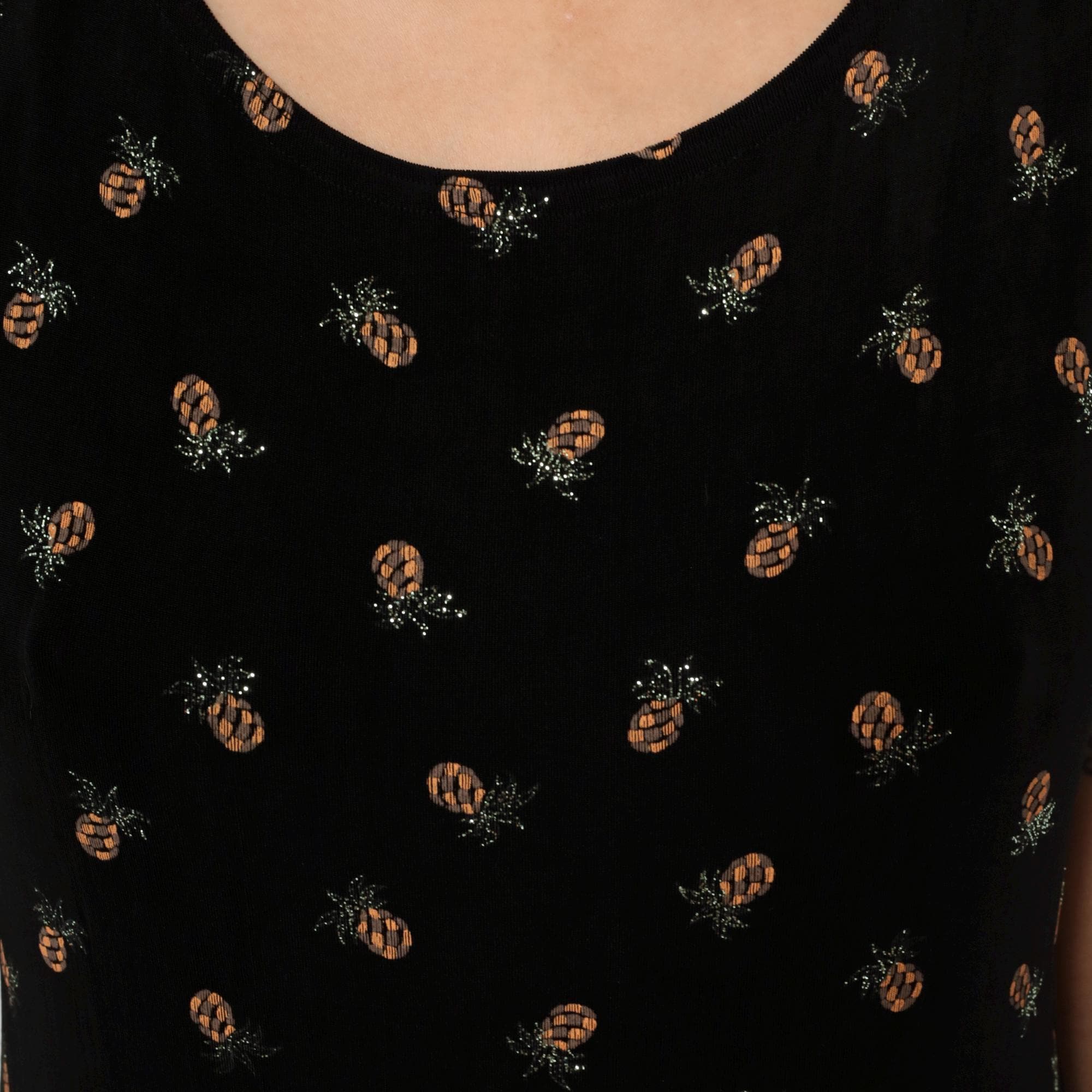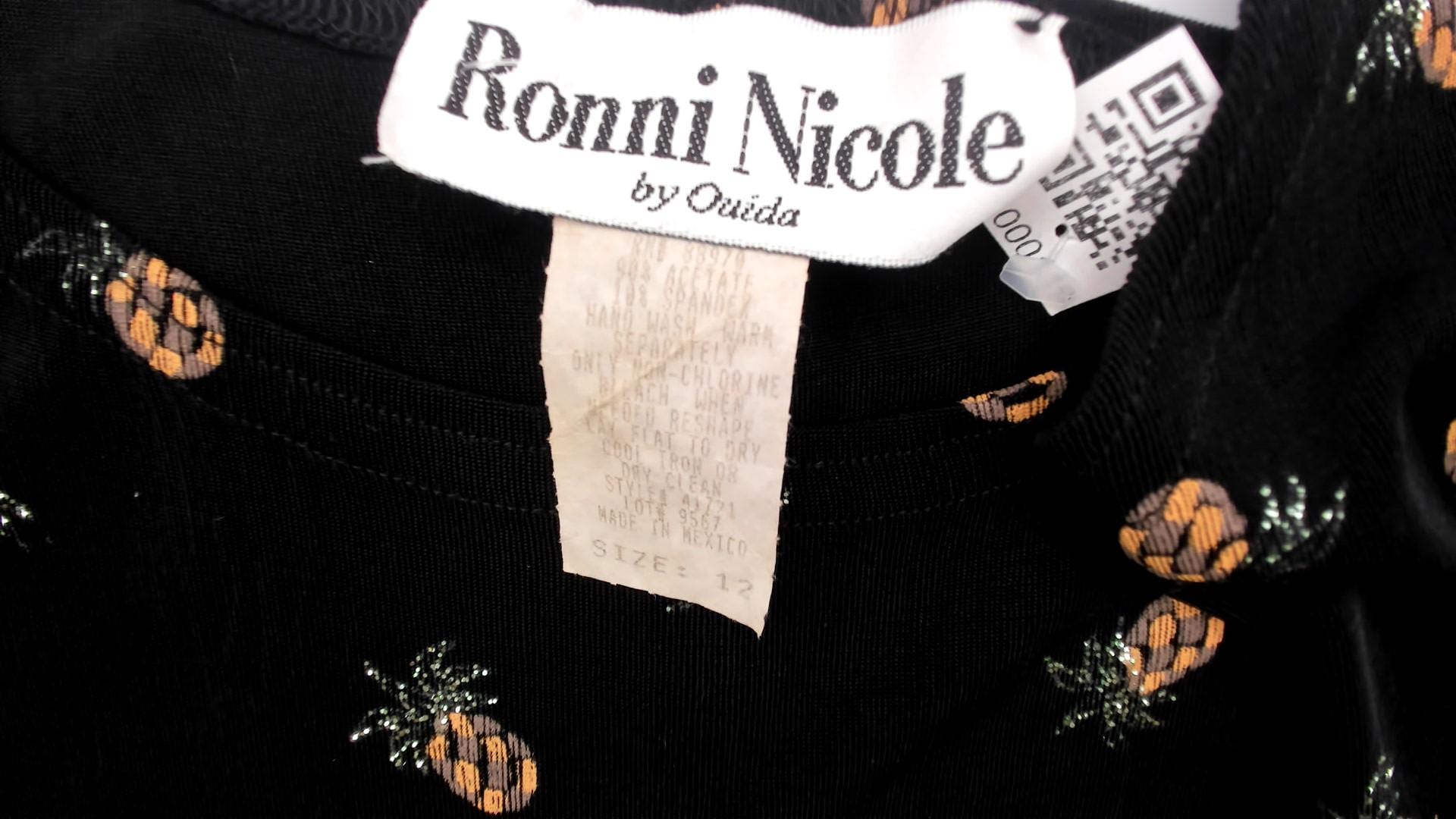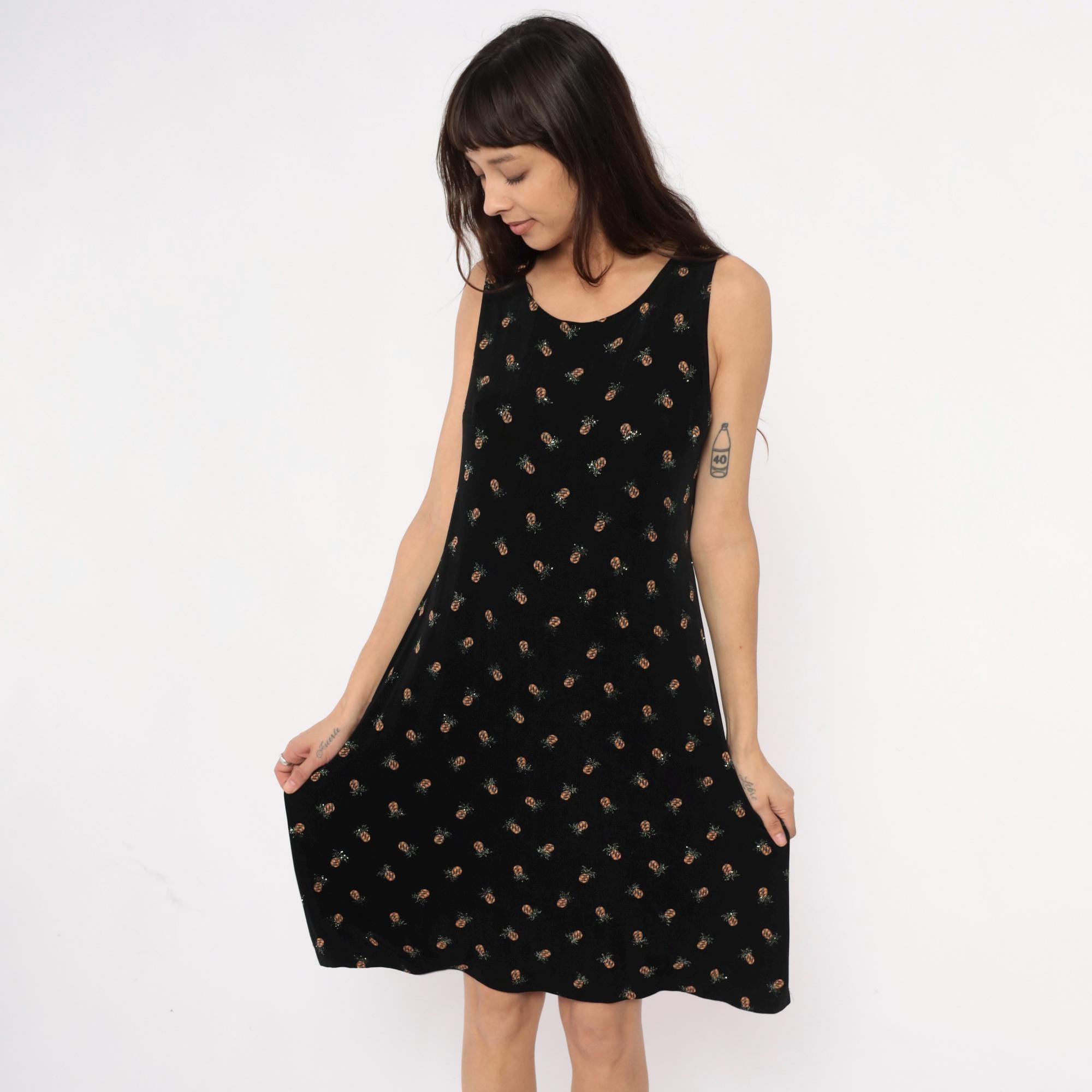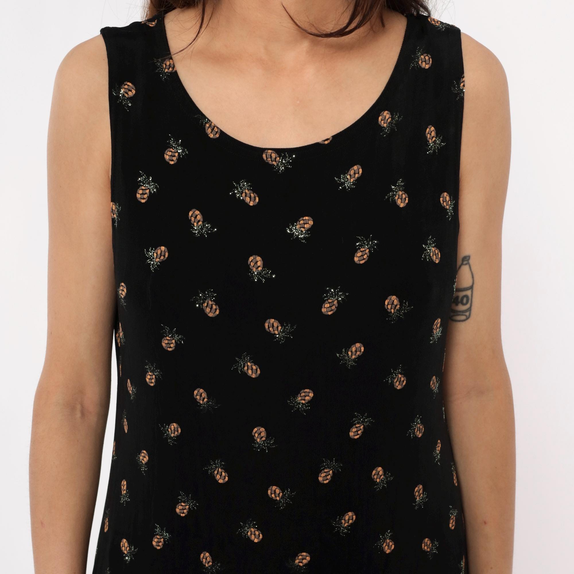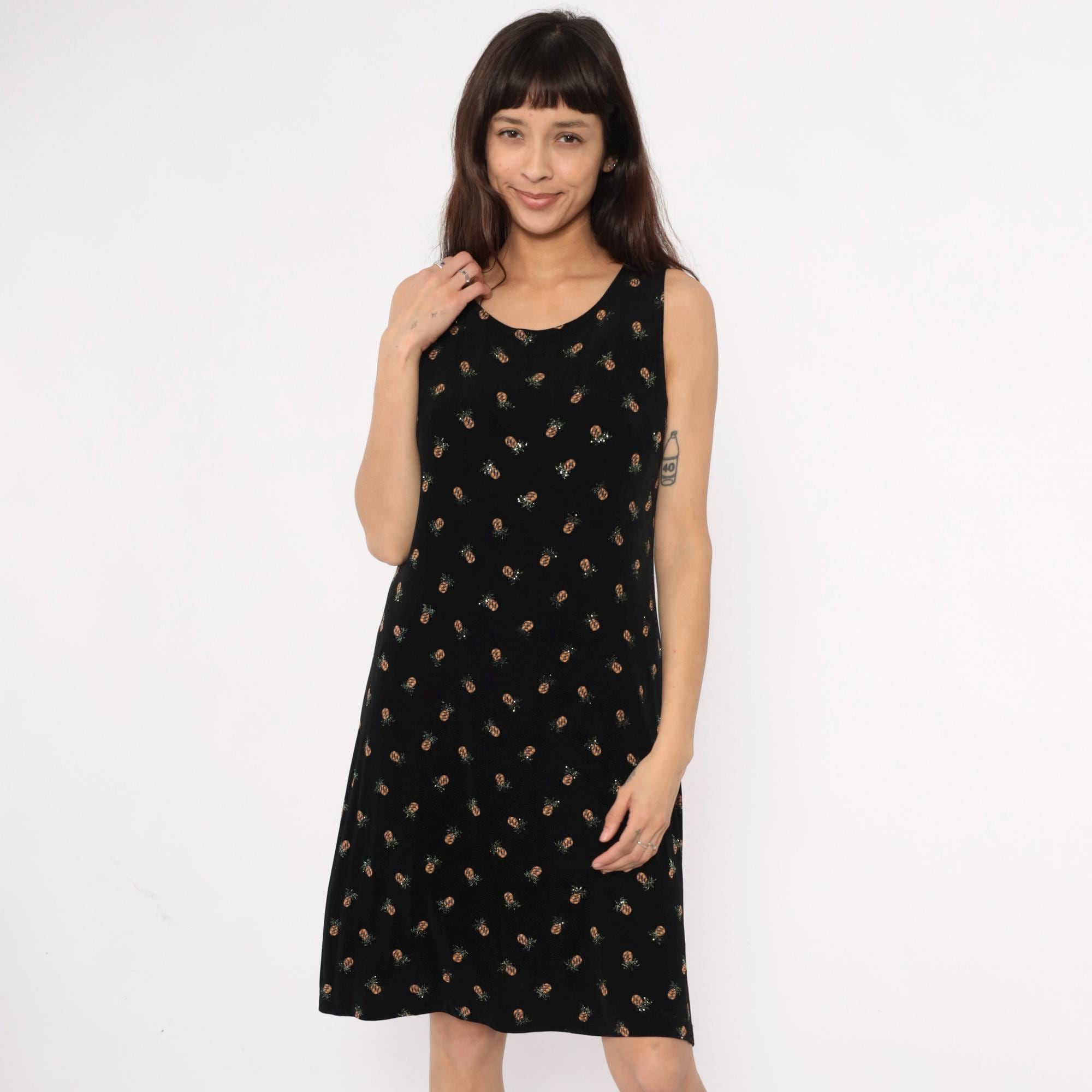 90s black sleeveless dress from ronni nicole with all-over pineapple print in tan and silver tones. Scoop neckline, shift silhouette with slight A-line shape.