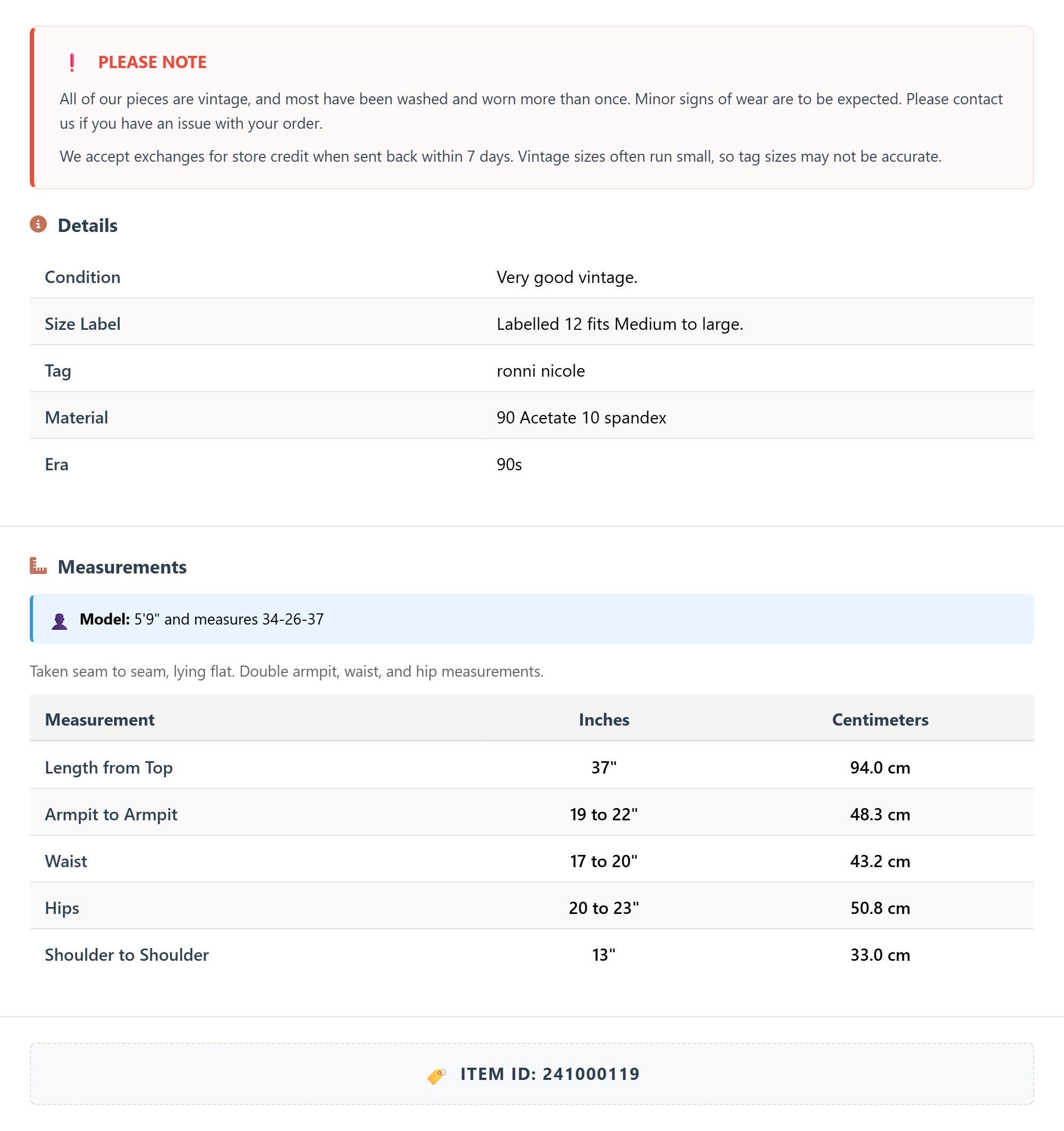 Measurements are taken laying flat and should be doubled where applicable. The "best fits" size is just an estimate, and vintage sizing can vary from modern sizing. Please use measurements to ensure proper fit. The best thing to do is measure a similar item of your own, and compare. When an item has stretch, we will list the unstretched dimensions with the stretched measurement afterwards.