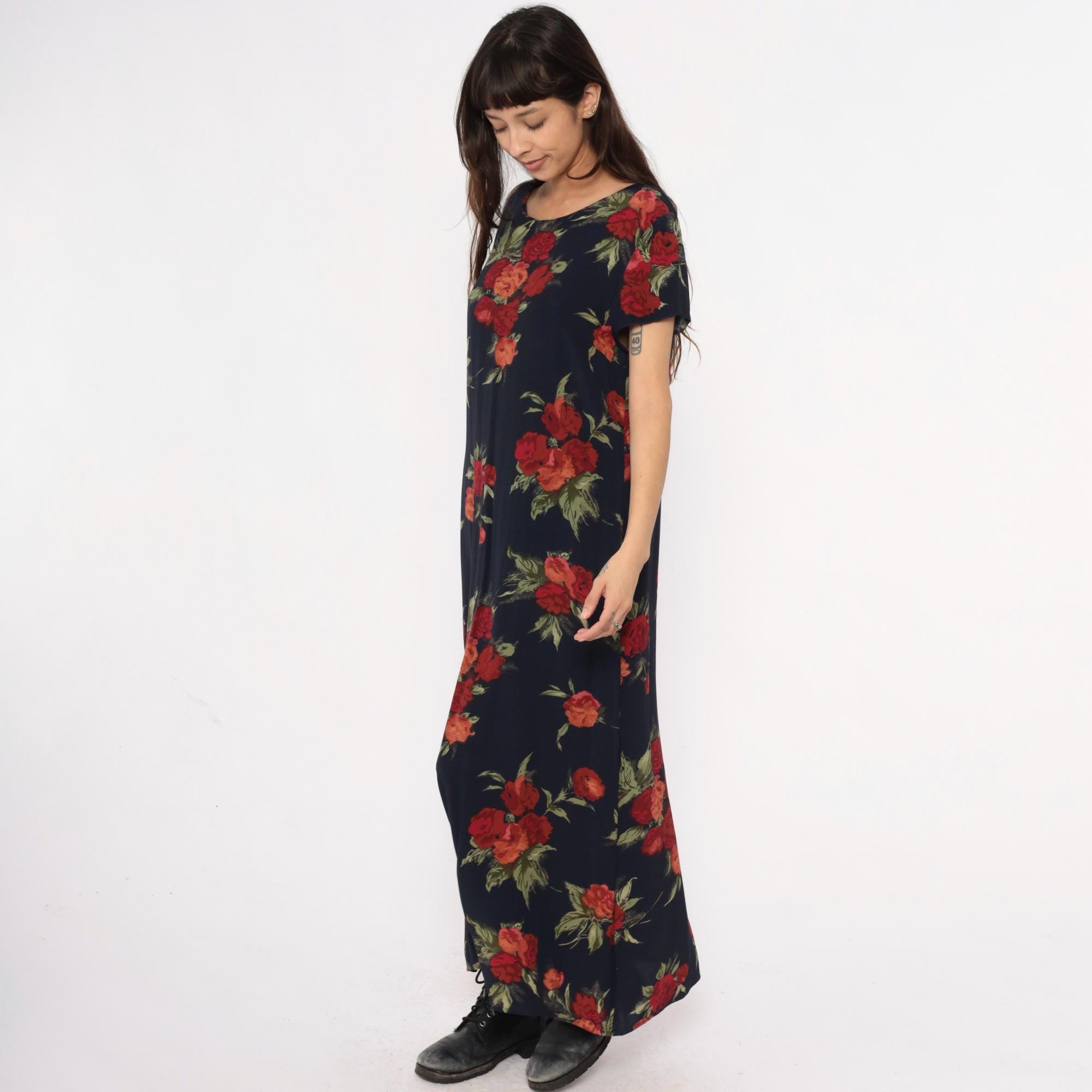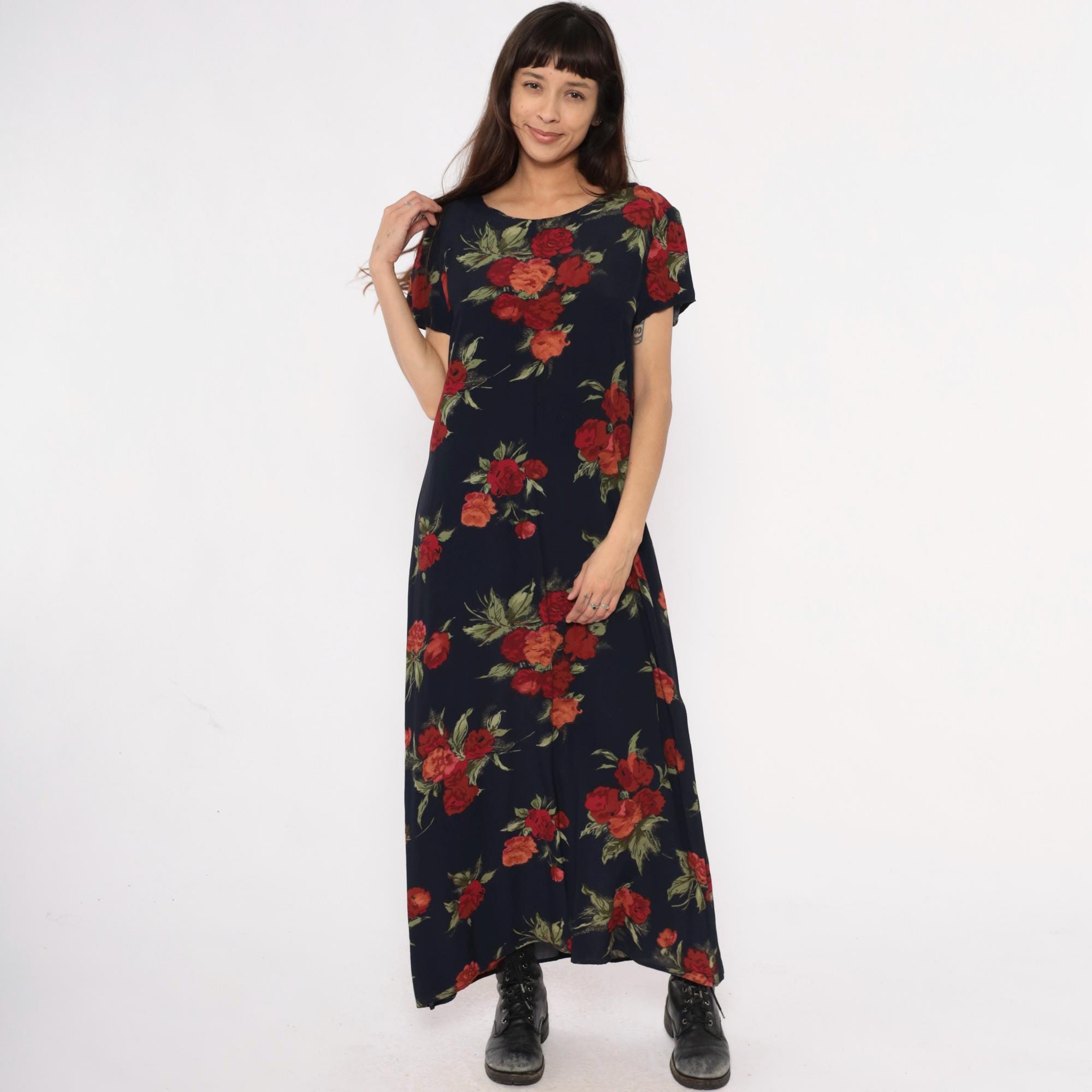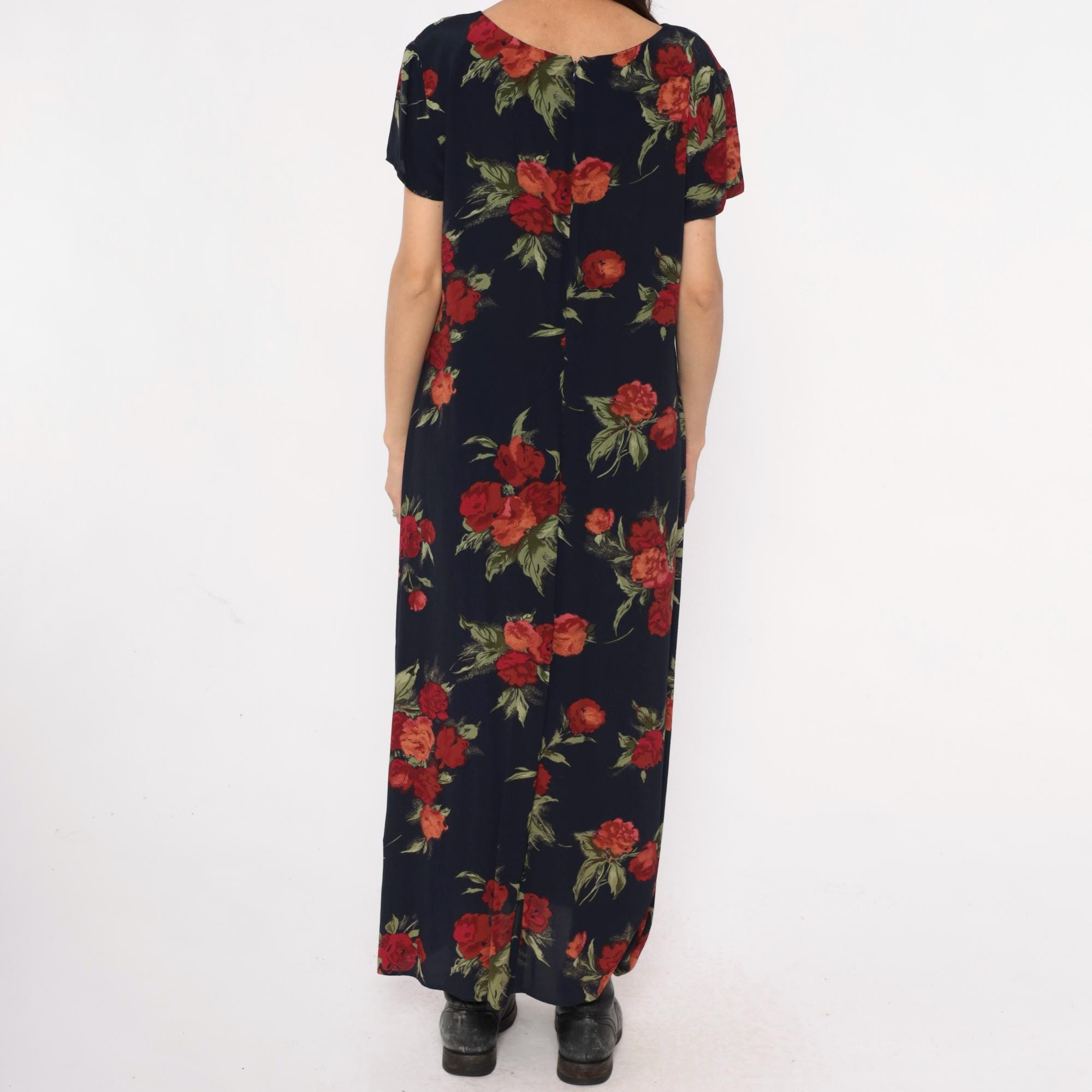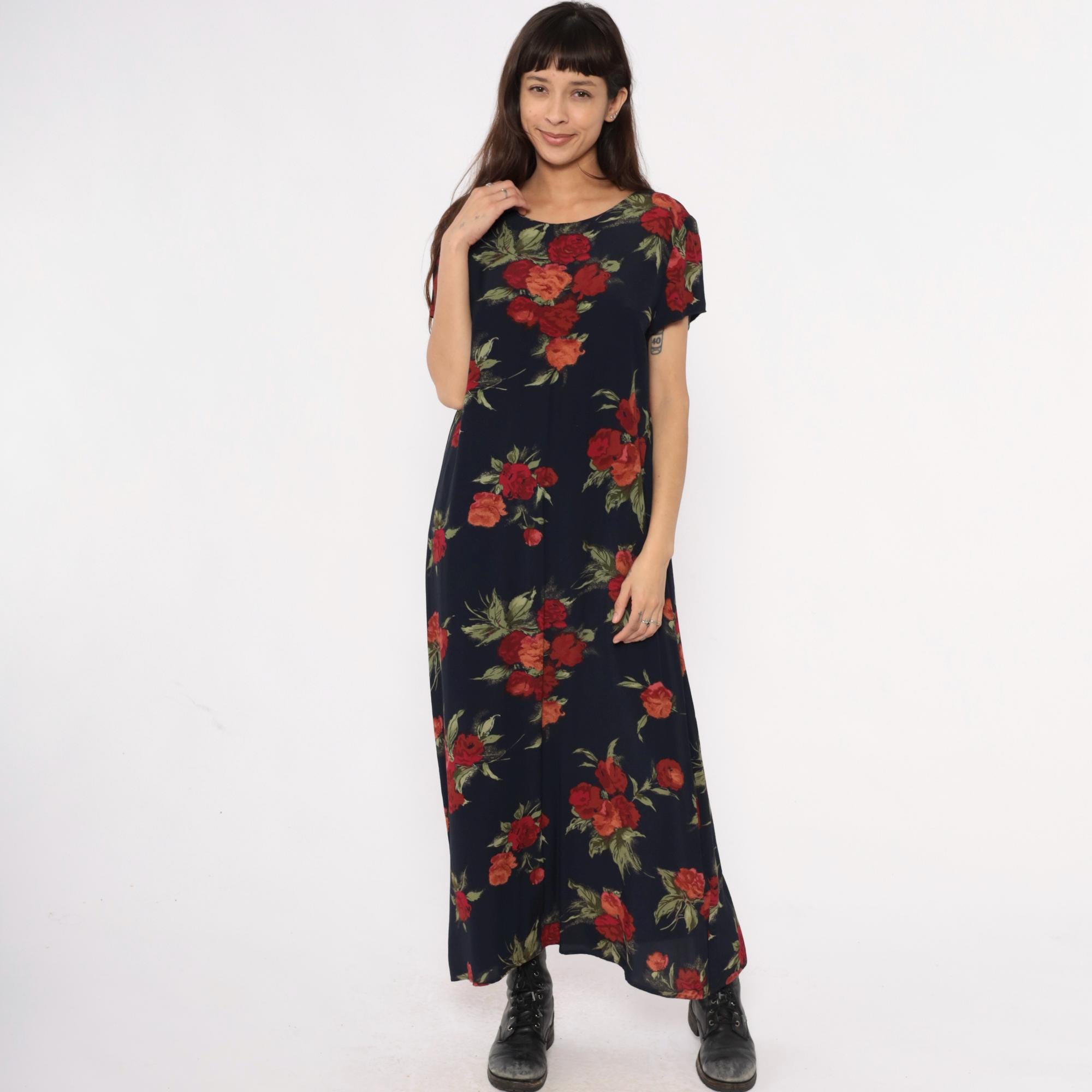 90s dark blue floral maxi dress from Talbots with red, burgundy, and coral rose print and green foliage across the fabric. Round neckline and short sleeves with straight, full-length silhouette.
