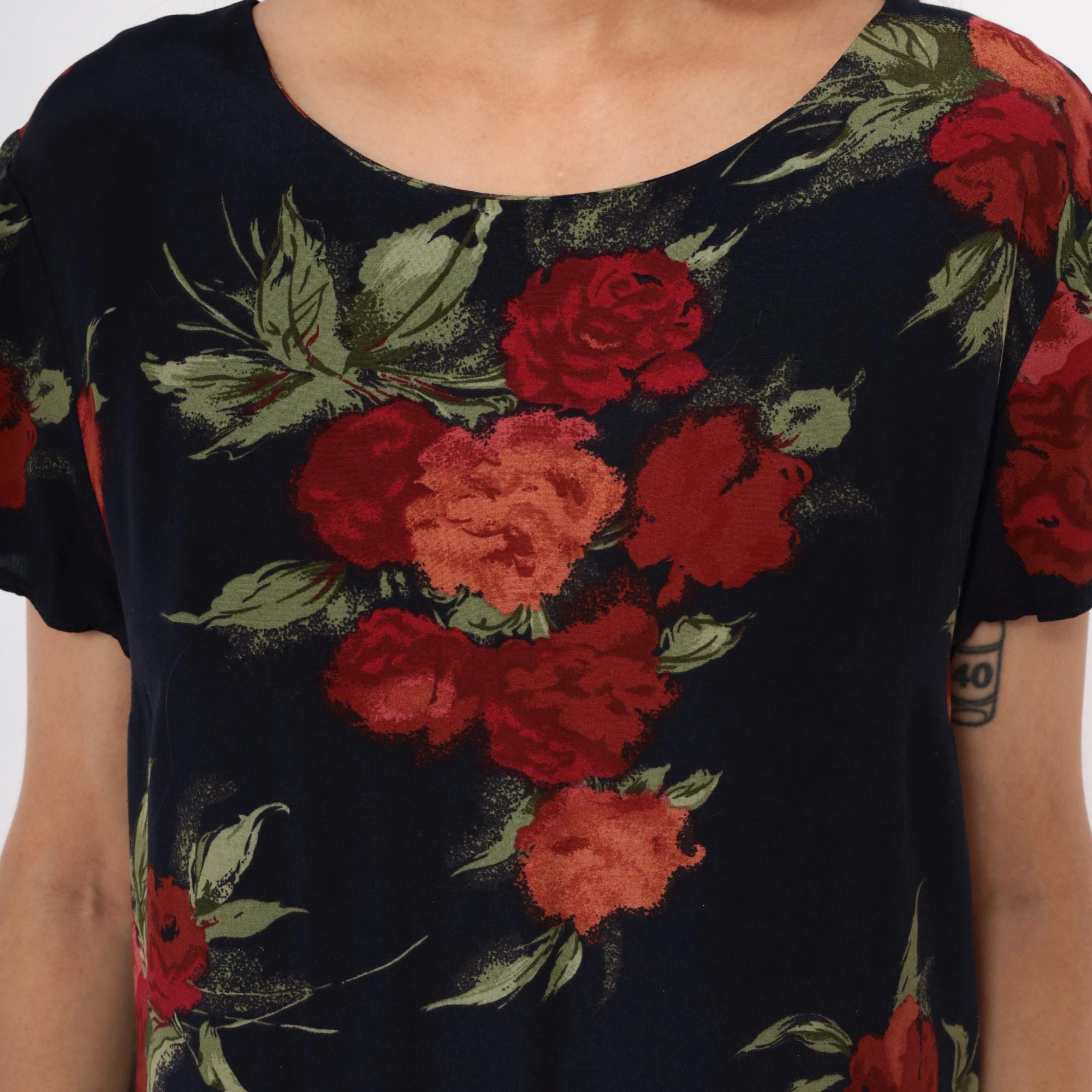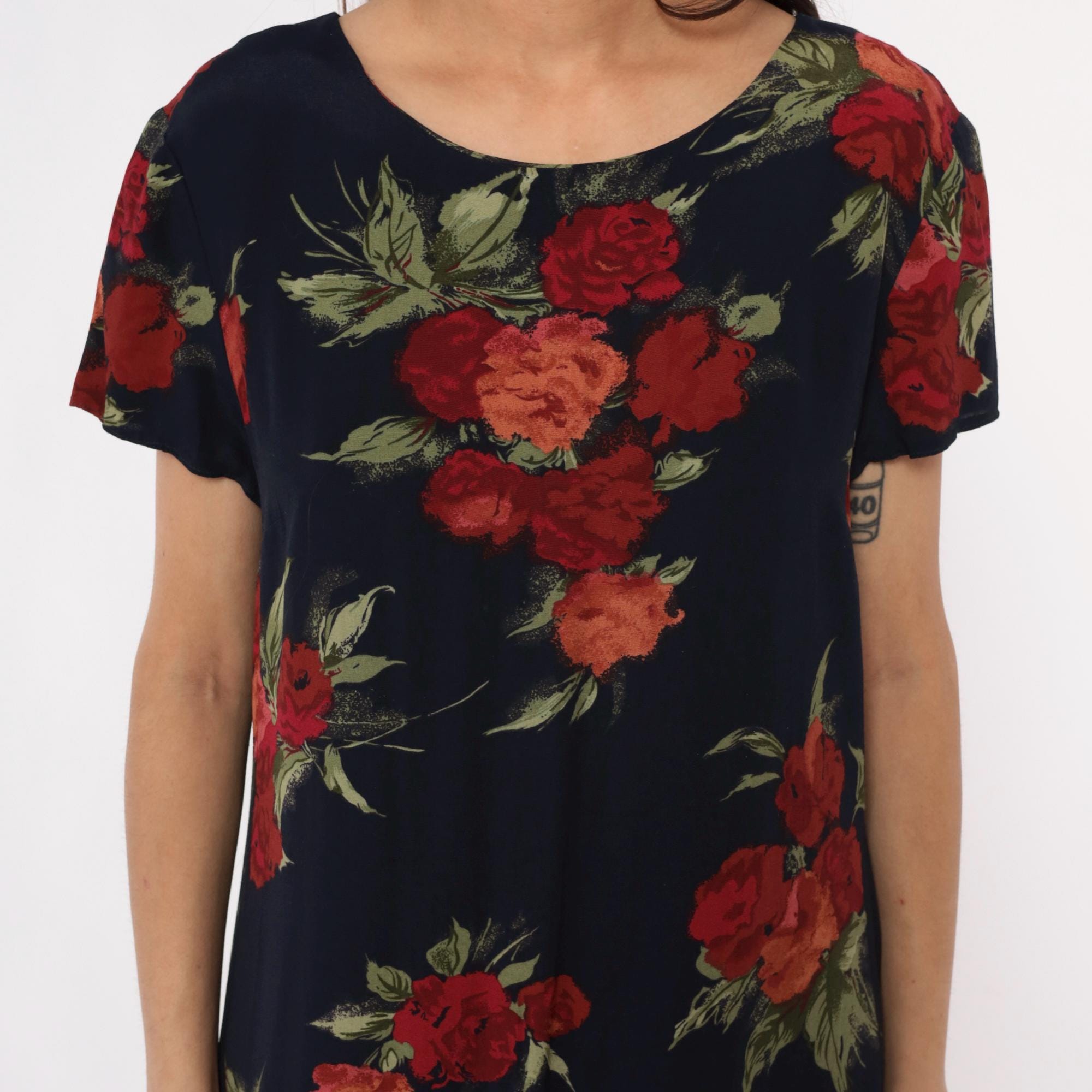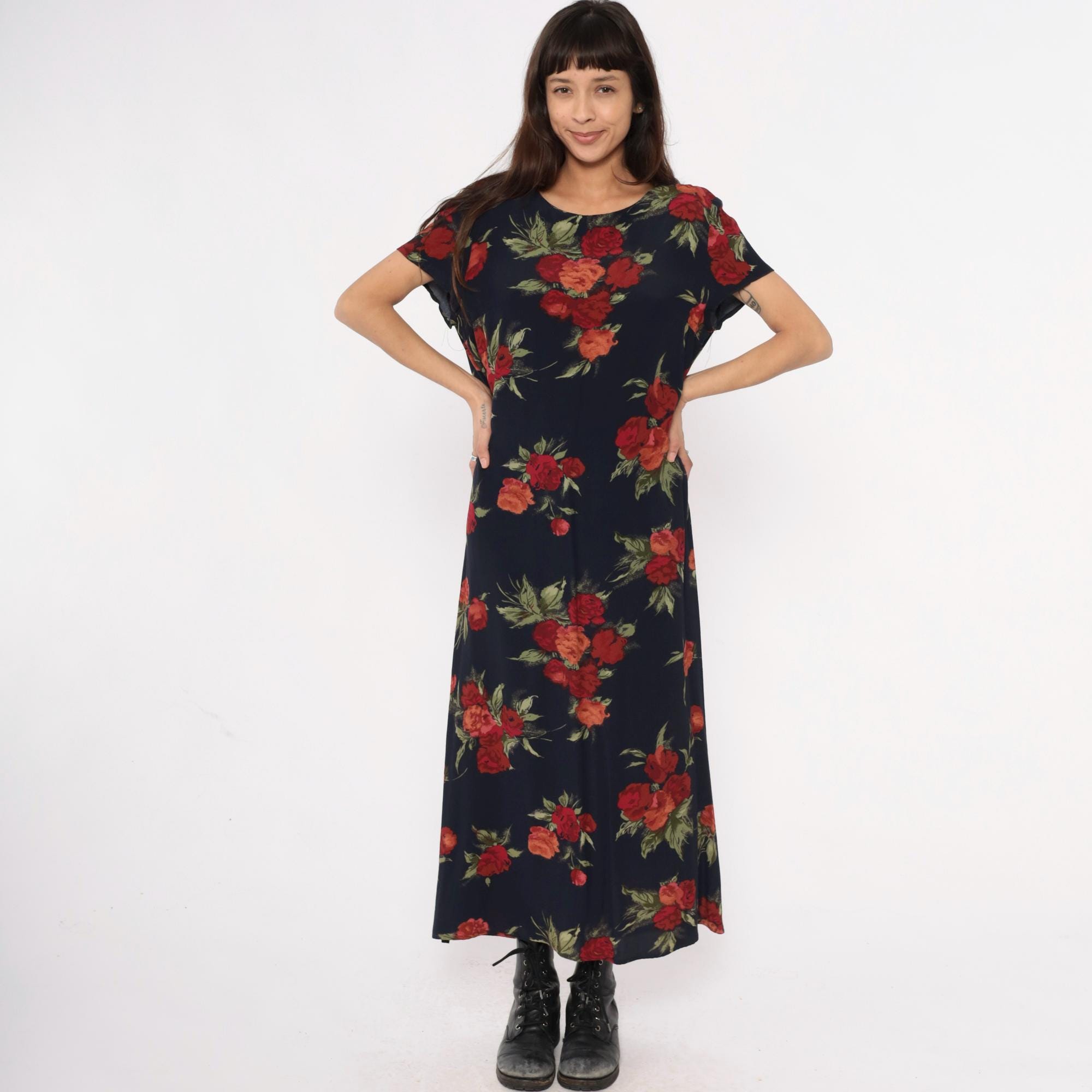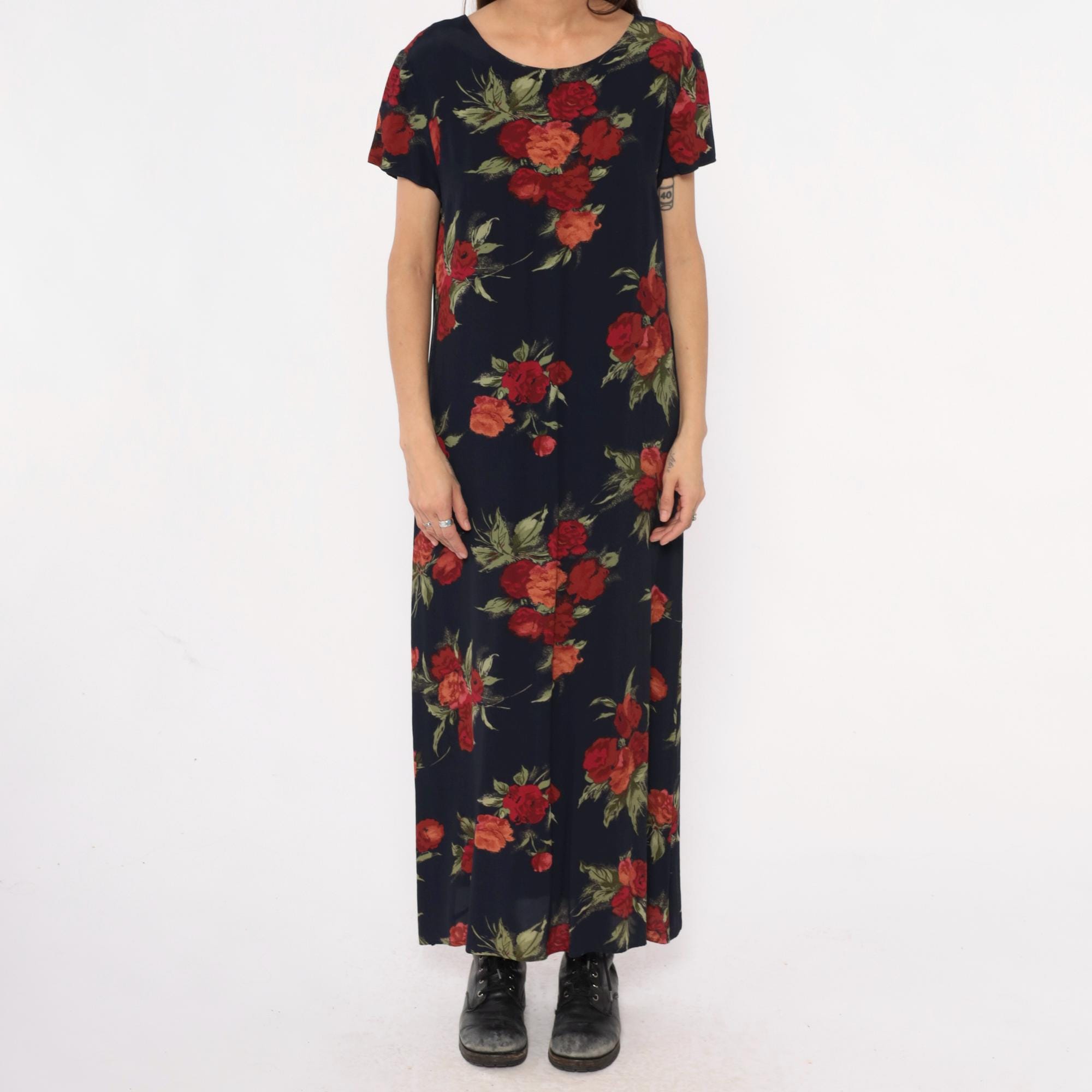 90s dark blue floral maxi dress from Talbots with red, burgundy, and coral rose print and green foliage across the fabric. Round neckline and short sleeves with straight, full-length silhouette.