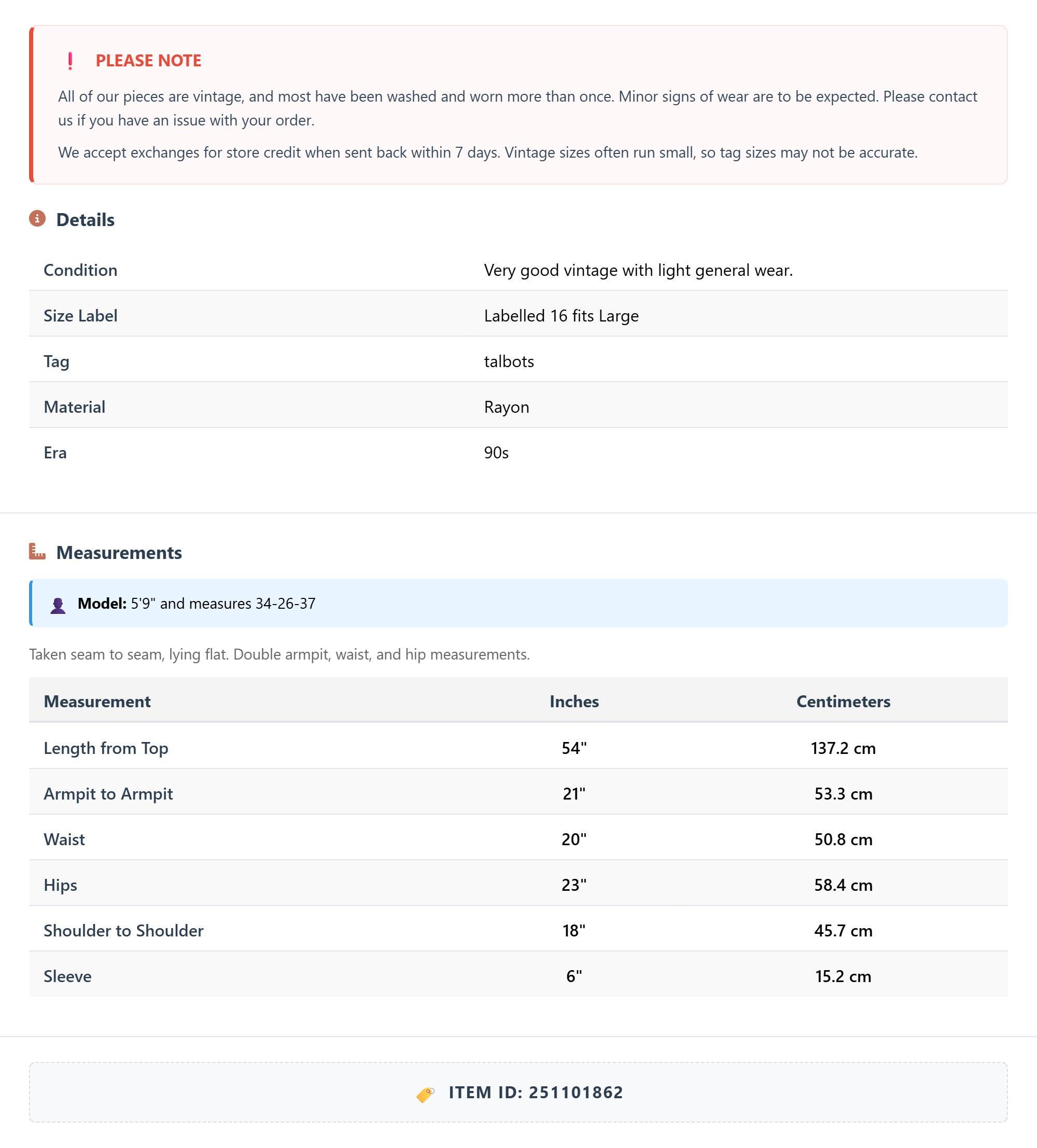 All of our pieces are vintage, and most have been washed and worn more than once. Minor signs of wear are to be expected. Please contact us if you have an issue with your order. We accept exchanges for store credit when sent back within 7 days.
