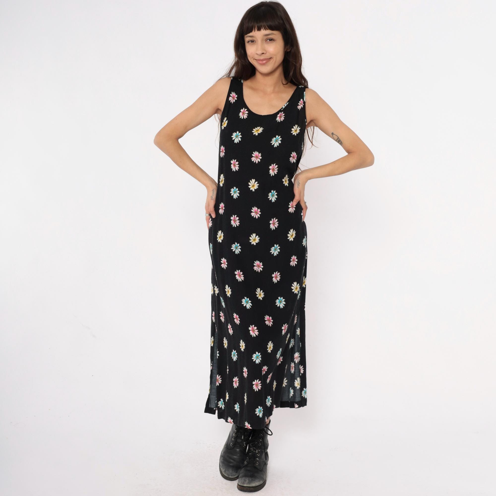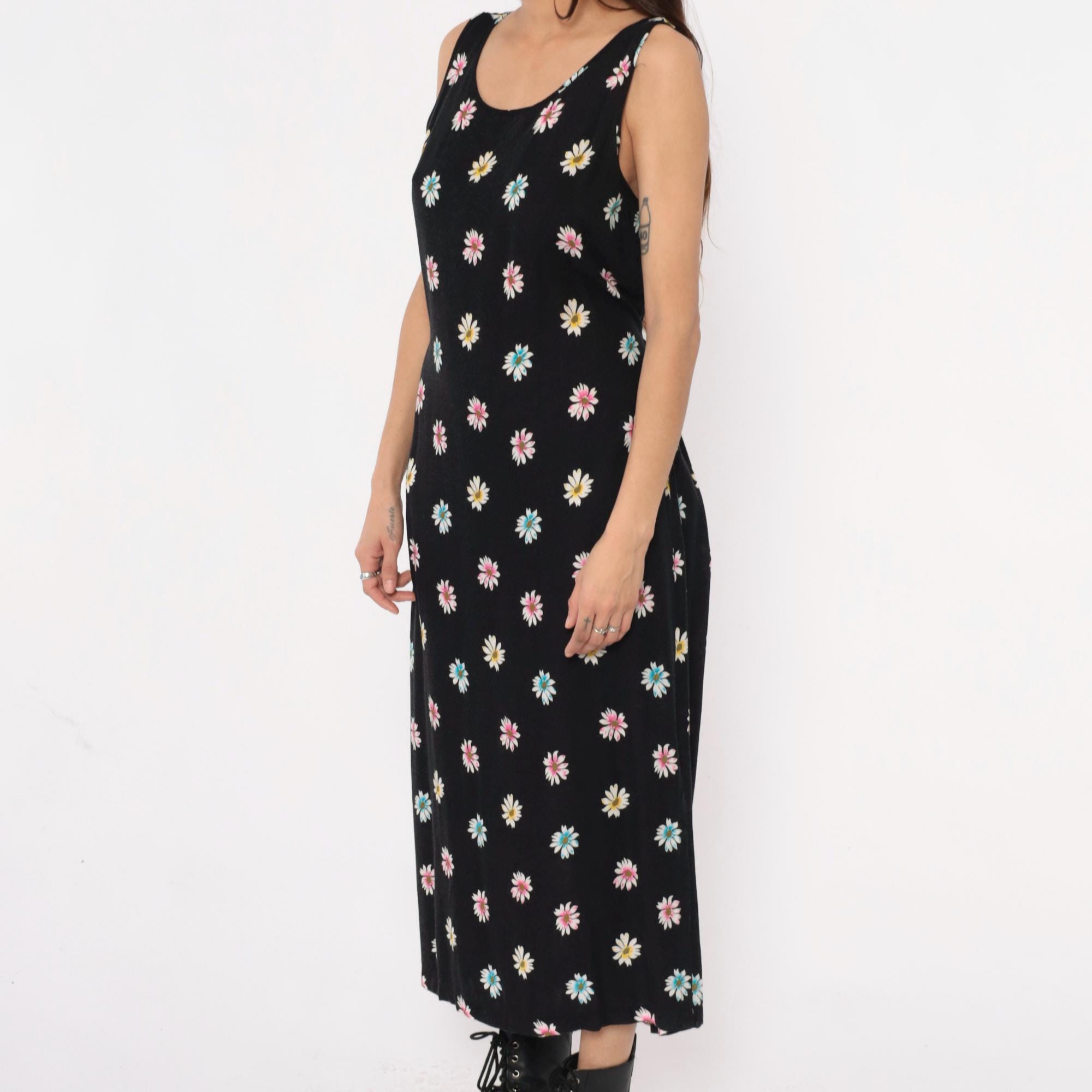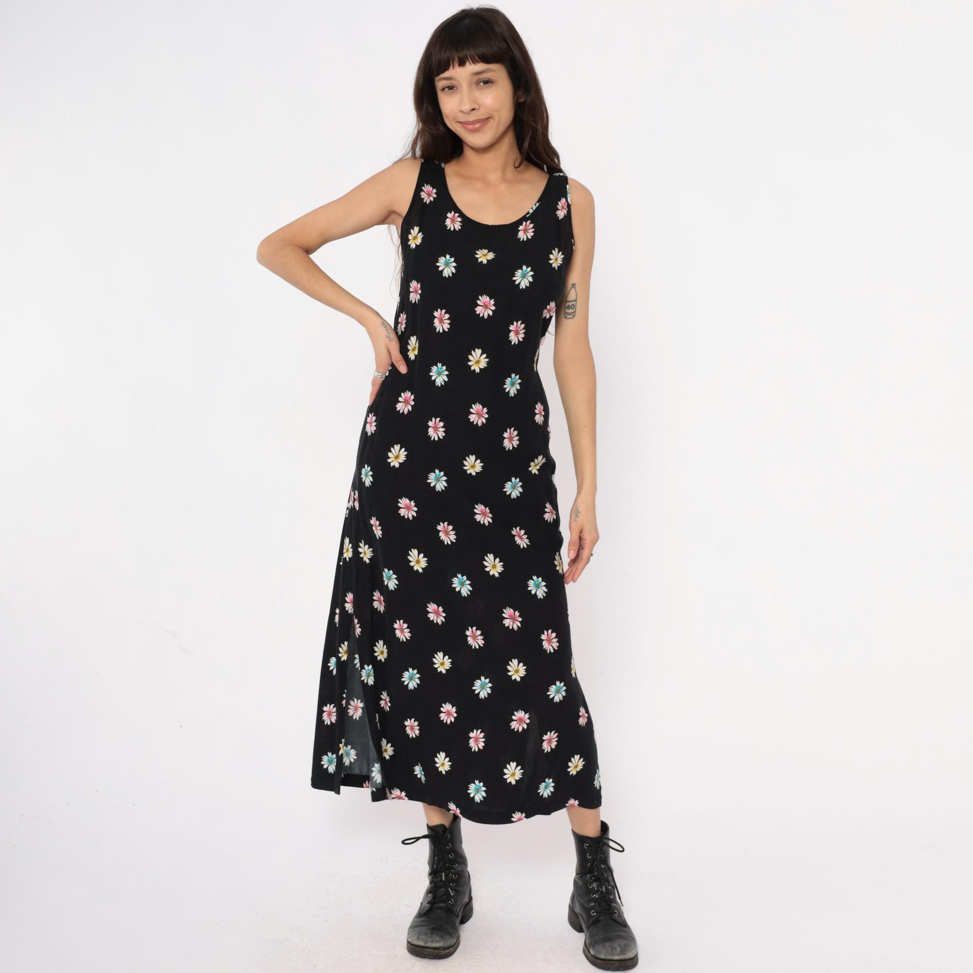 90s black maxi dress from ja studio with scattered daisy print in pink, yellow, blue, and white. Sleeveless tank style with scoop neckline, fitted bodice, full-length skirt.
