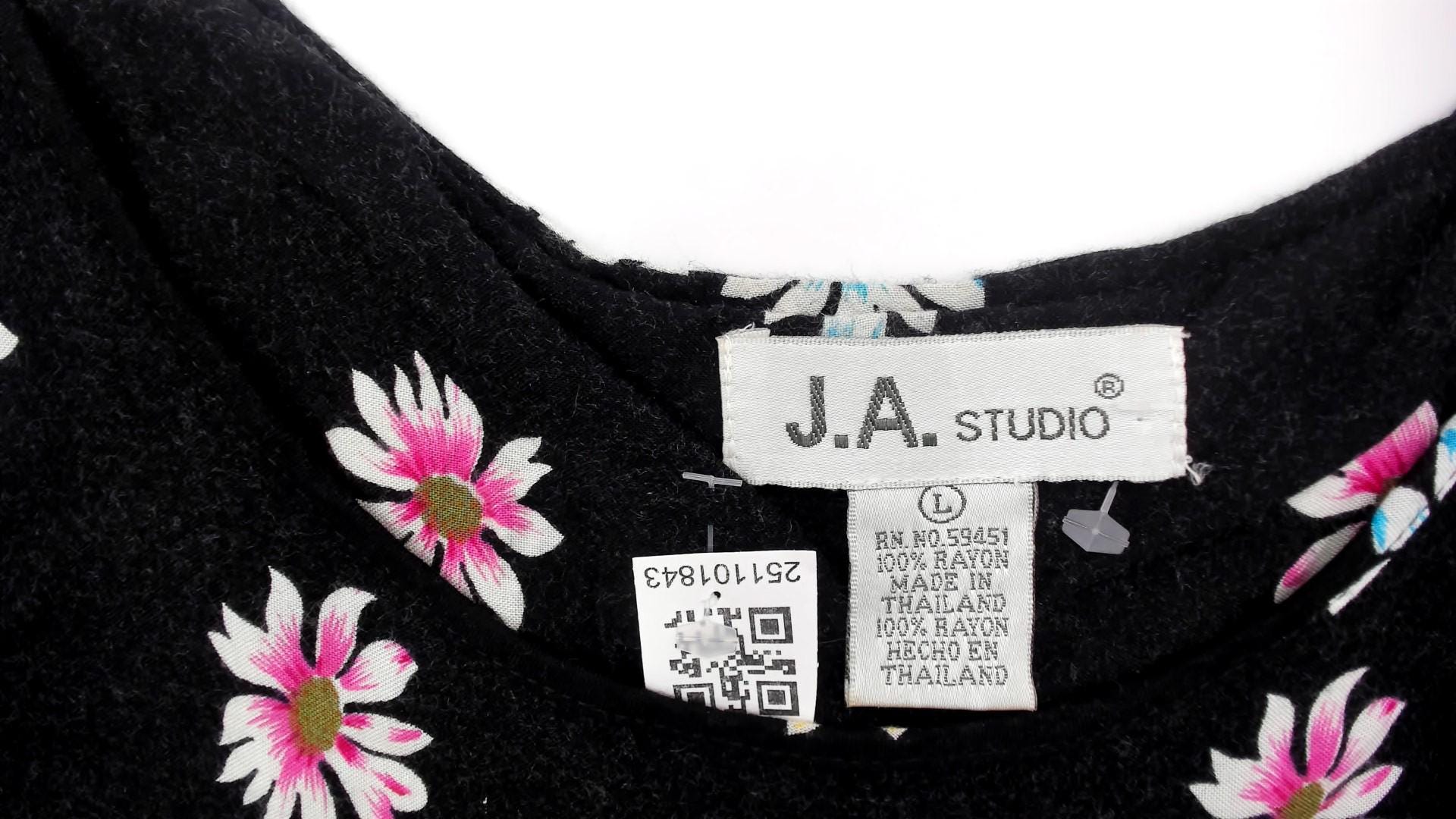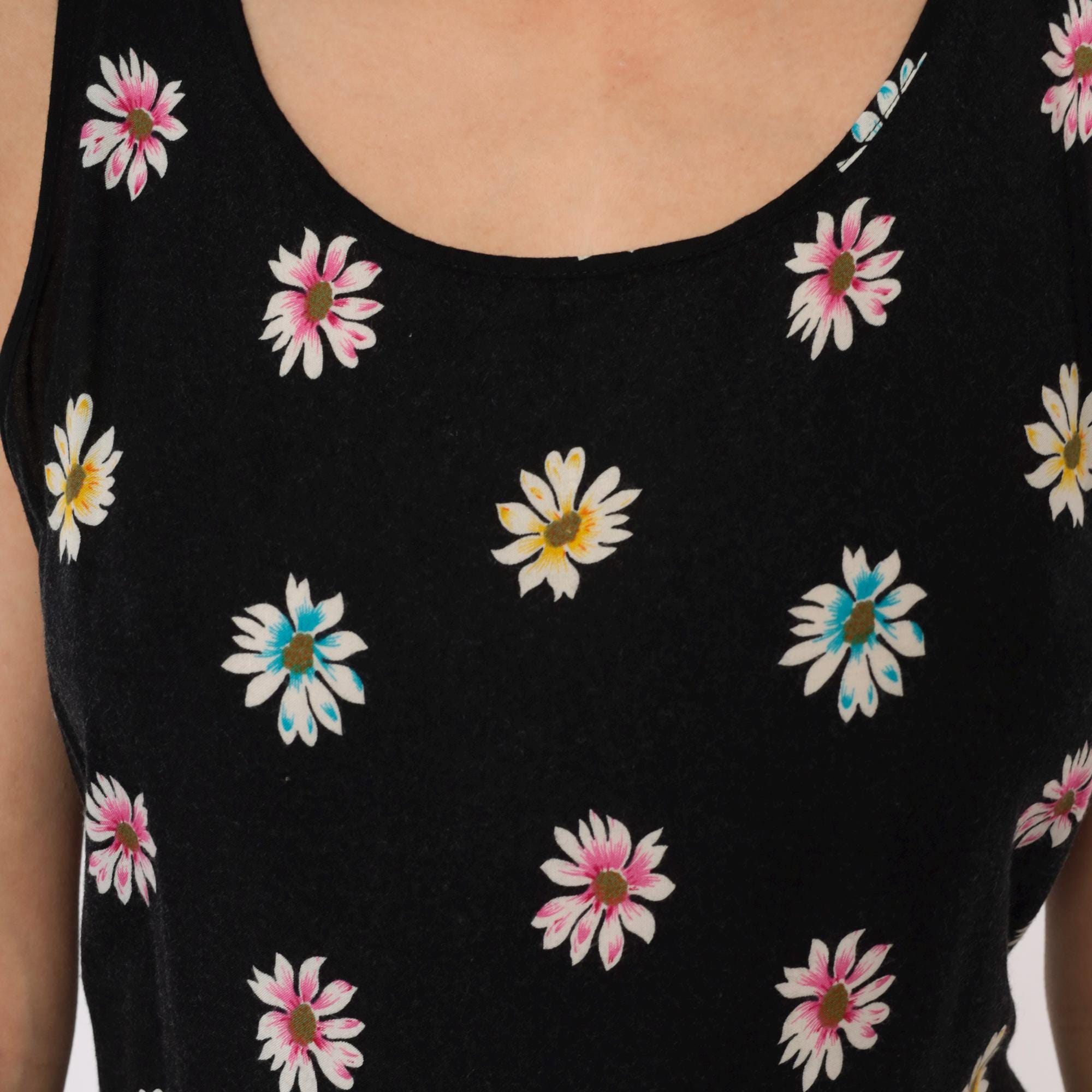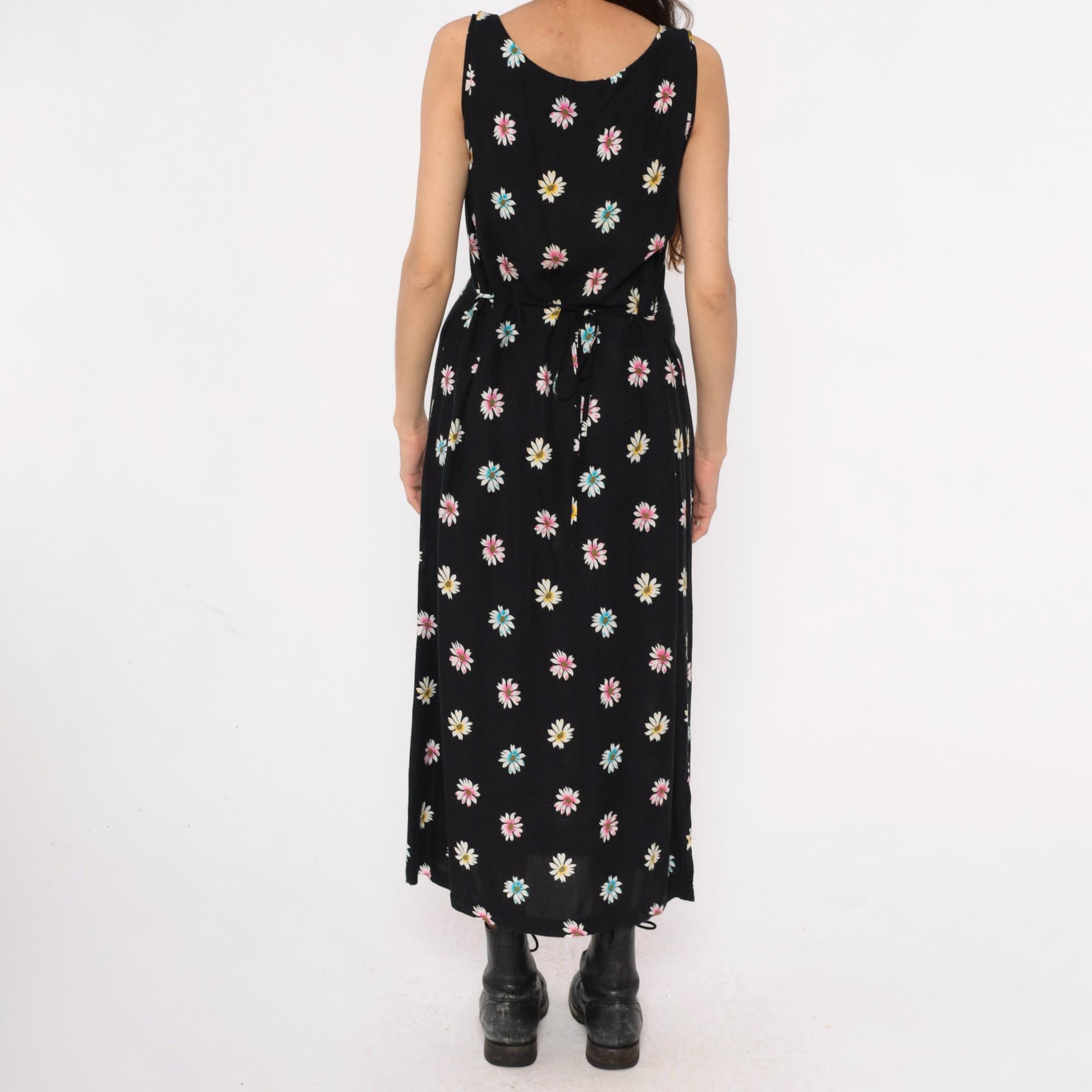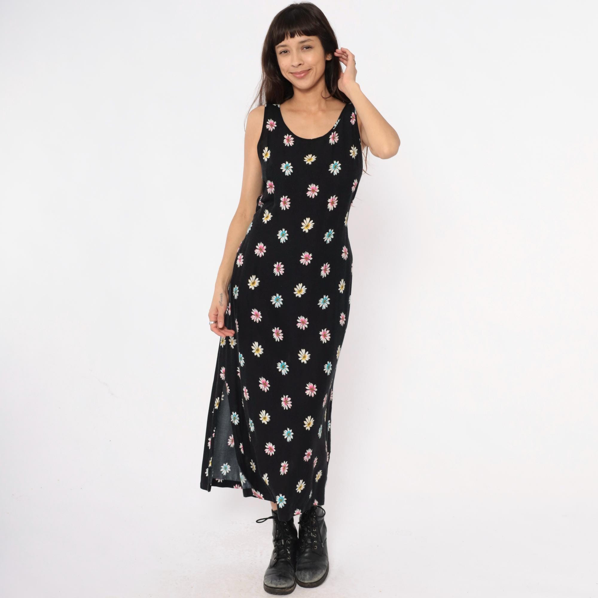 90s black maxi dress from ja studio with scattered daisy print in pink, yellow, blue, and white. Sleeveless tank style with scoop neckline, fitted bodice, full-length skirt.