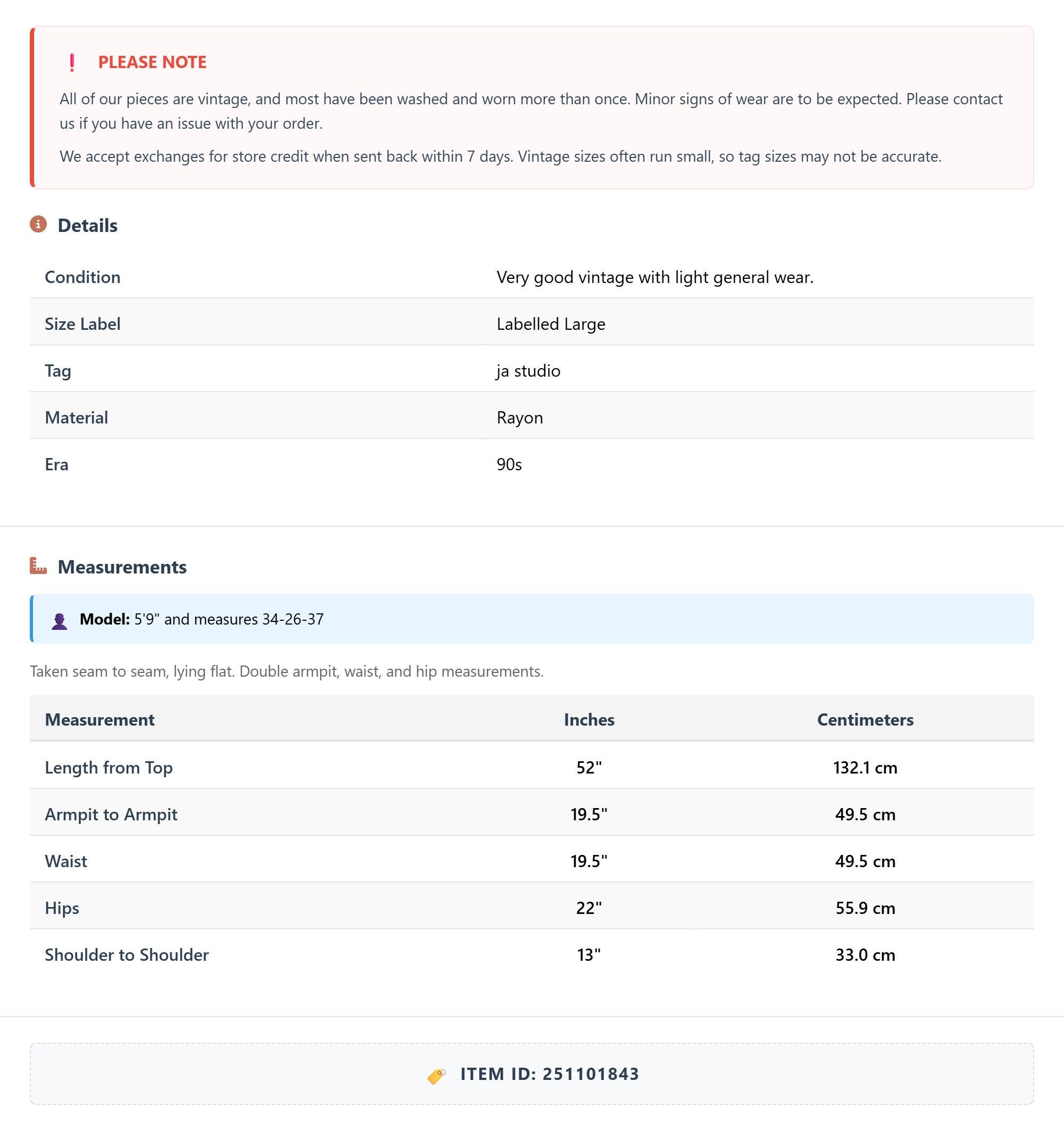 All of our pieces are vintage, and most have been washed and worn more than once. Minor signs of wear are to be expected. Please contact us if you have an issue with your order. We accept exchanges for store credit when sent back within 7 days.