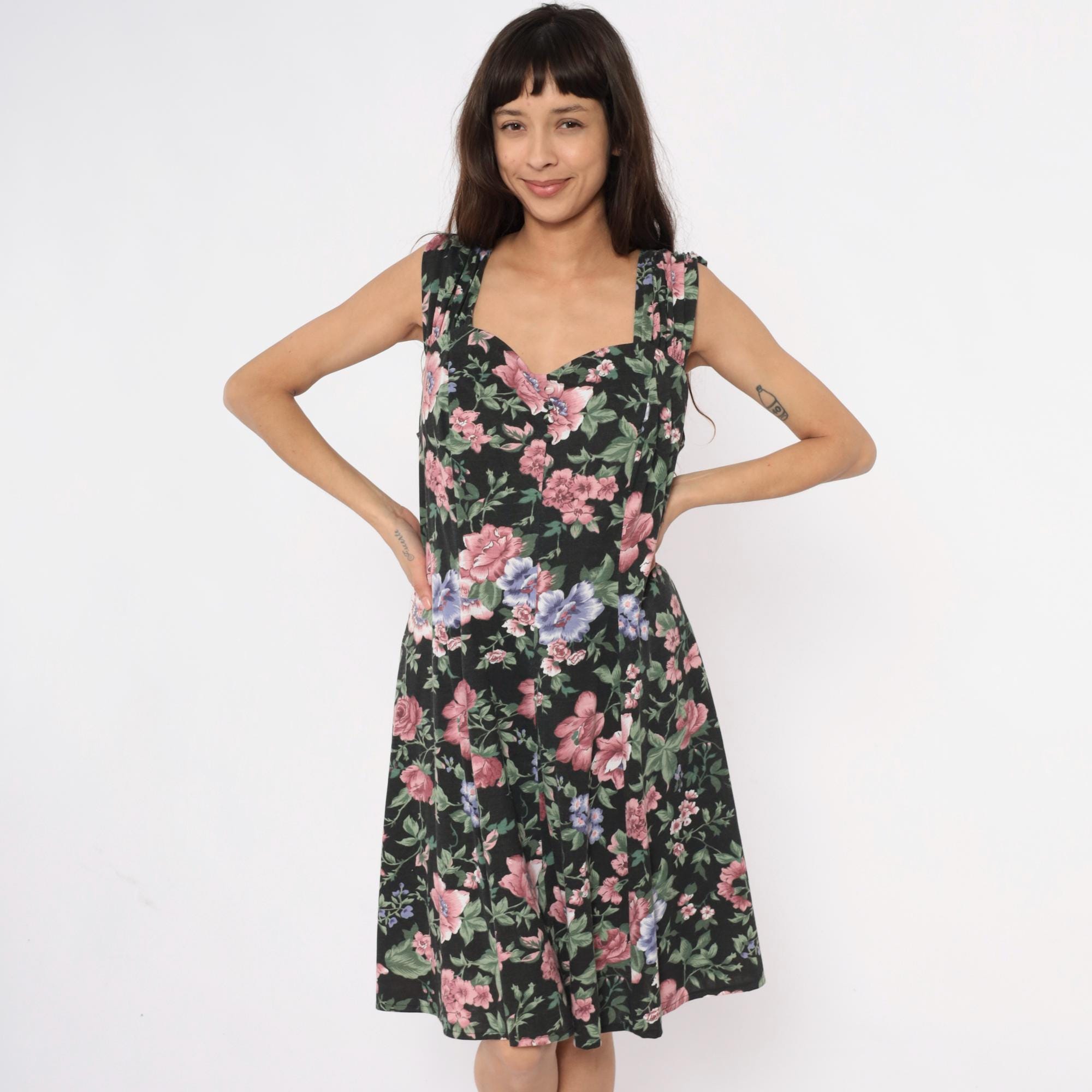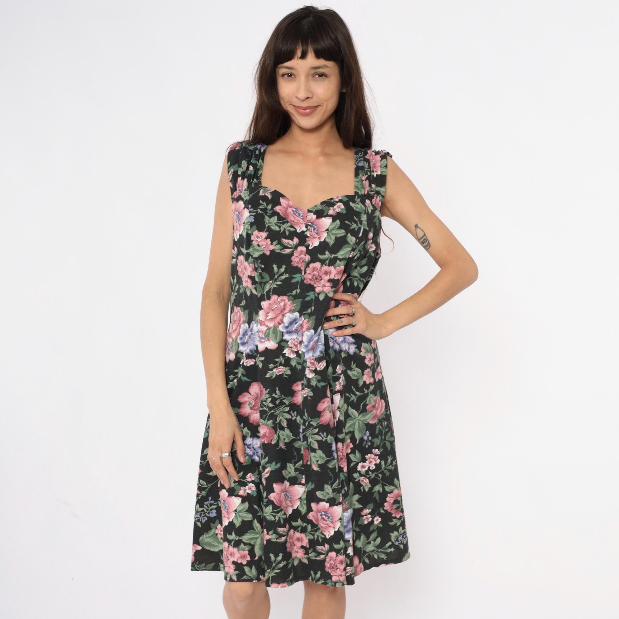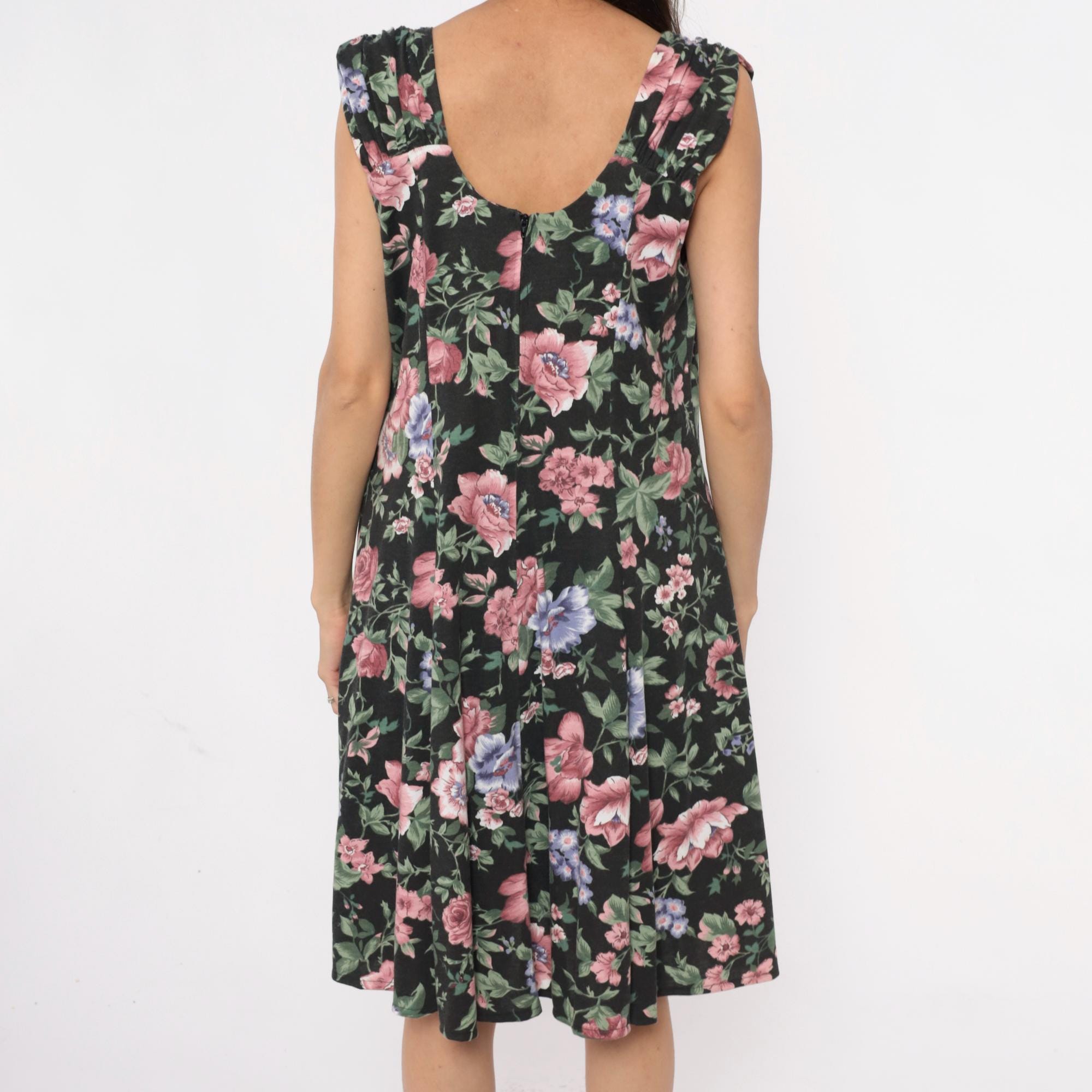 90s black floral knee length dress with pink roses, blue flowers, and green foliage across the fabric. Sleeveless with gathered ruffle straps, V-neckline at front and scooped back neckline with ruffle trim.