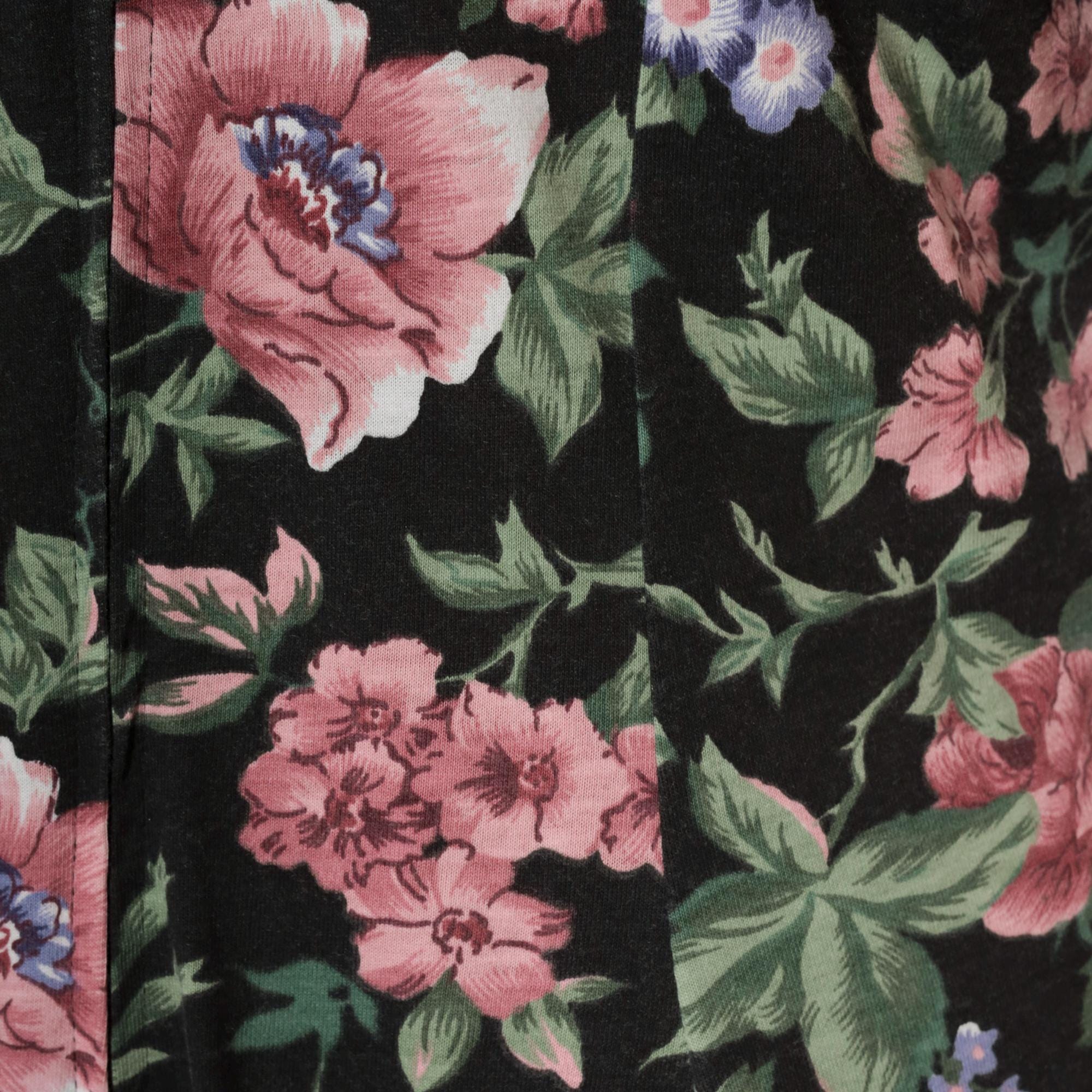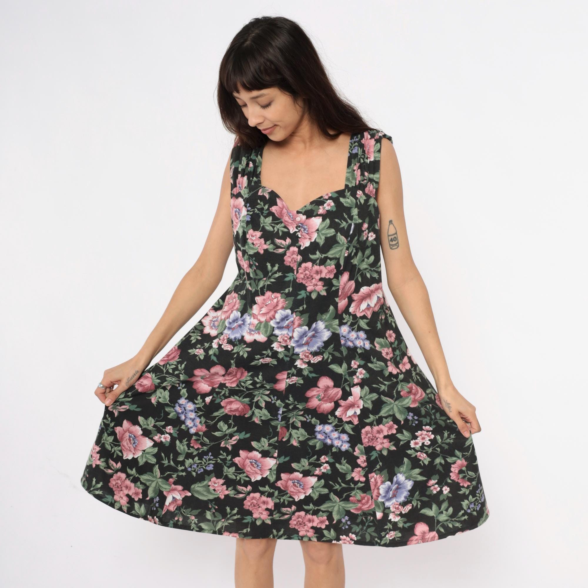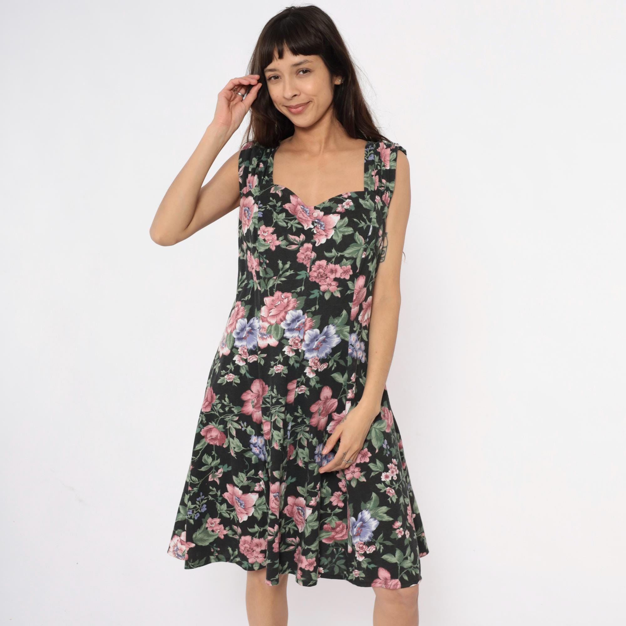 90s black floral knee length dress with pink roses, blue flowers, and green foliage across the fabric. Sleeveless with gathered ruffle straps, V-neckline at front and scooped back neckline with ruffle trim.