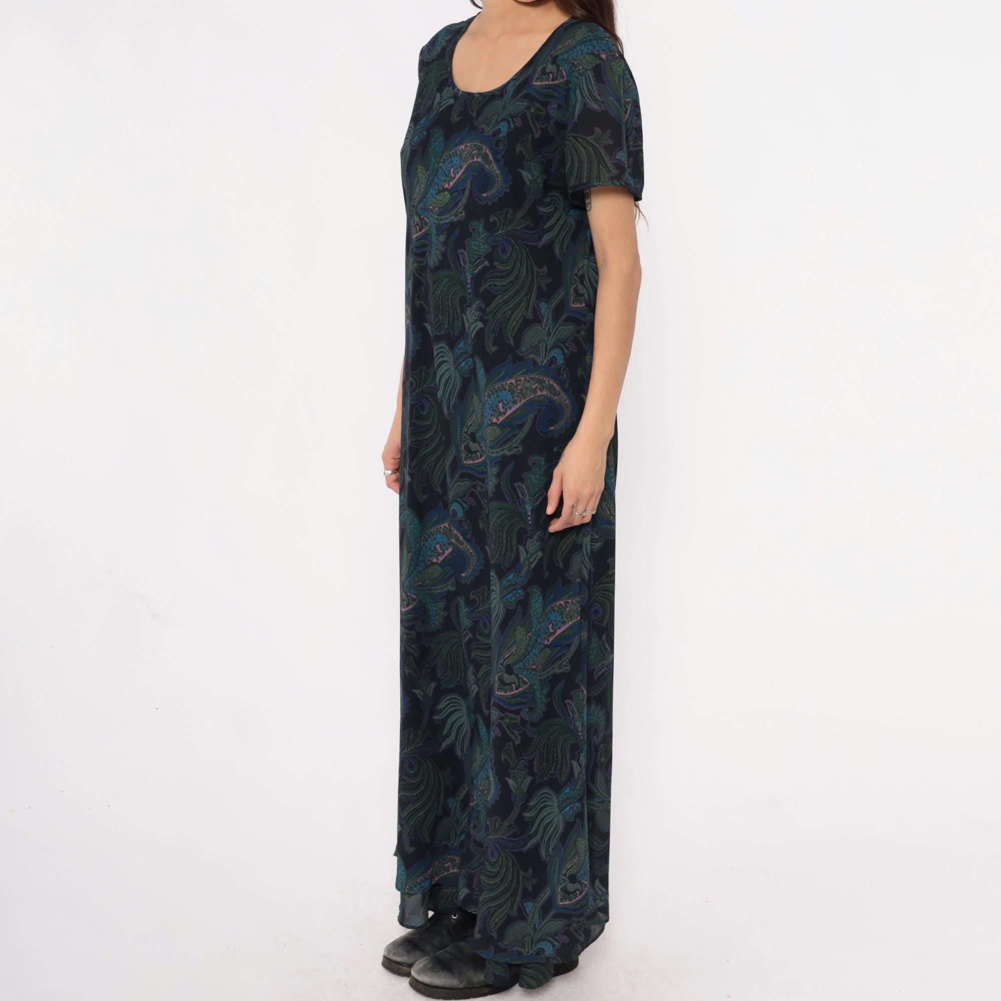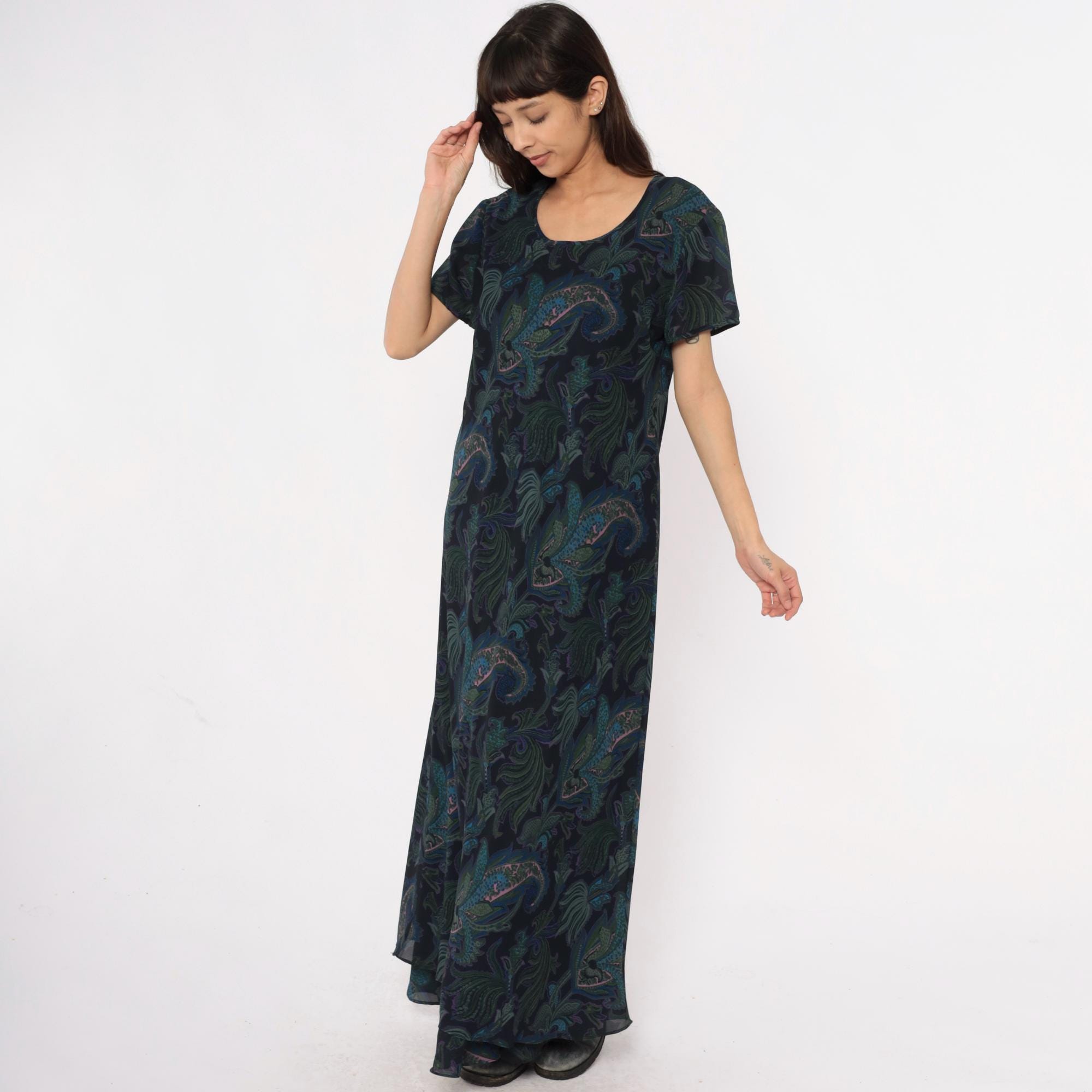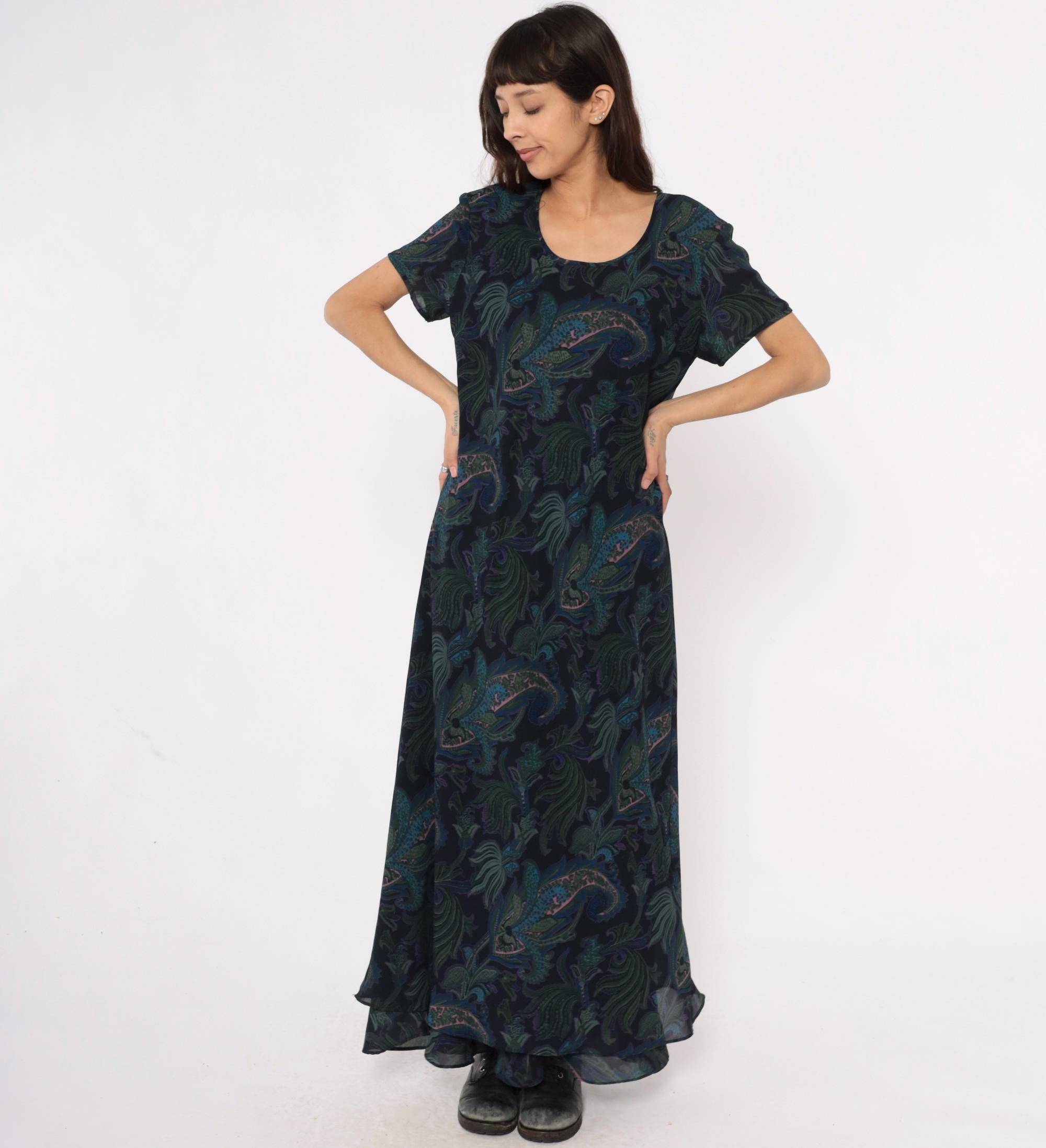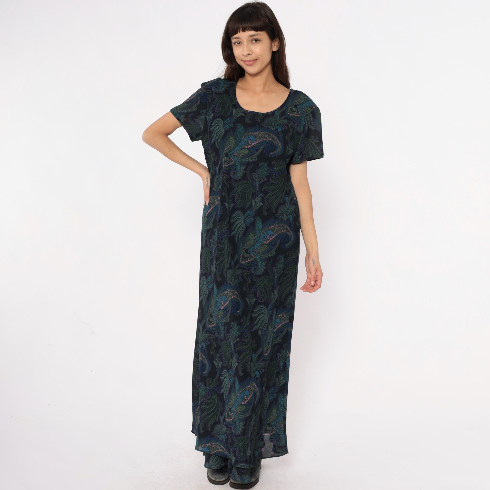 90s dark paisley maxi dress from Jessica Howard with ornate swirling pattern in shades of blue, green, and pink throughout. Scoop neckline, short sleeves, straight column silhouette.