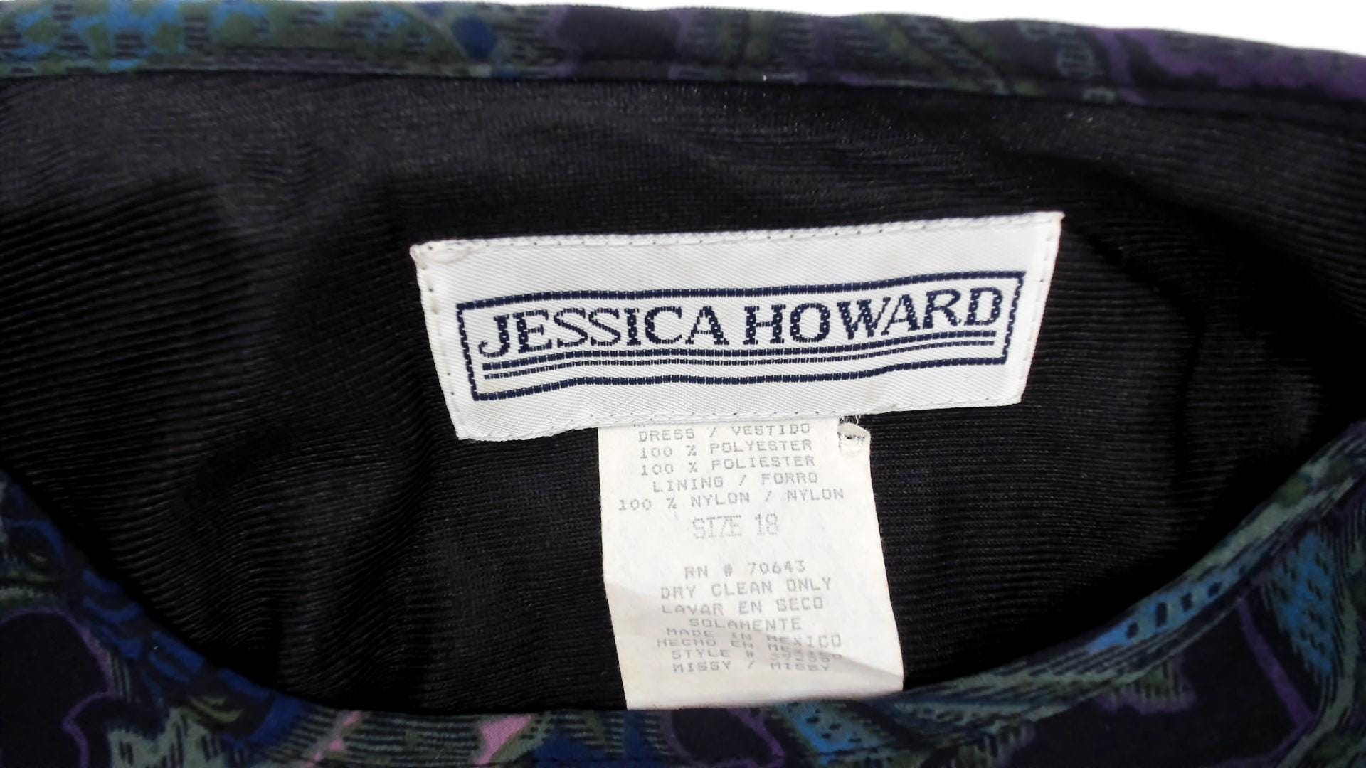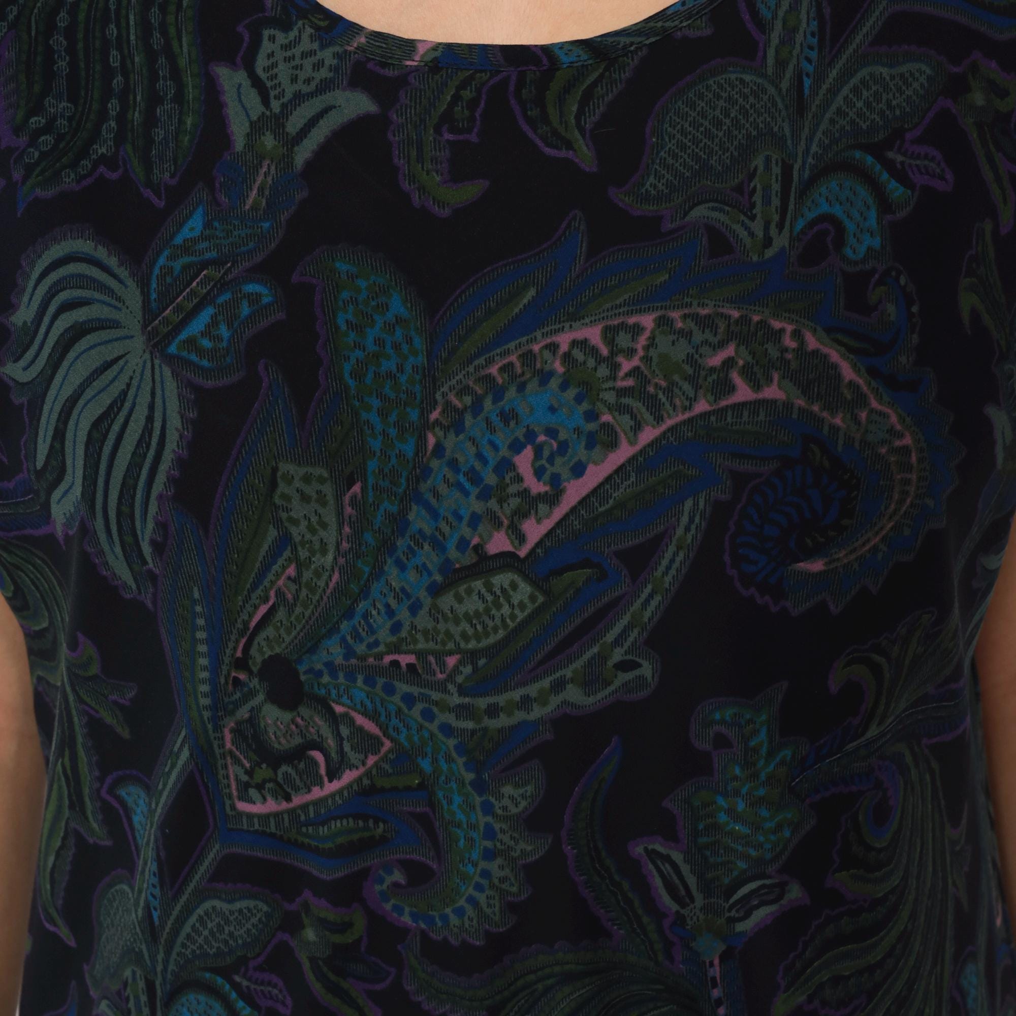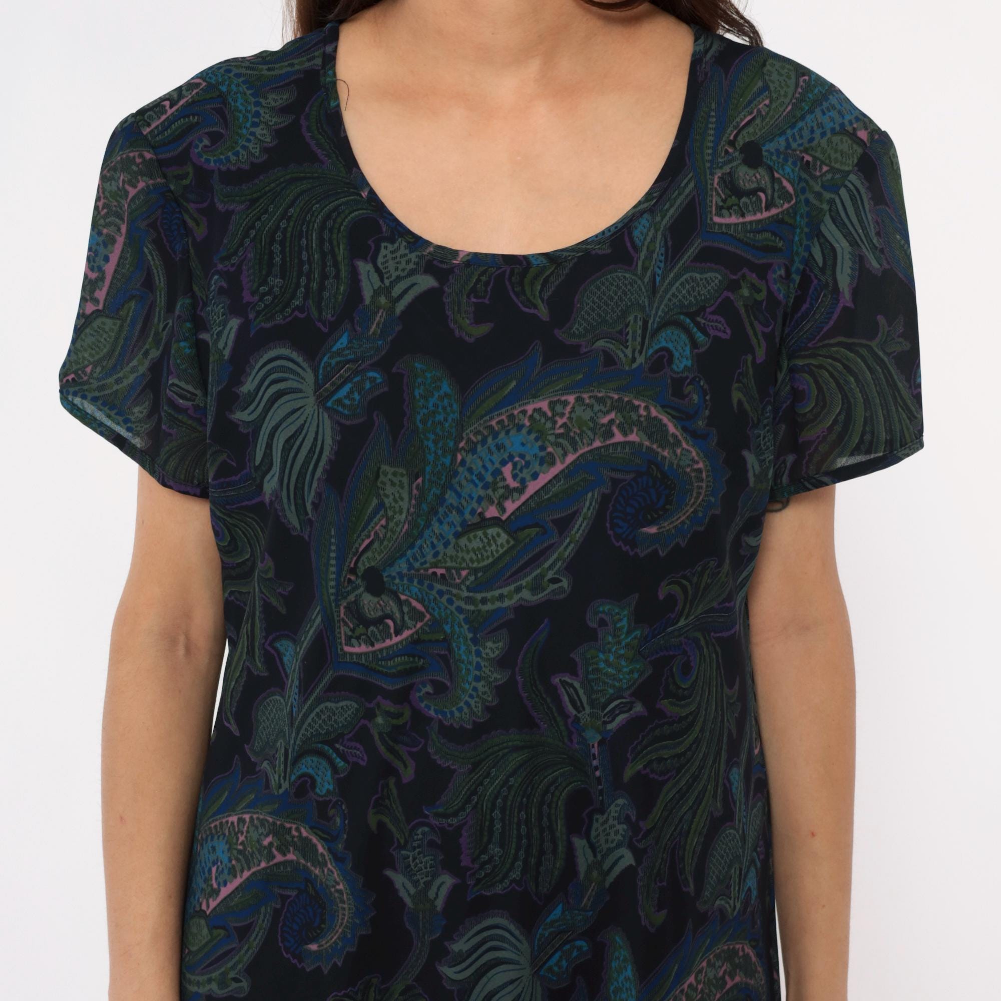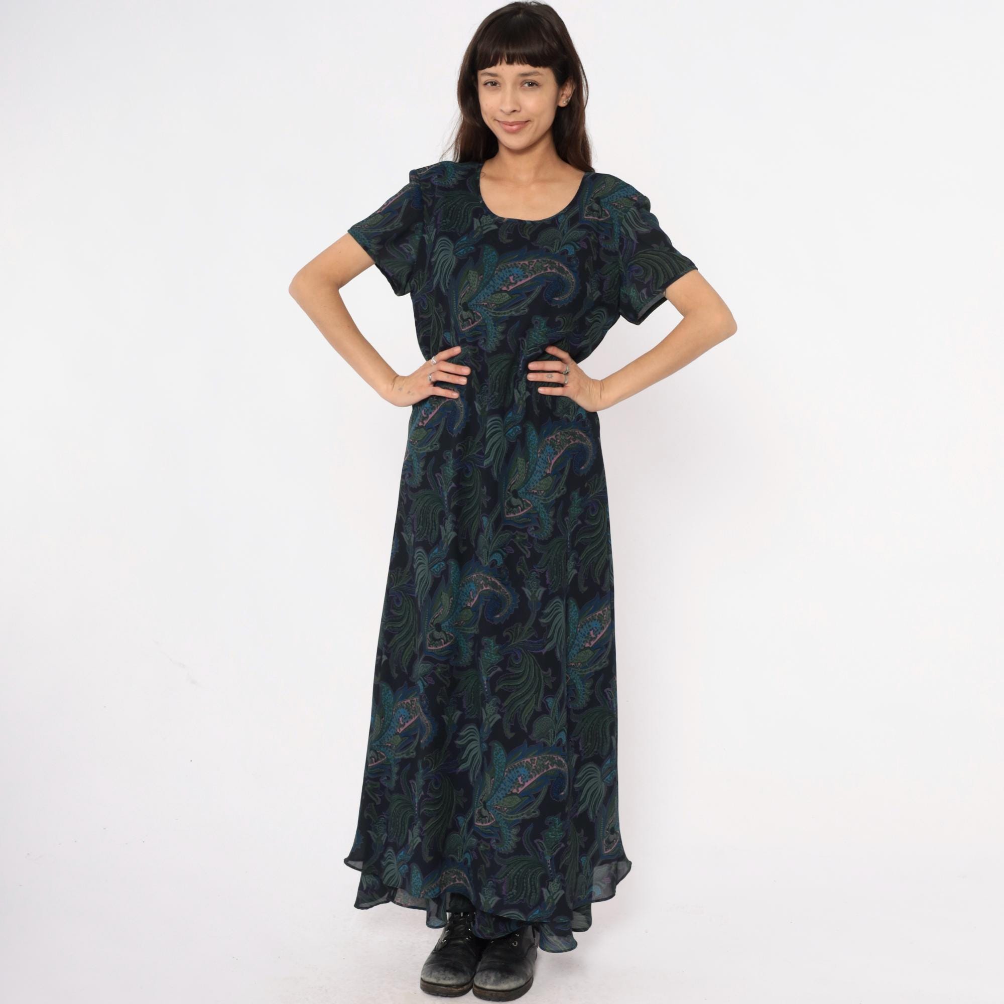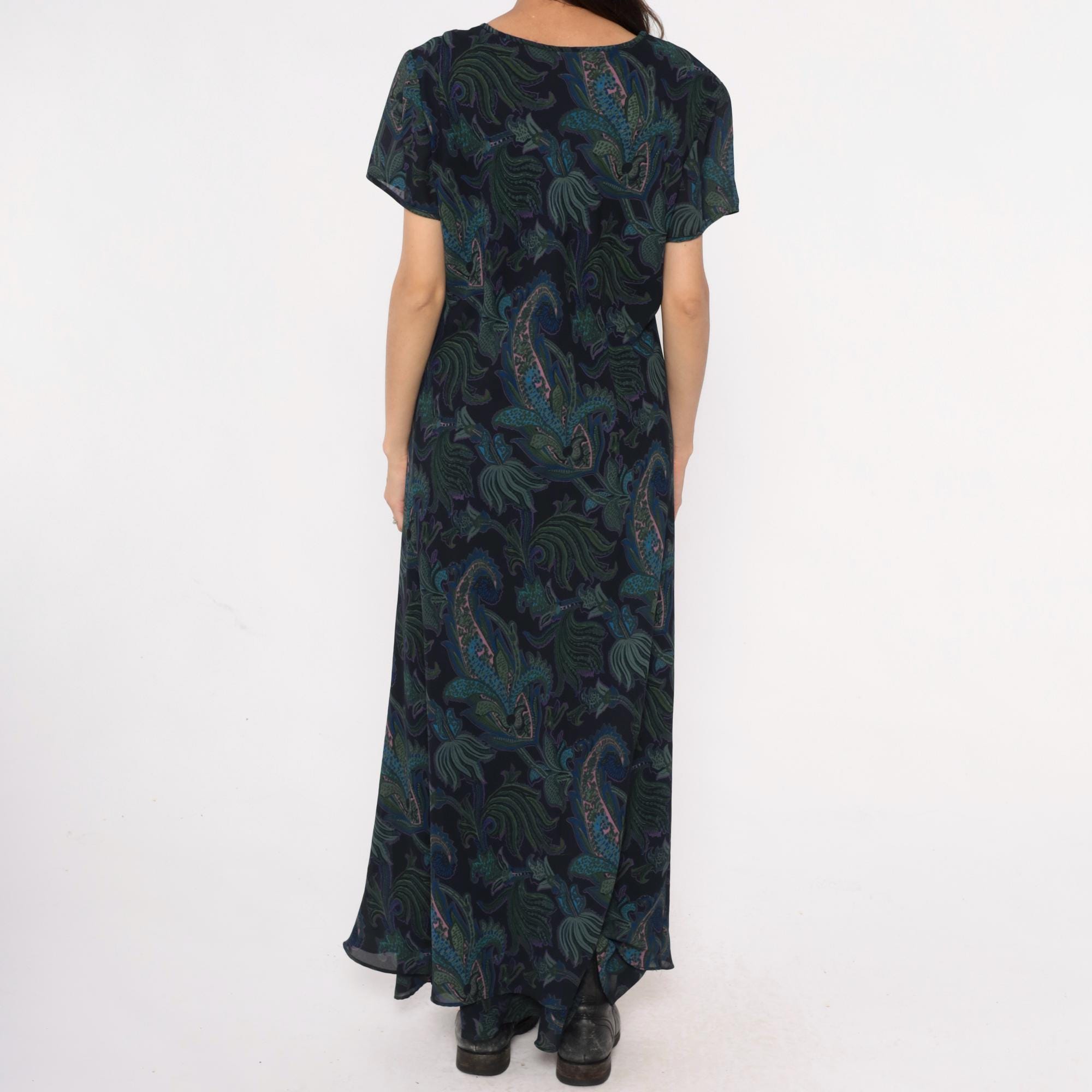 90s dark paisley maxi dress from Jessica Howard with ornate swirling pattern in shades of blue, green, and pink throughout. Scoop neckline, short sleeves, straight column silhouette.