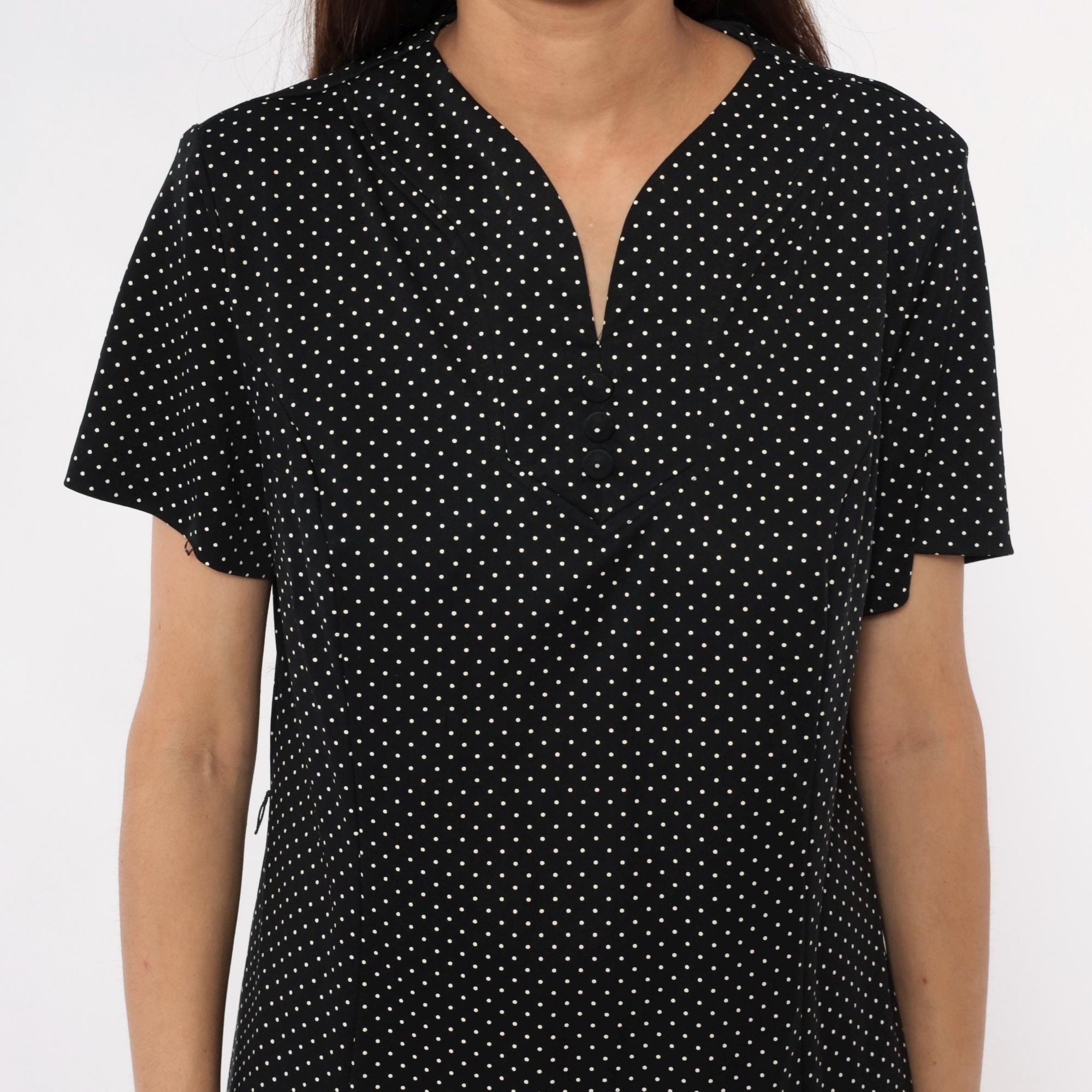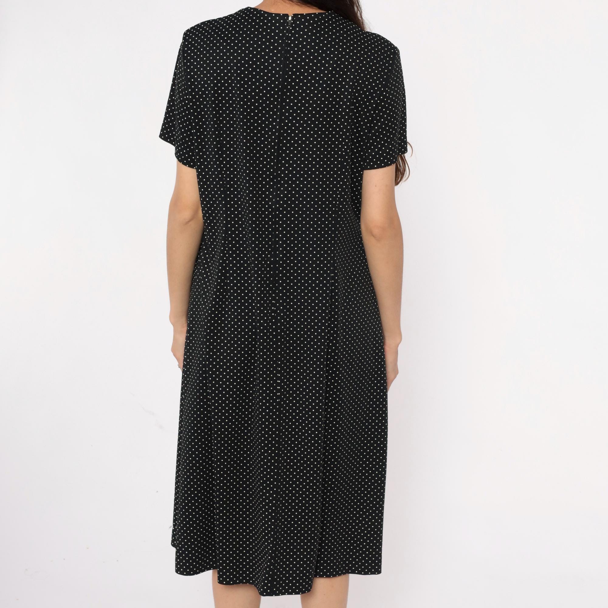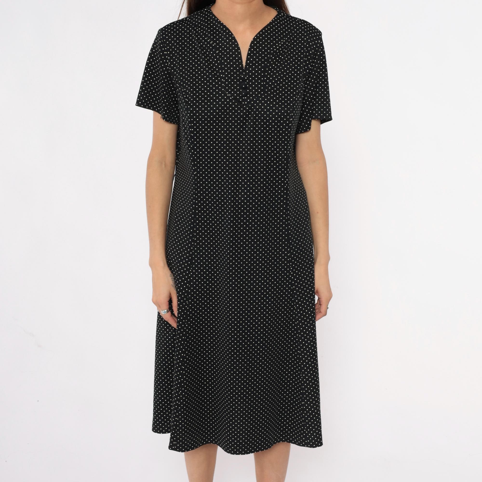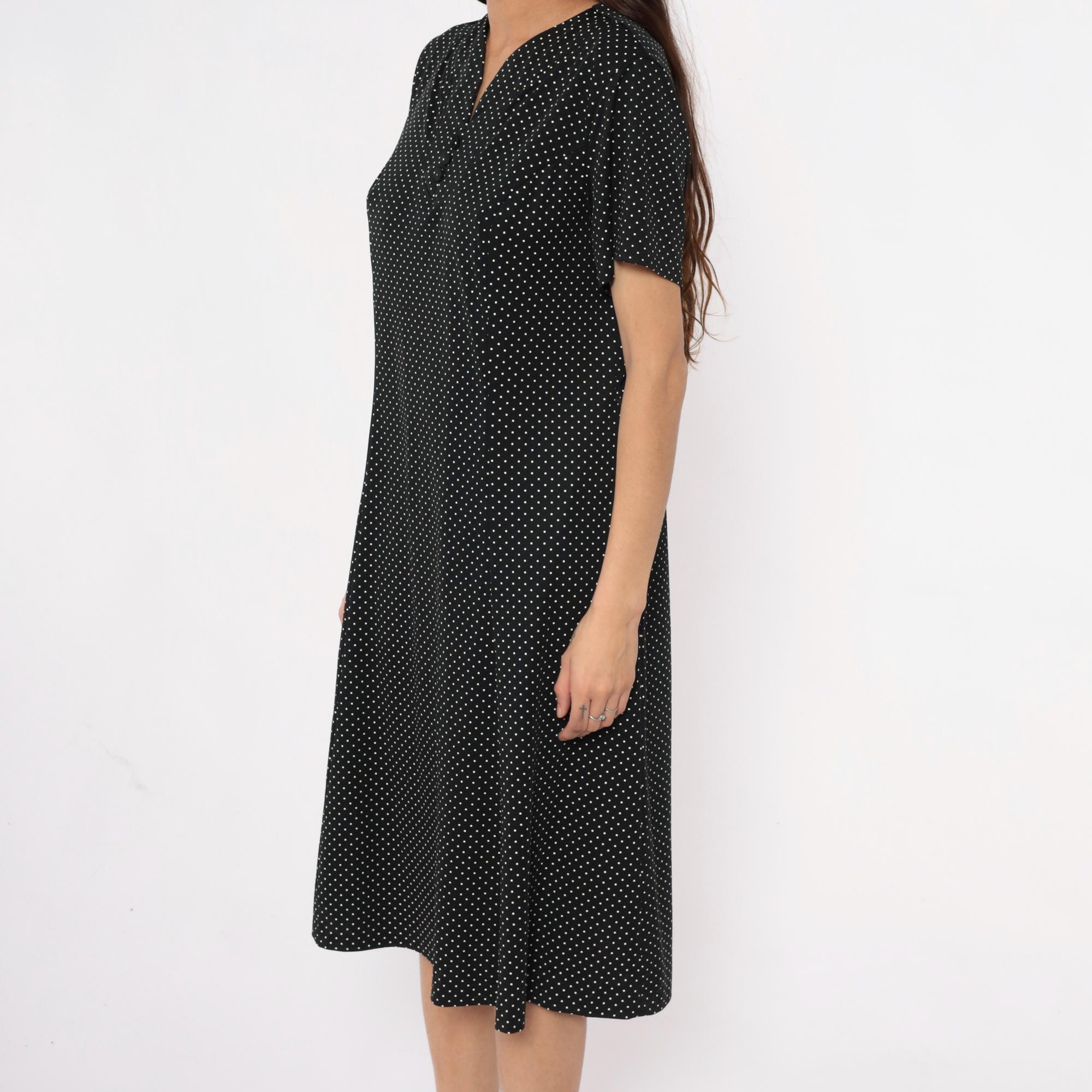 90s black polka dot midi dress with white dots across the fabric. V-neck collar with short sleeves and straight skirt falling past the knee. Simple pullover style with minimal details.
