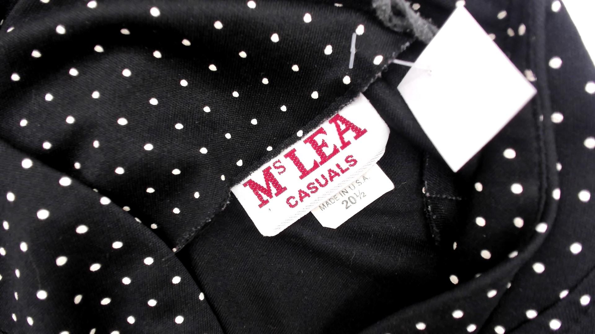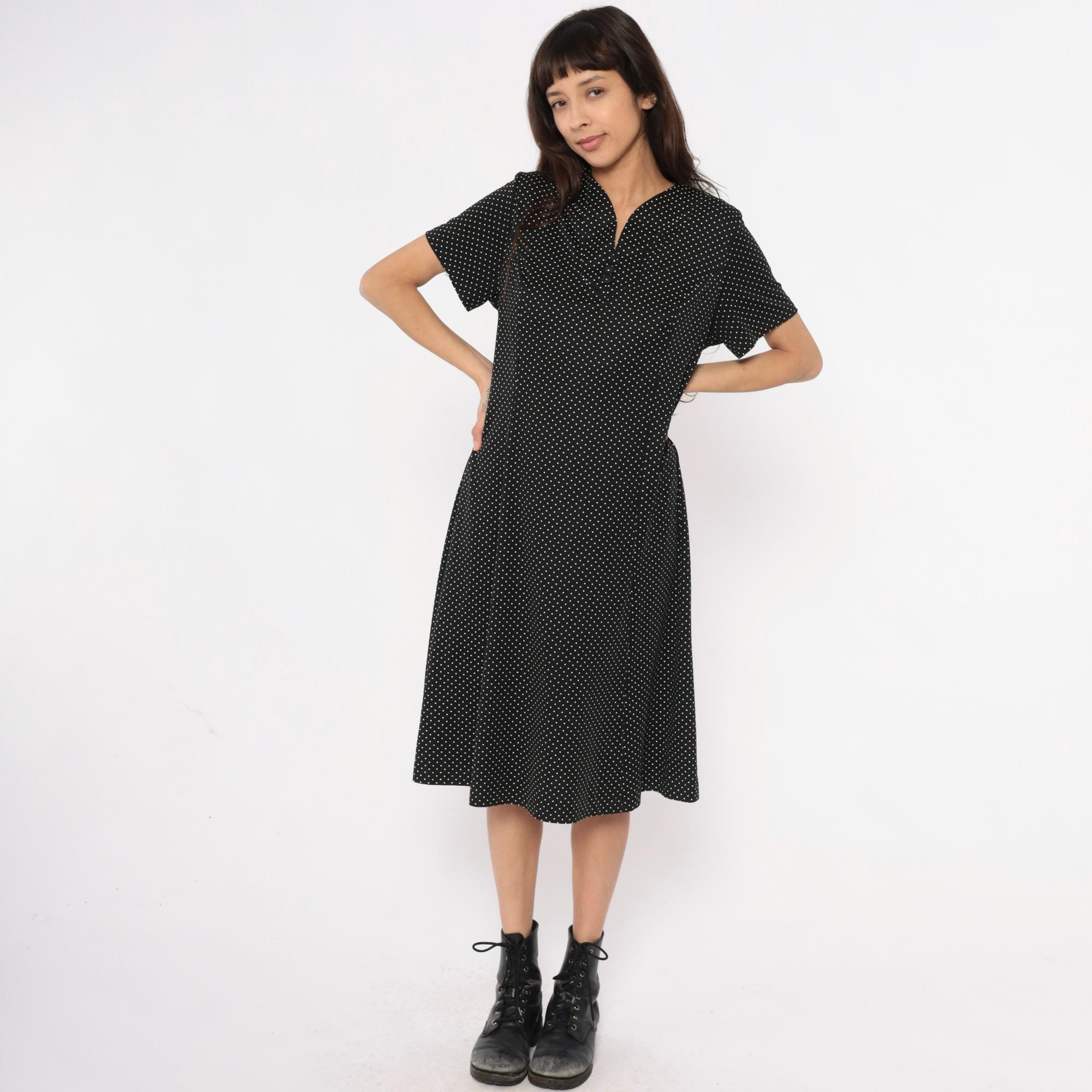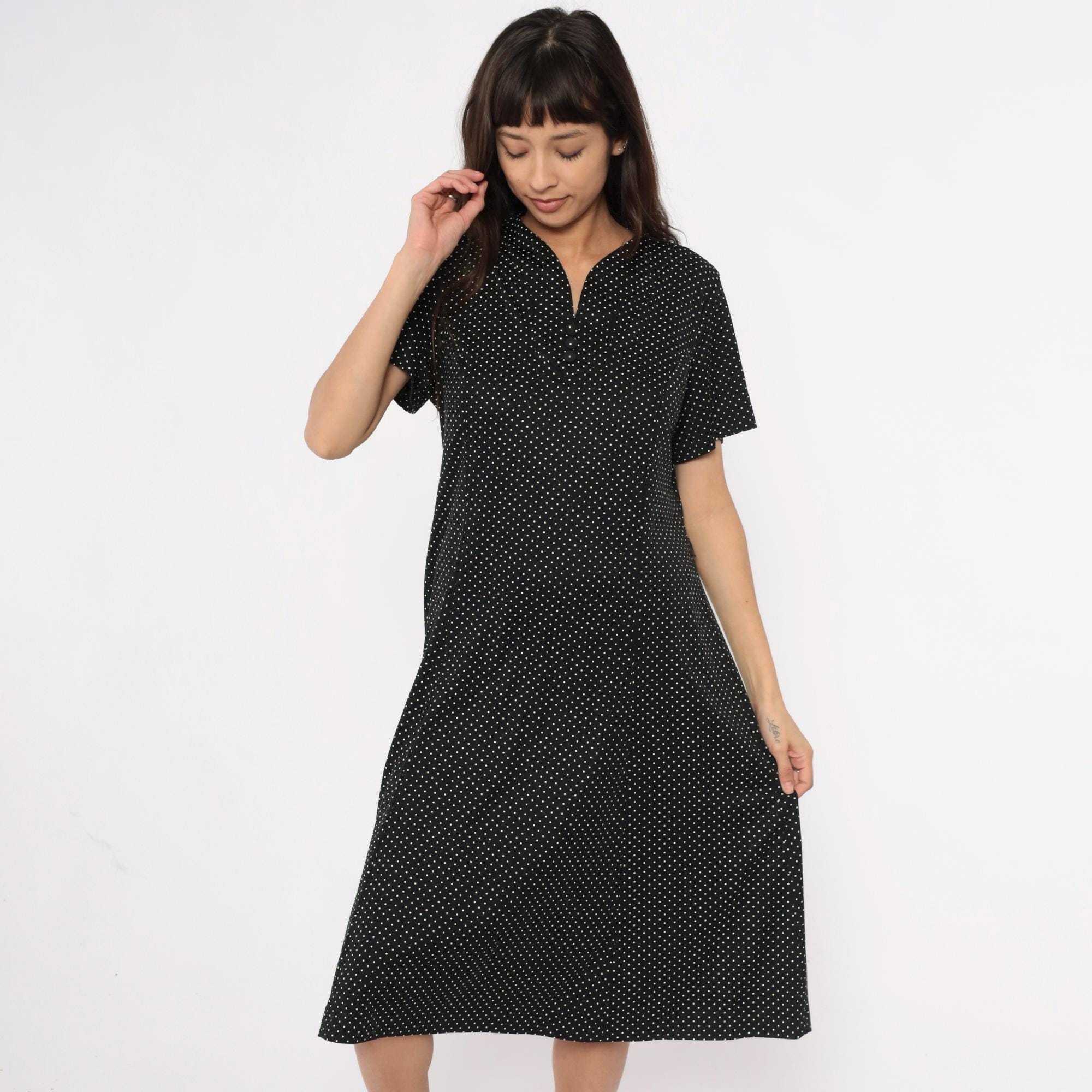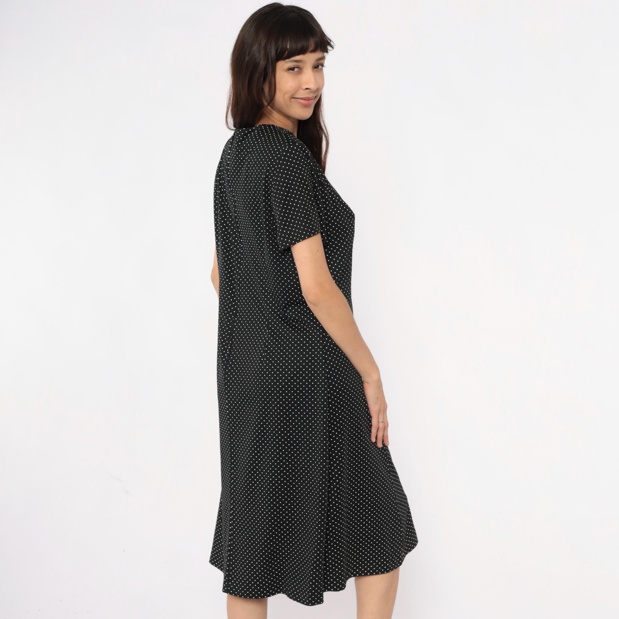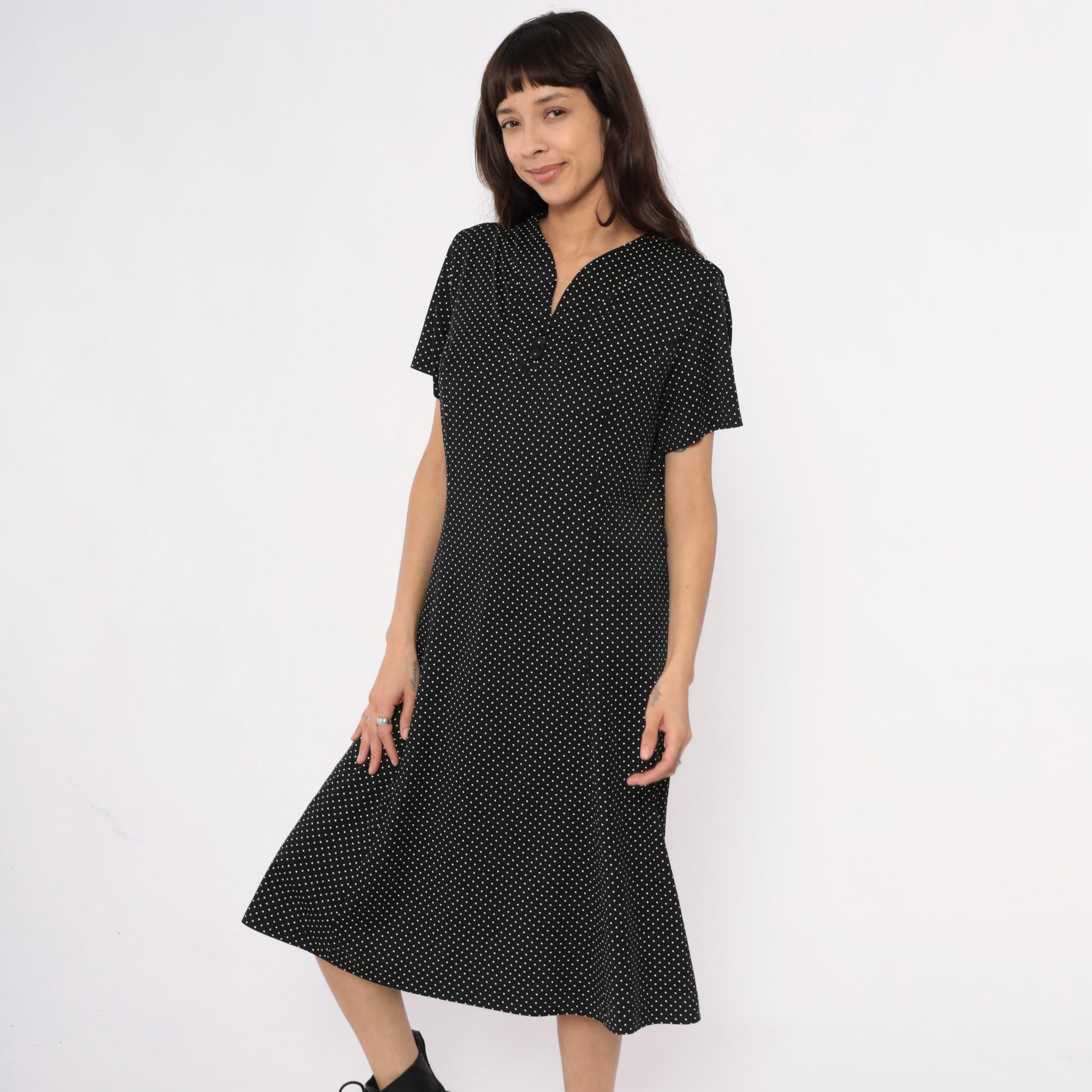 90s black polka dot midi dress with white dots across the fabric. V-neck collar with short sleeves and straight skirt falling past the knee. Simple pullover style with minimal details.
