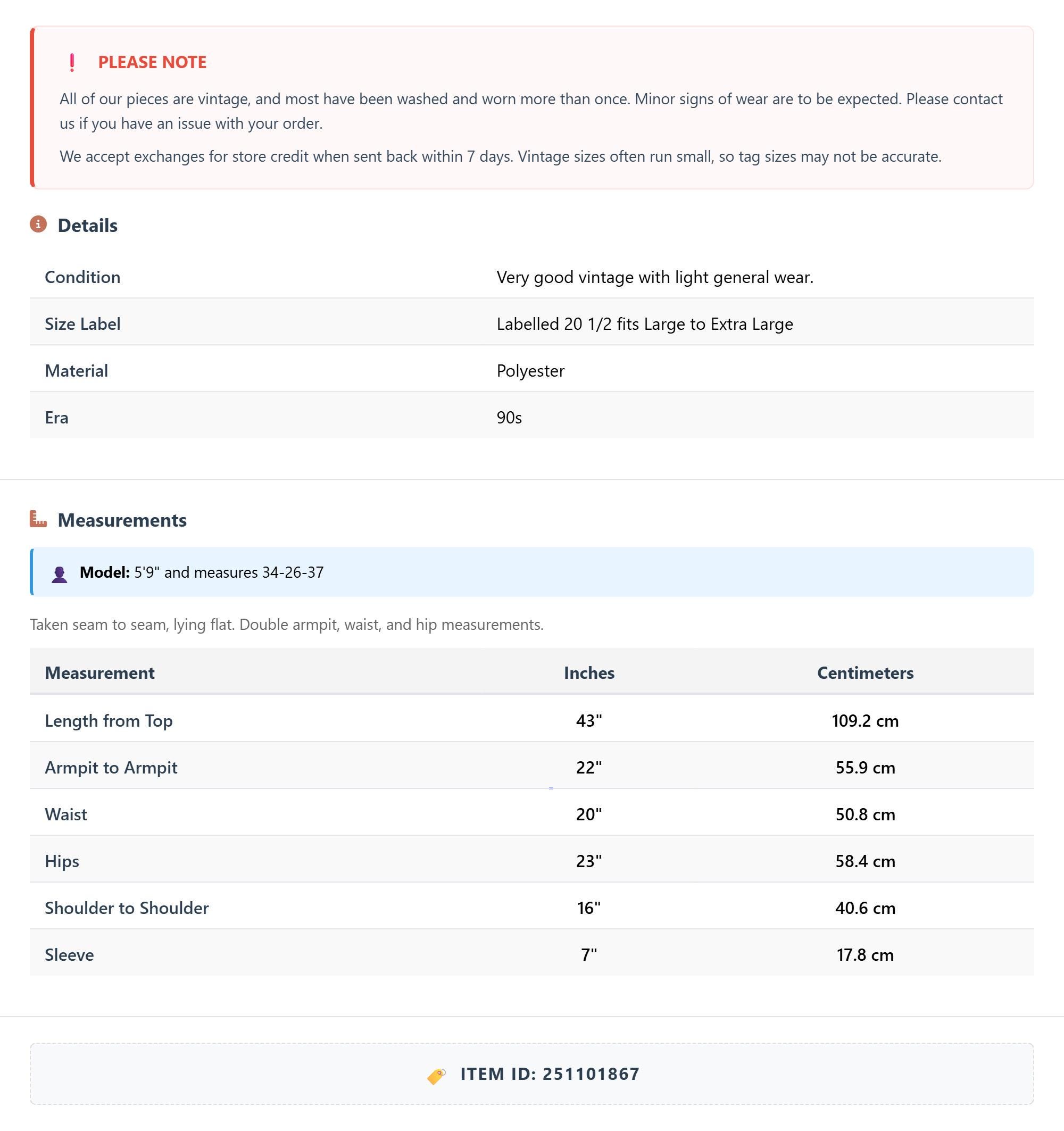 All of our pieces are vintage, and most have been washed and worn more than once. Minor signs of wear are to be expected. Please contact us if you have an issue with your order. We accept exchanges for store credit when sent back within 7 days.