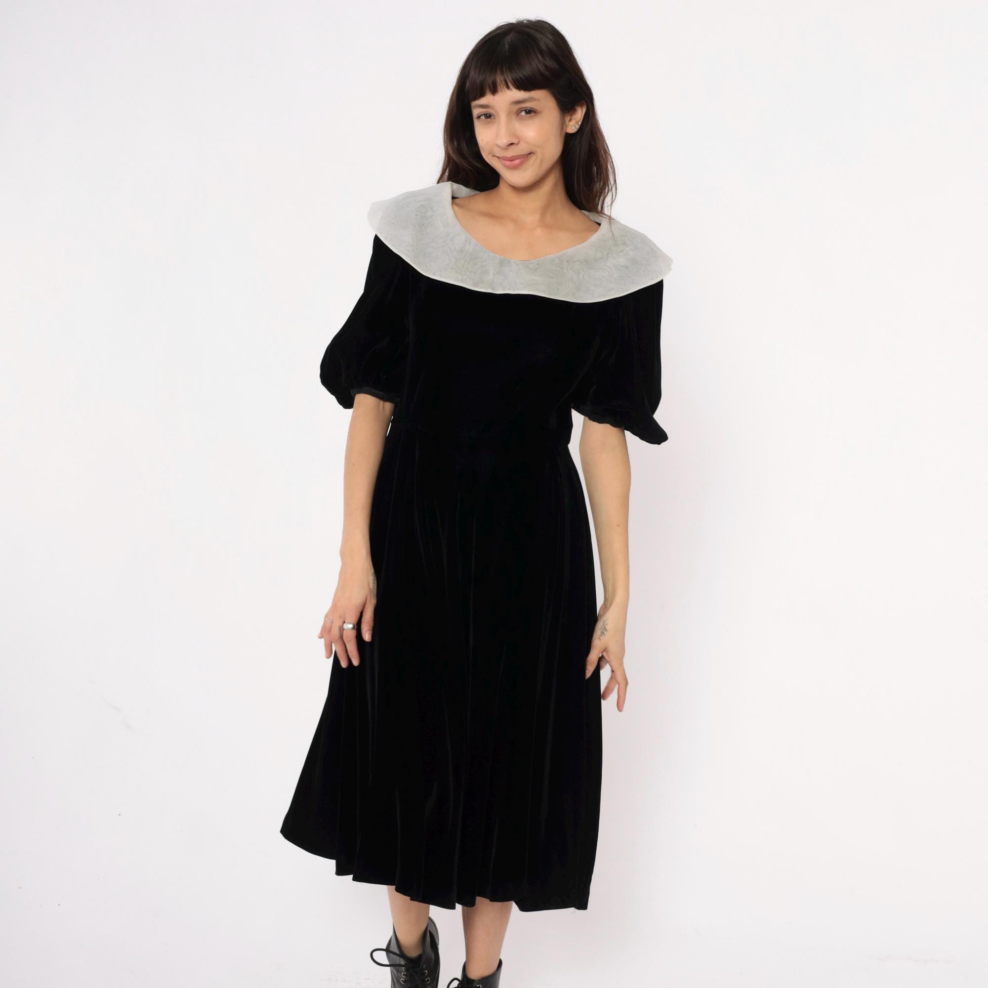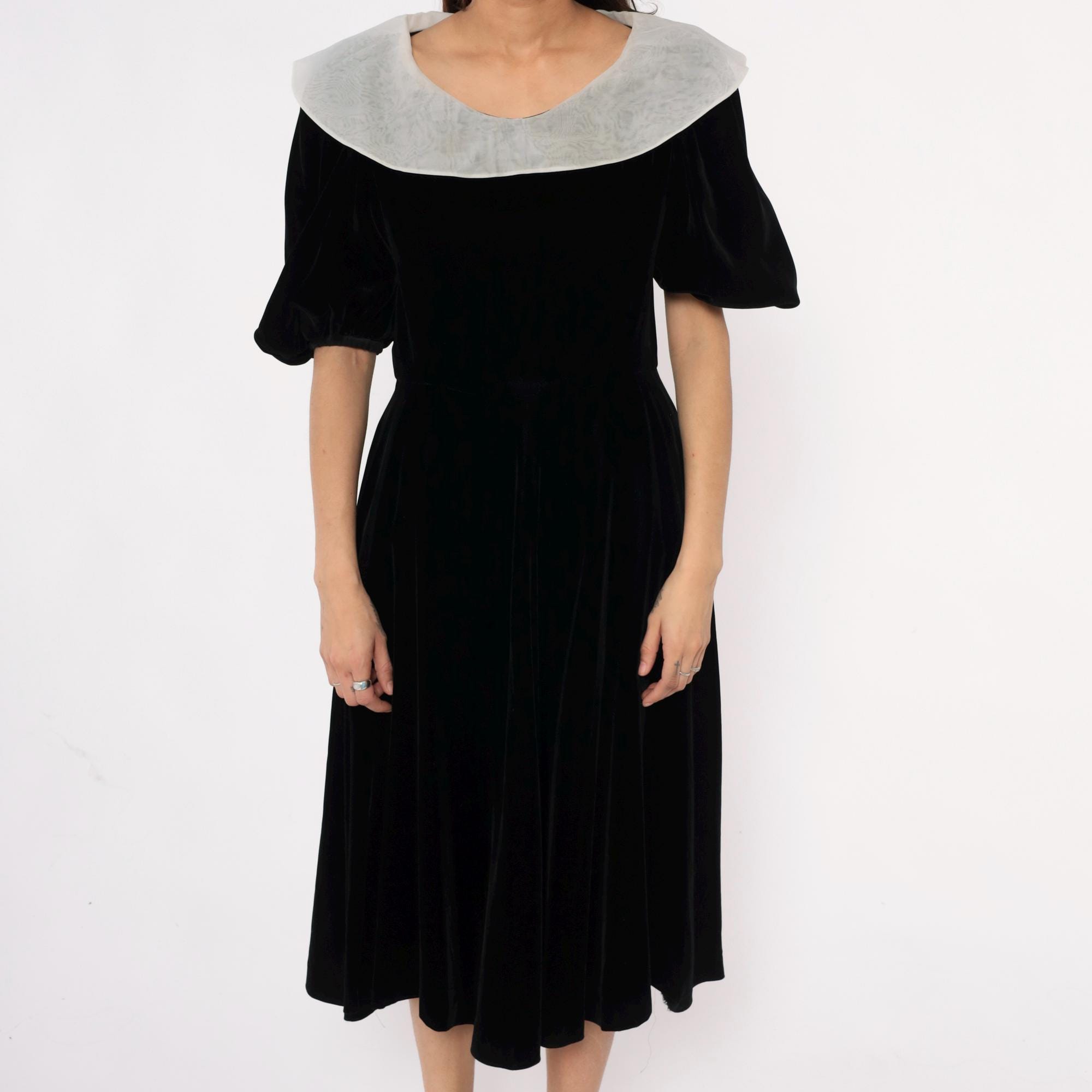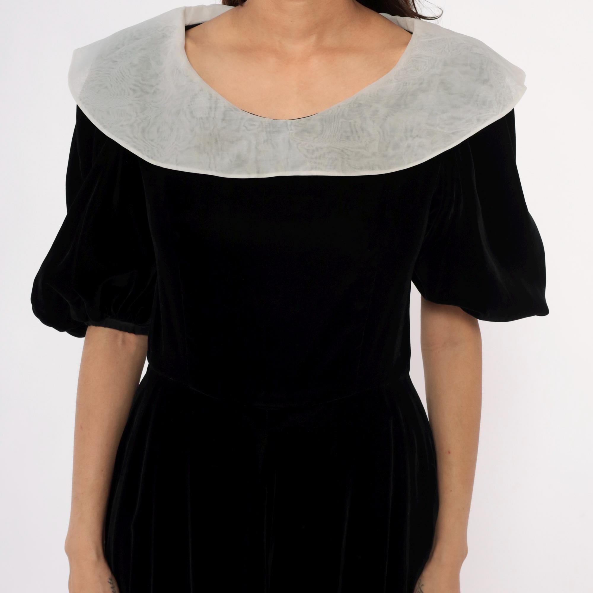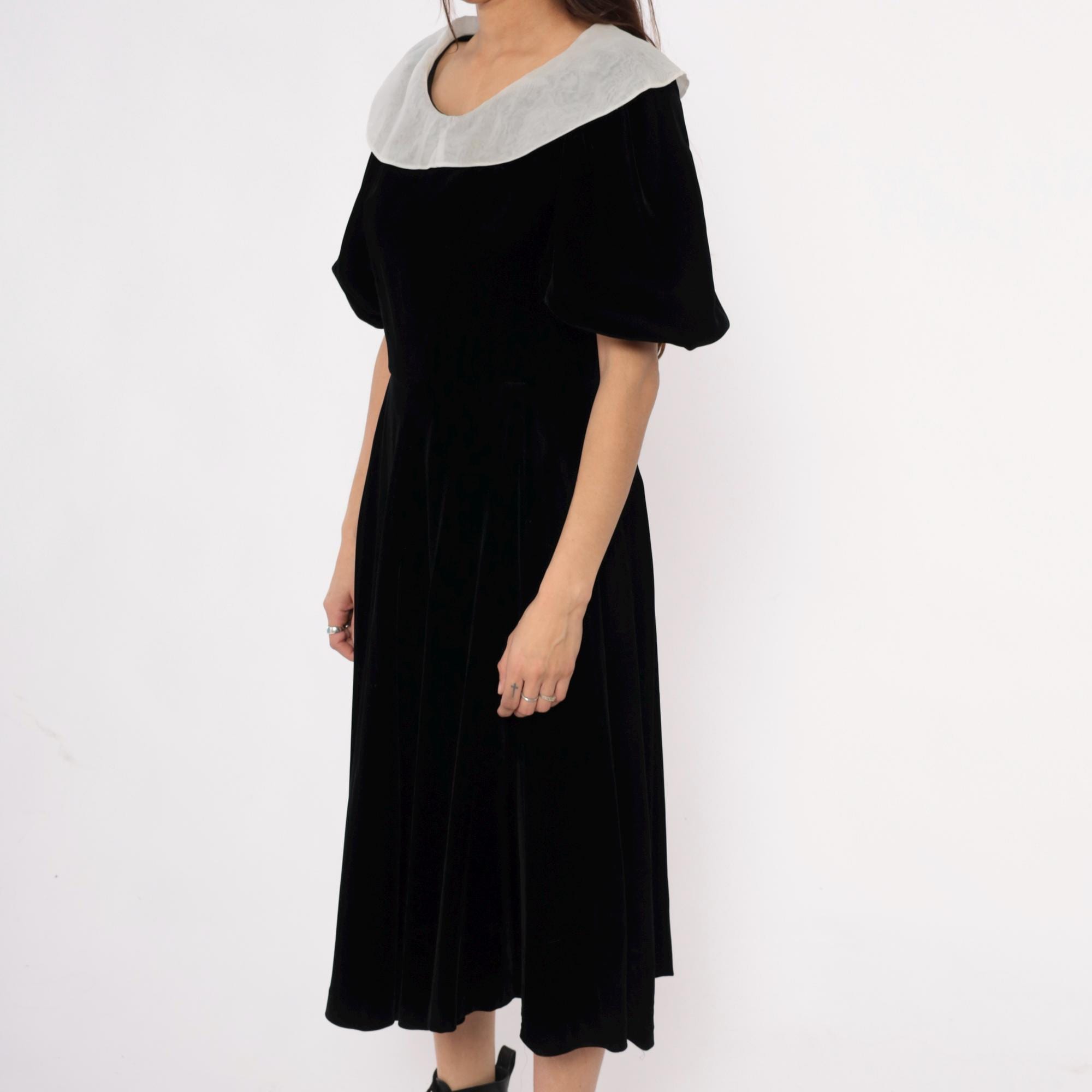 Y2K black velvet midi dress from yuki torii with wide light gray peter pan collar. Off-shoulder neckline, short puff sleeves, back zipper closure.