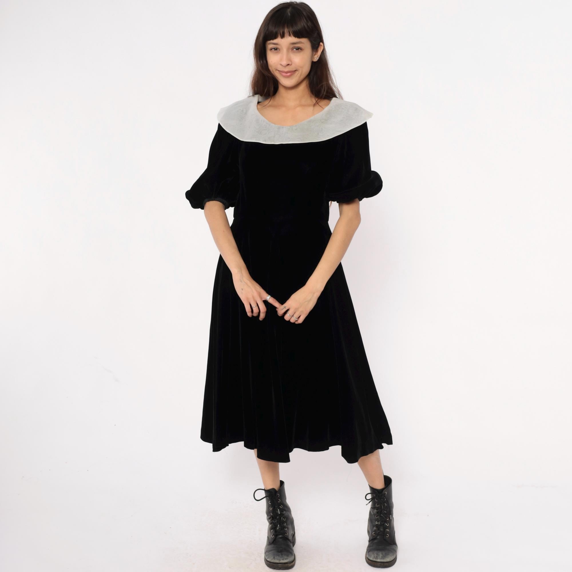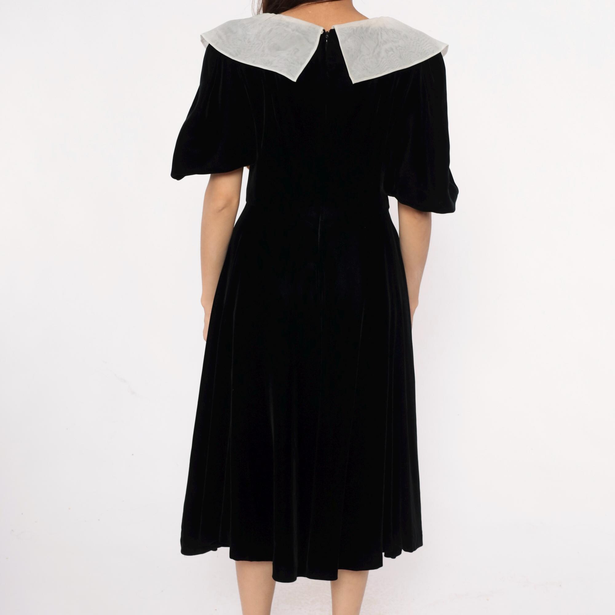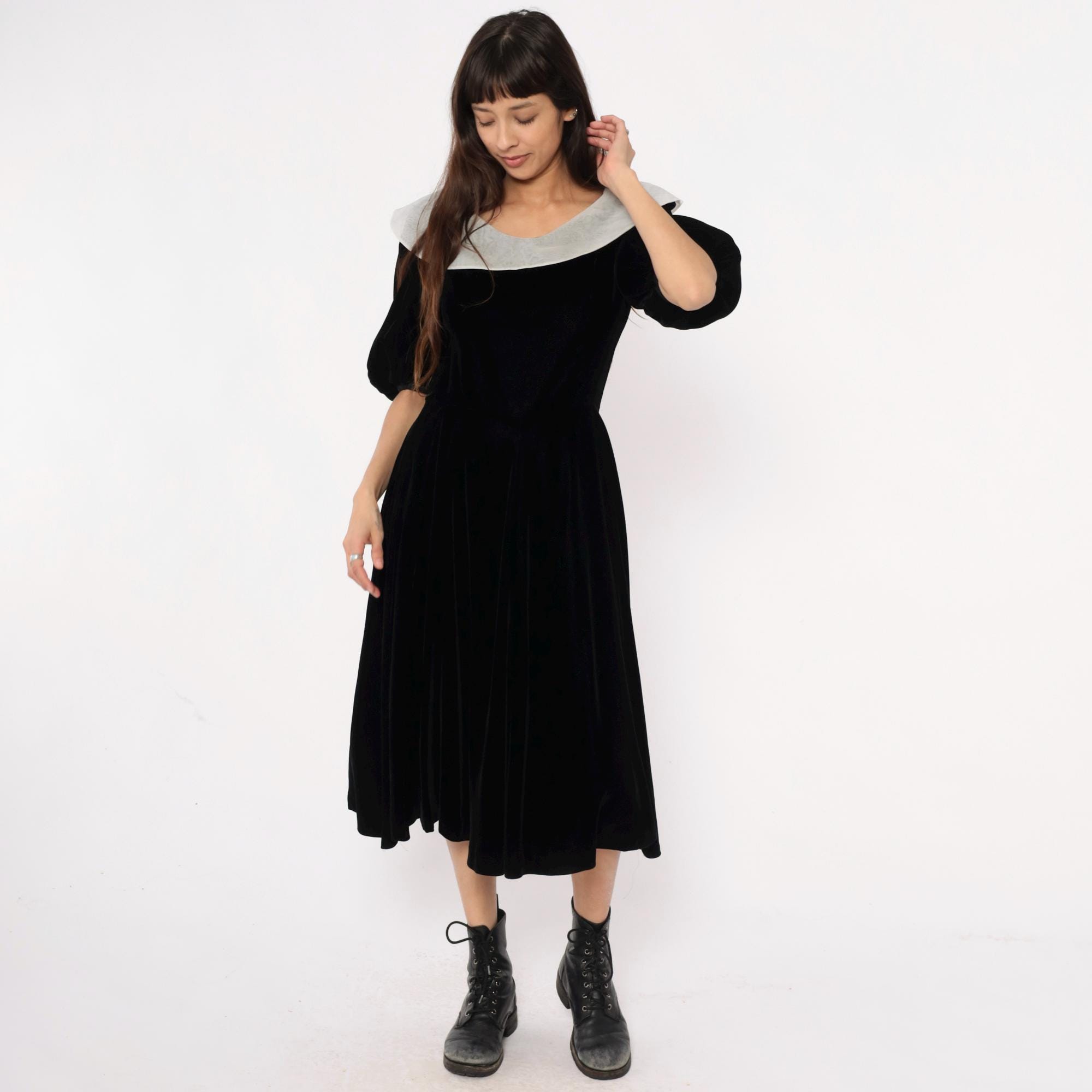 Y2K black velvet midi dress from yuki torii with wide light gray peter pan collar. Off-shoulder neckline, short puff sleeves, back zipper closure.