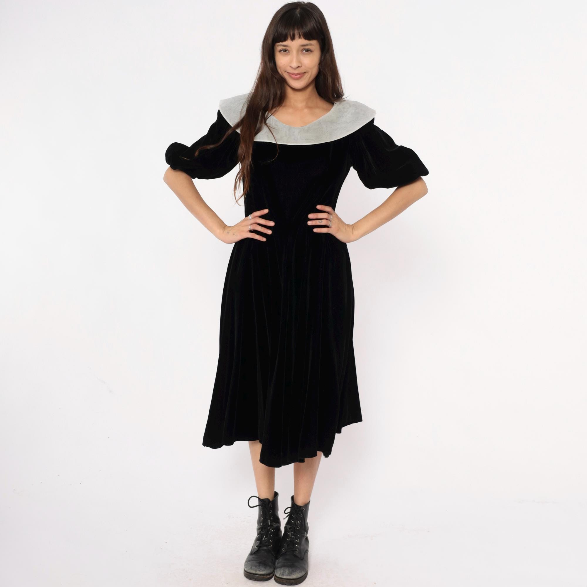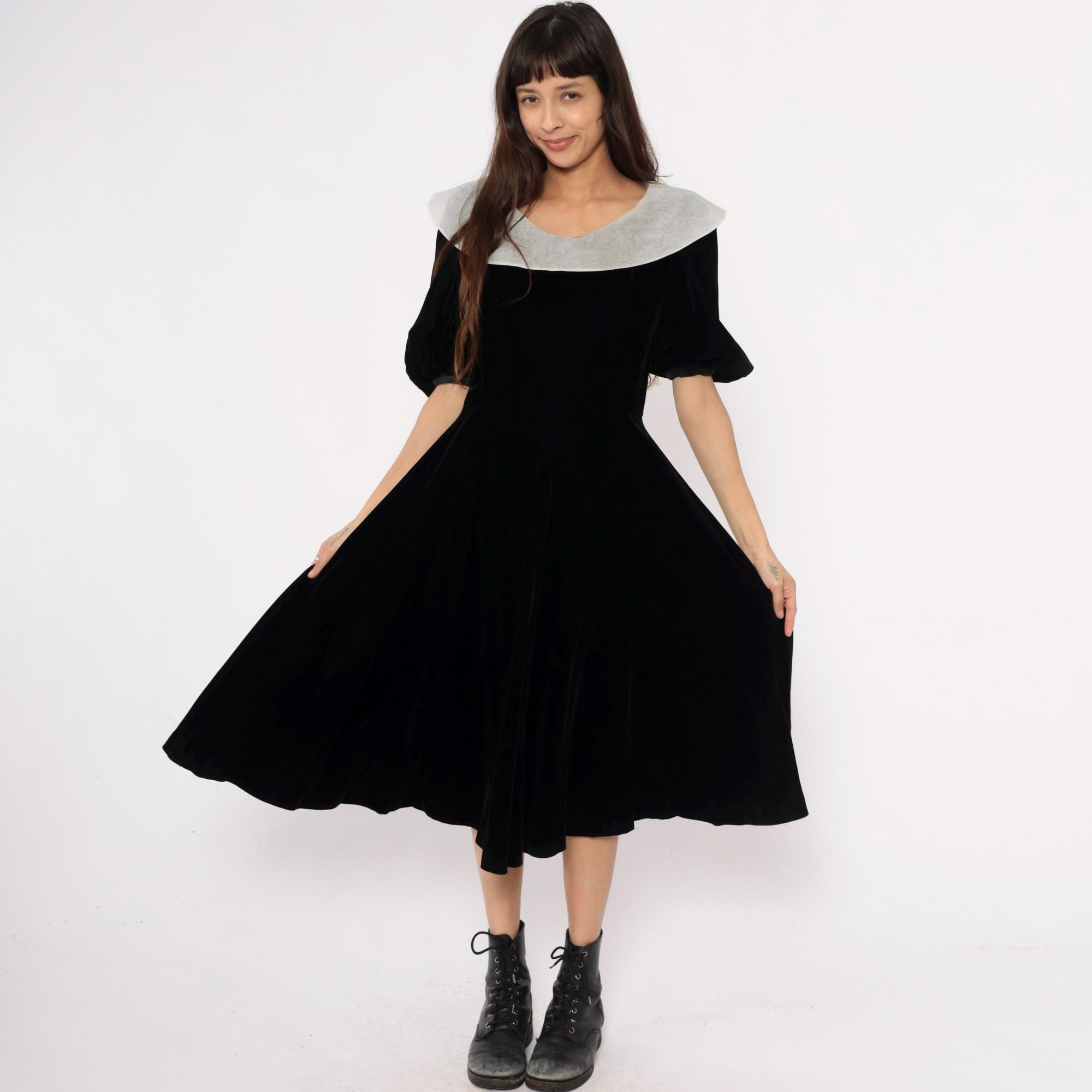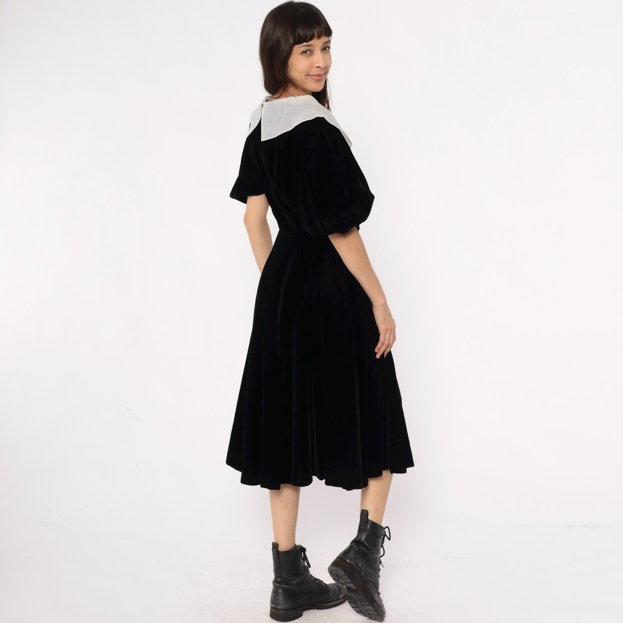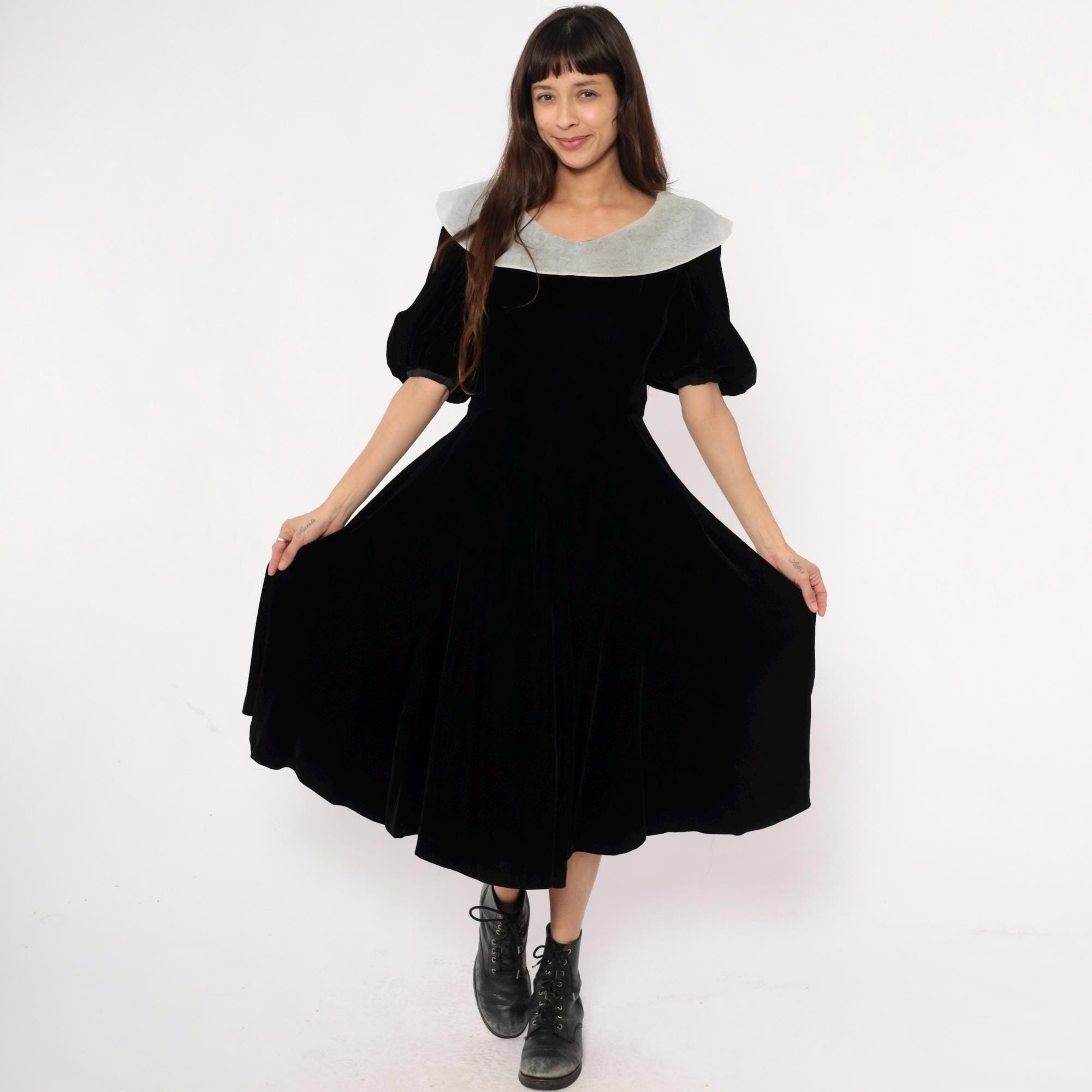 Y2K black velvet midi dress from yuki torii with wide light gray peter pan collar. Off-shoulder neckline, short puff sleeves, back zipper closure.