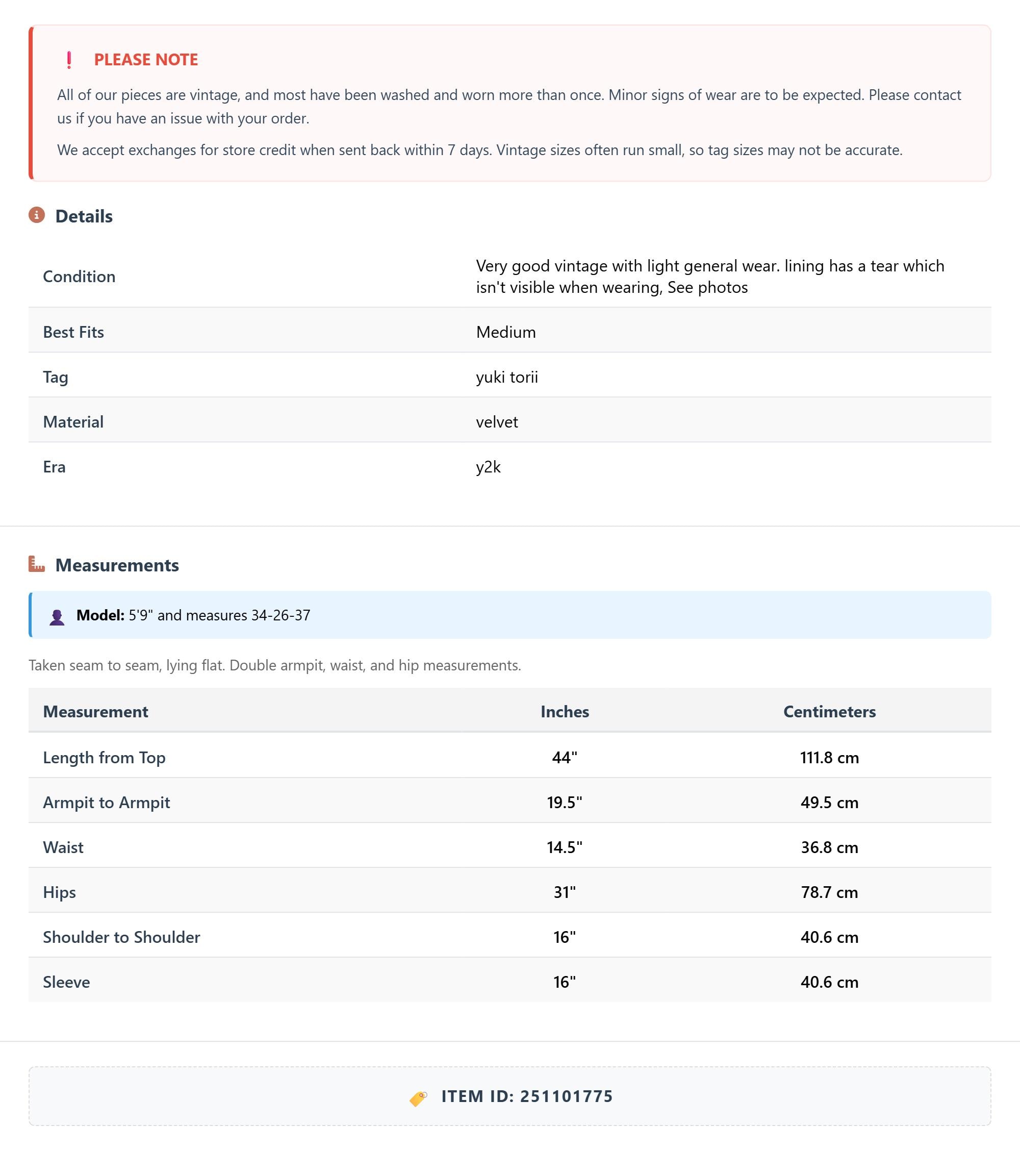 All of our pieces are vintage, and most have been washed and worn more than once. Minor signs of wear are to be expected. Please contact us if you have an issue with your order. We accept exchanges for store credit when sent back within 7 days.