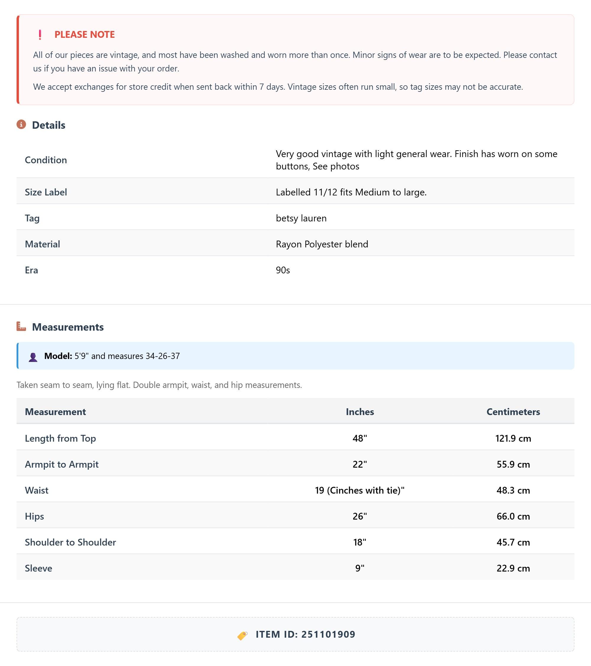 All of our pieces are vintage, and most have been washed and worn more than once. Minor signs of wear are to be expected. Please contact us if you have an issue with your order. We accept exchanges for store credit when sent back within 7 days.