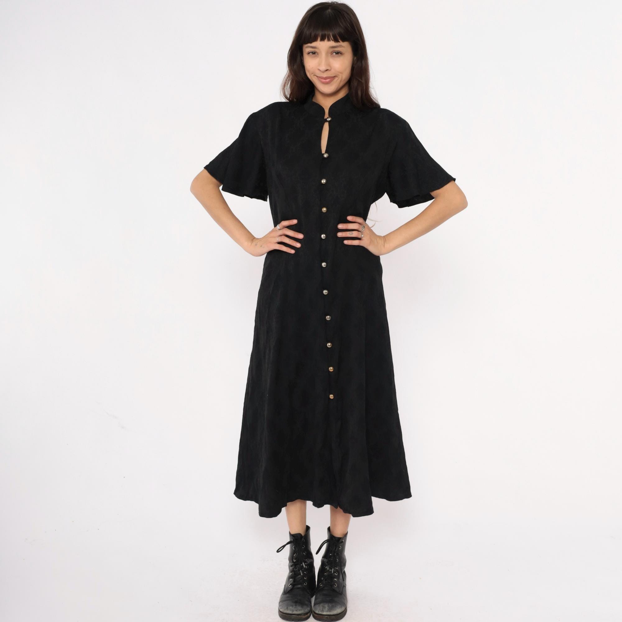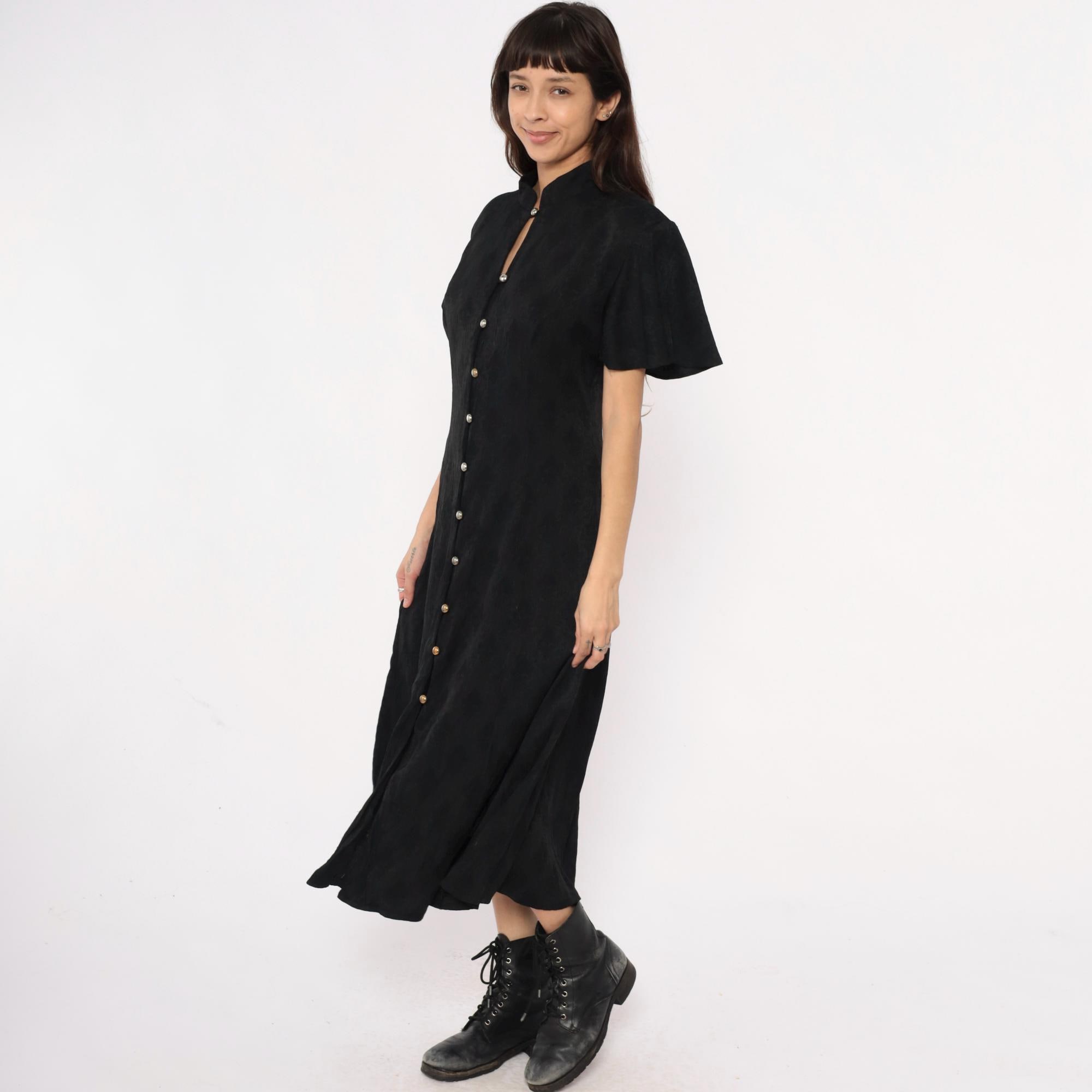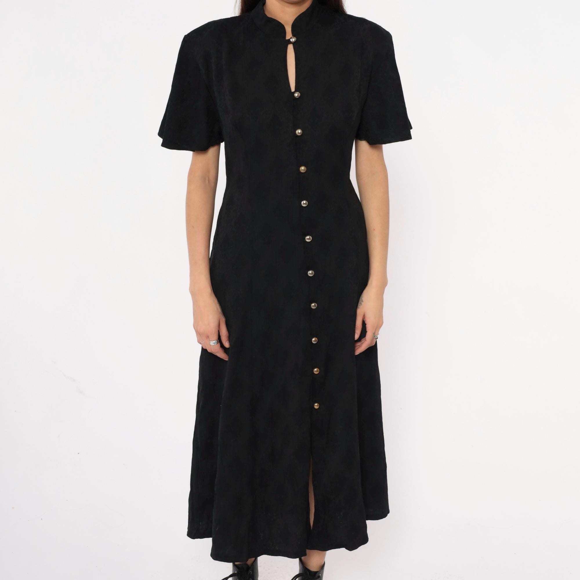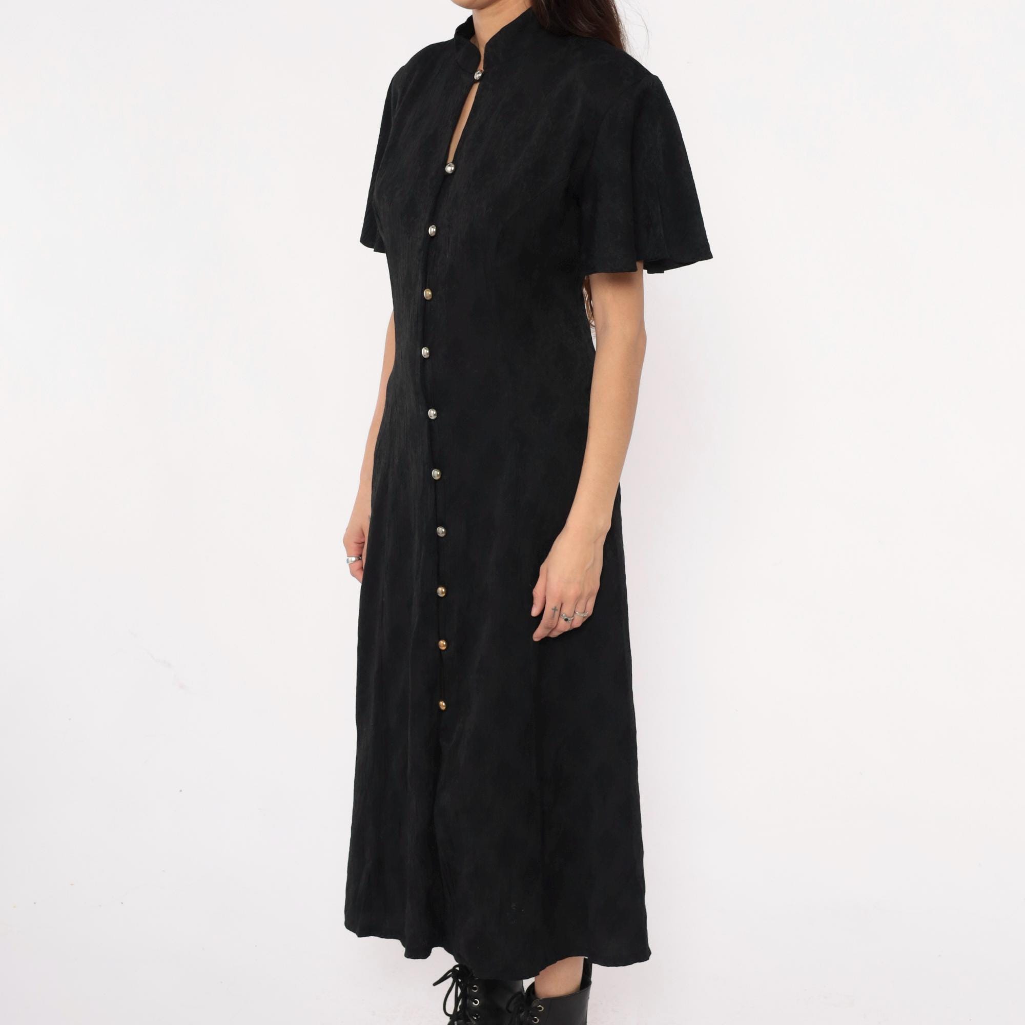 90s black maxi dress from betsy lauren with mandarin collar and keyhole neckline detail. Button front closure with metal dome buttons down center front, short flutter sleeves, fitted bodice with back tie closure. Side seam pockets.