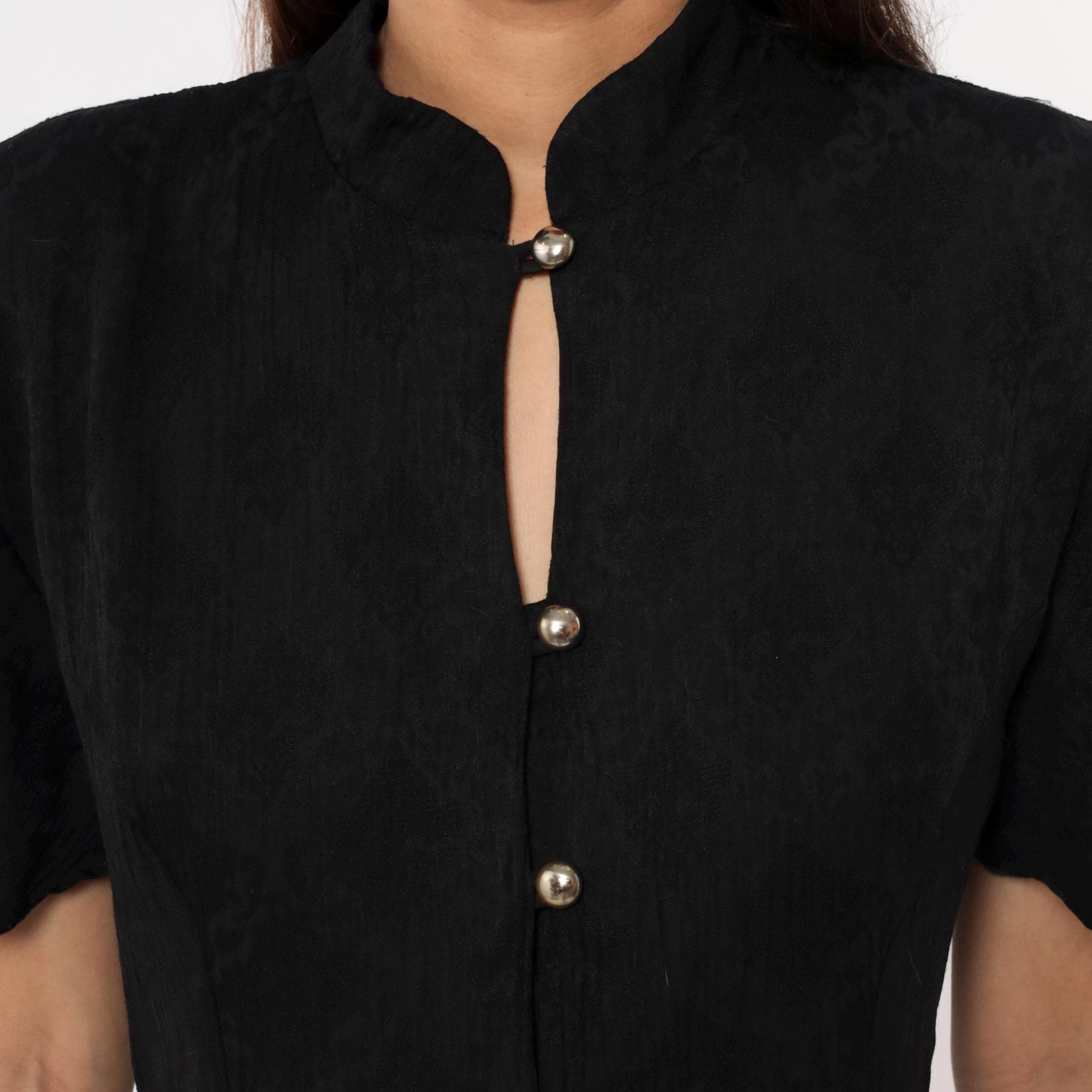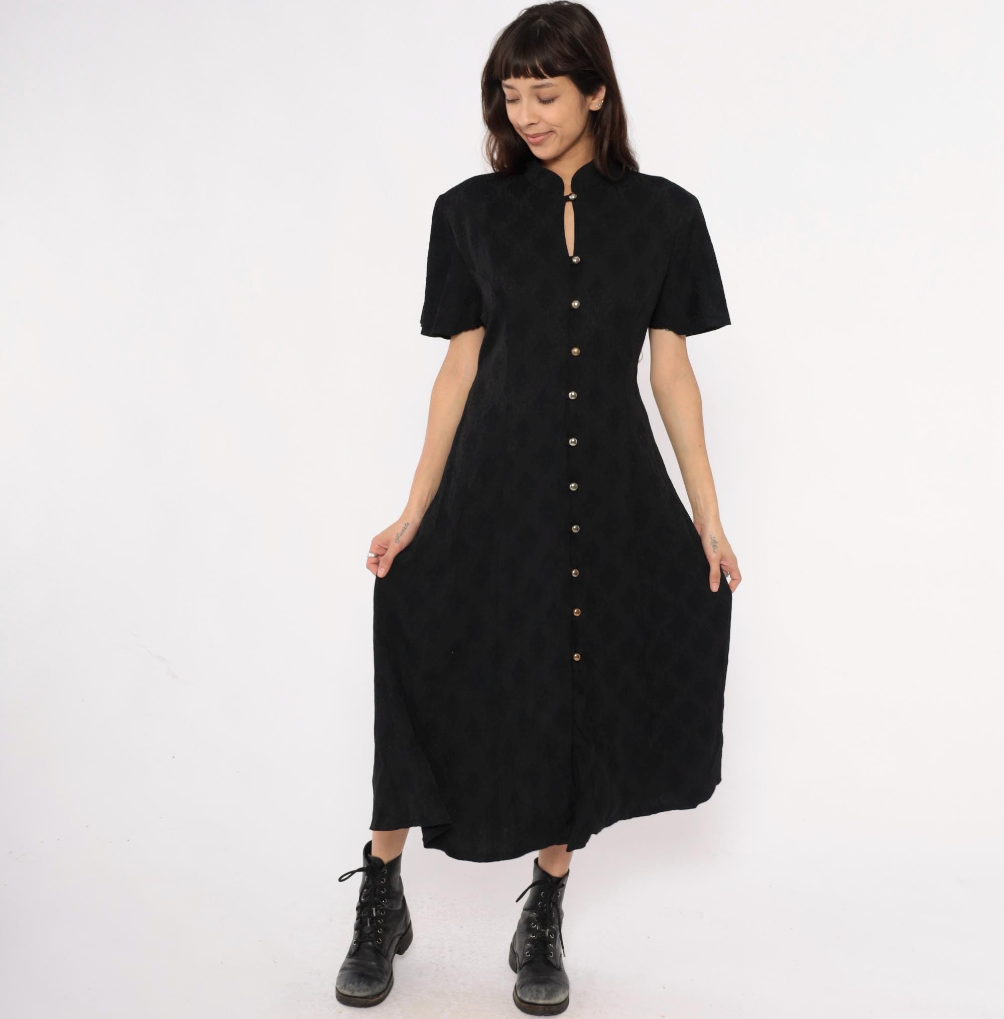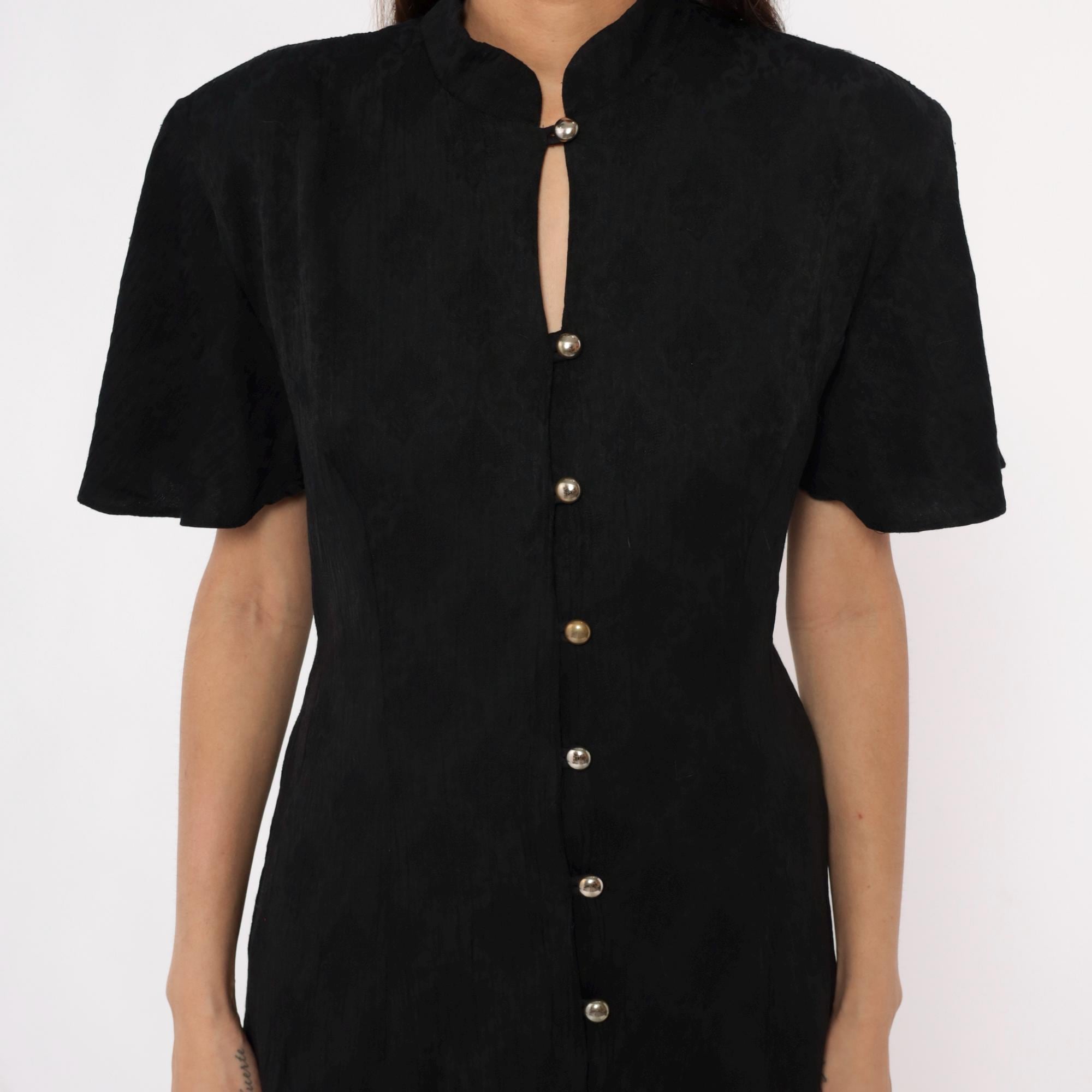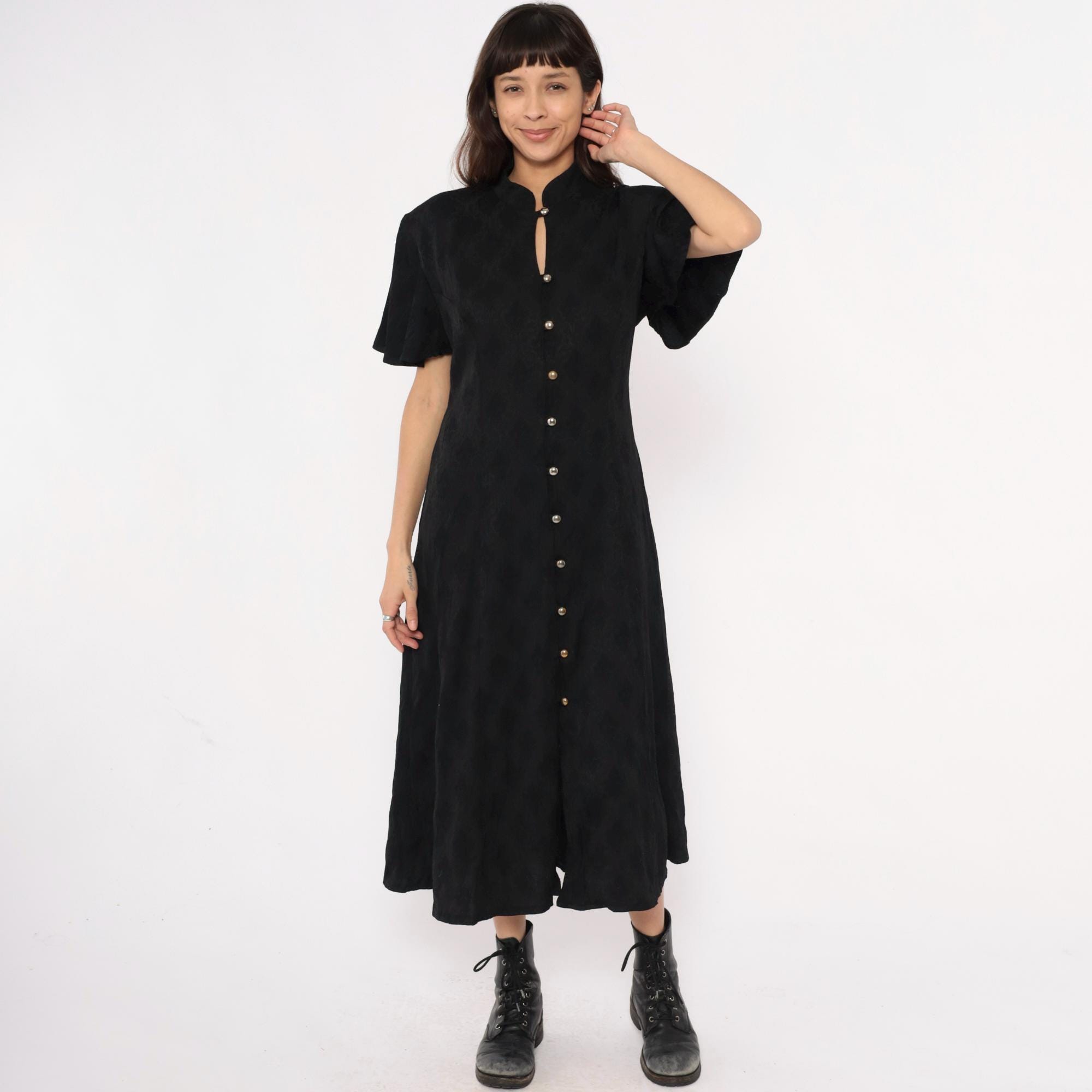 90s black maxi dress from betsy lauren with mandarin collar and keyhole neckline detail. Button front closure with metal dome buttons down center front, short flutter sleeves, fitted bodice with back tie closure. Side seam pockets.