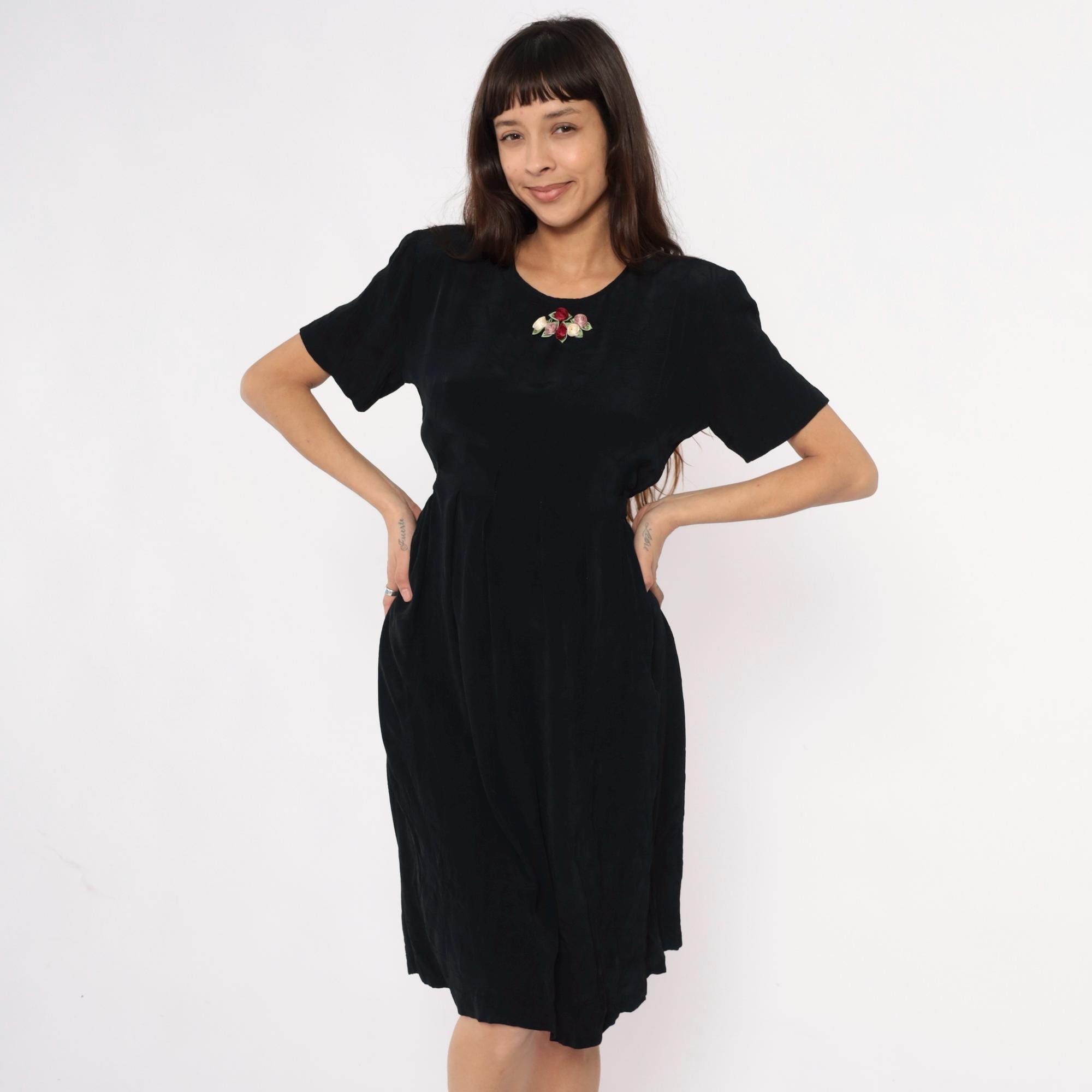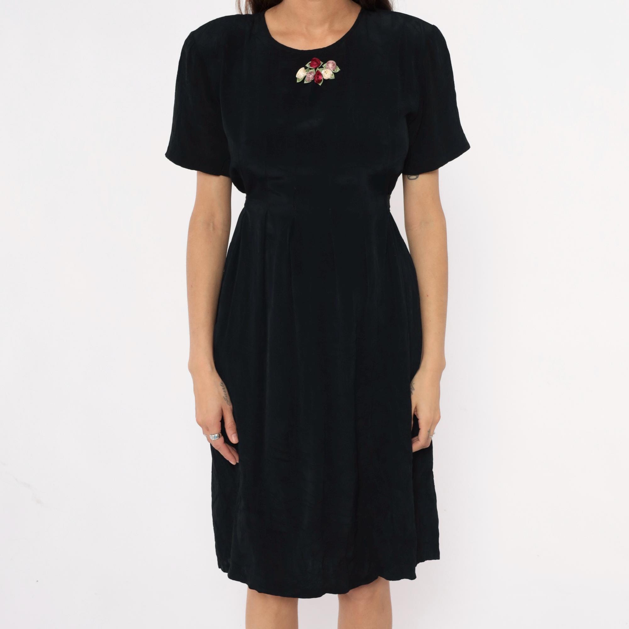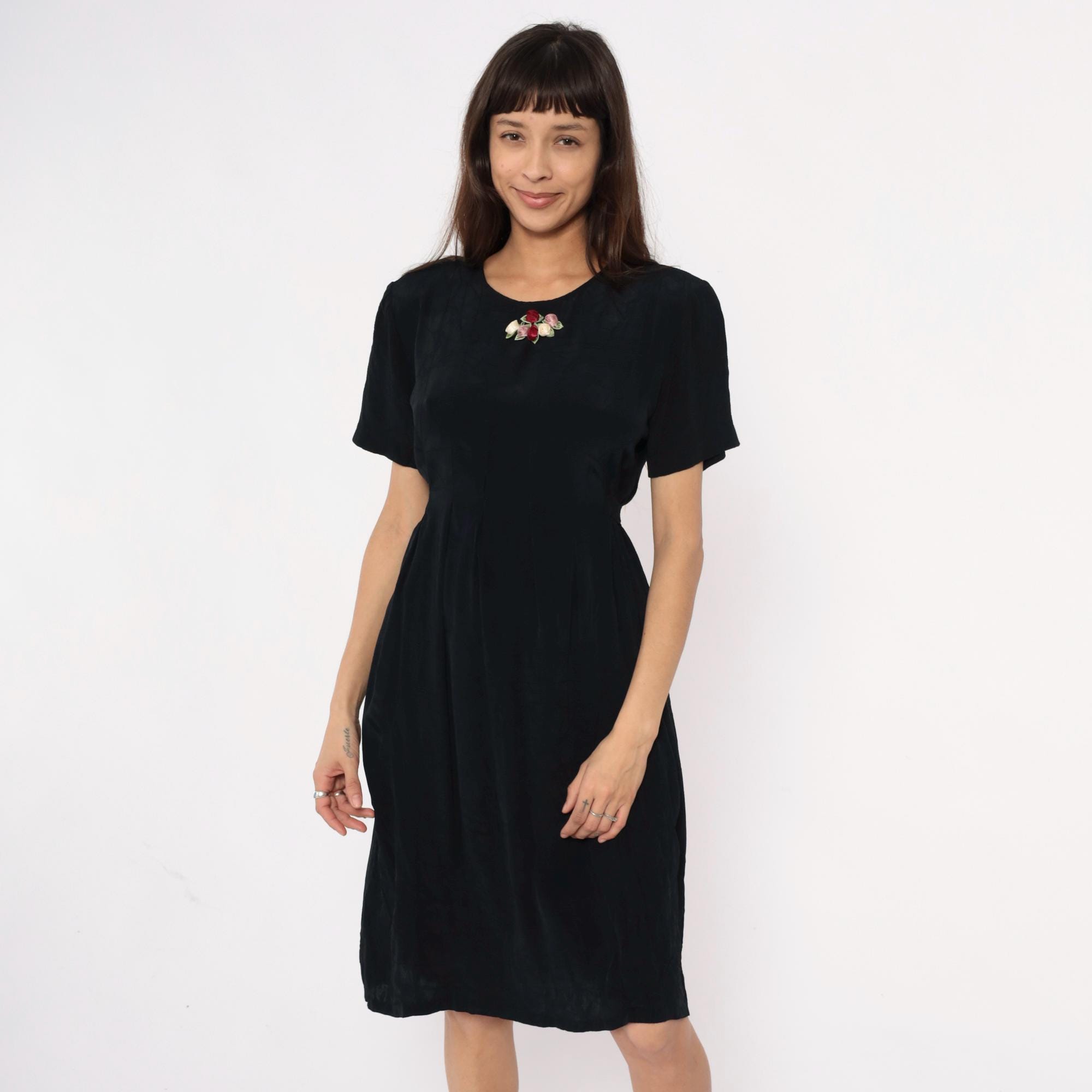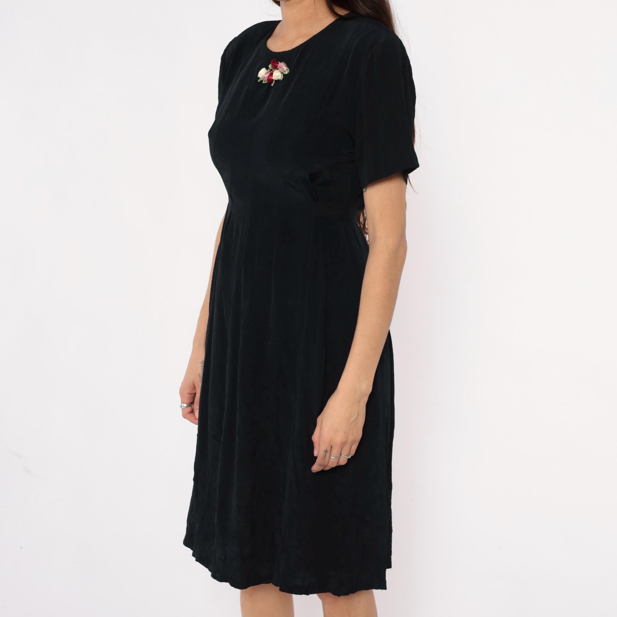 90s black dress from jbs ltd with round neckline, short sleeves, and fitted waist with back tie closure. Decorative floral brooch at neckline in red, pink, and cream. Knee-length straight skirt with side seam pockets.