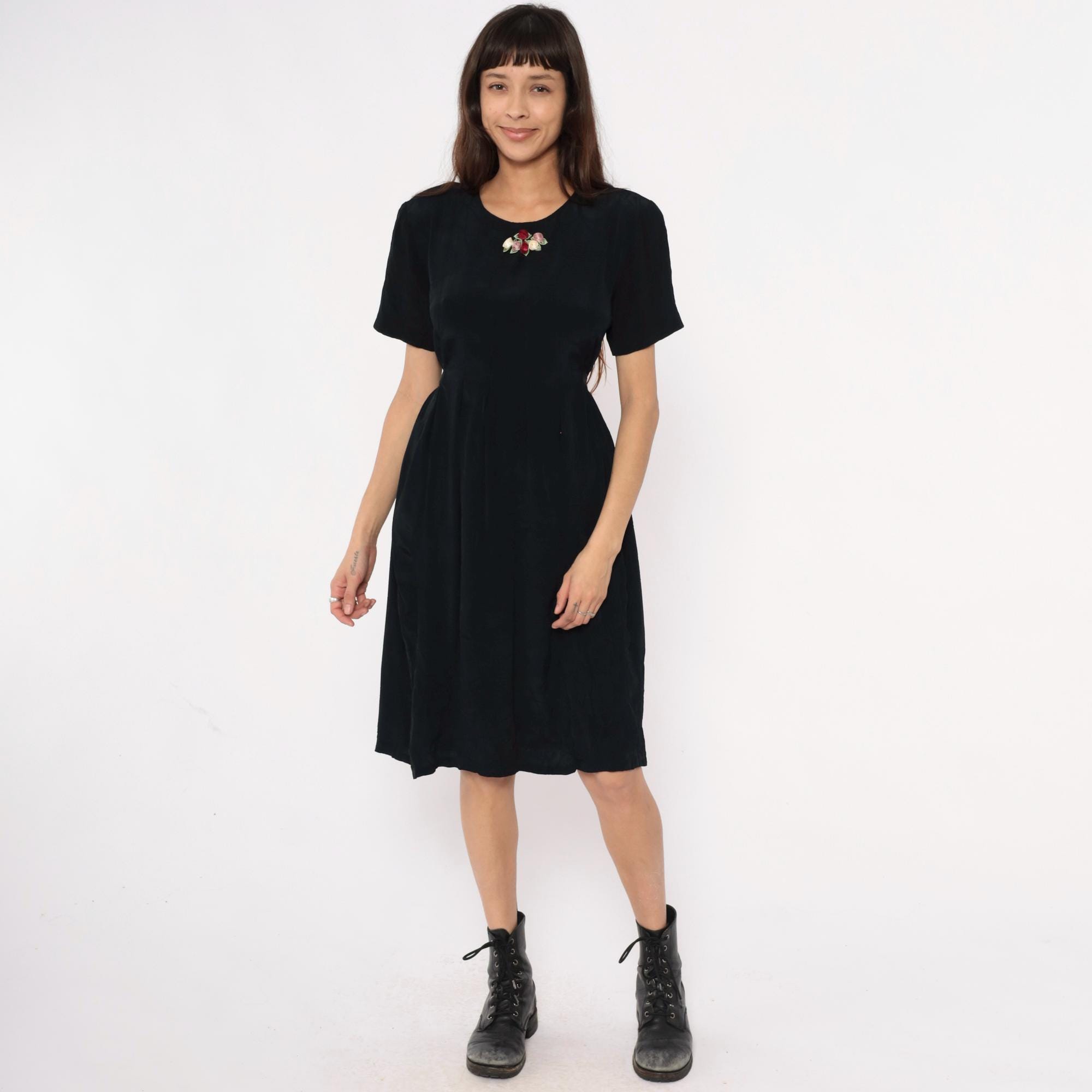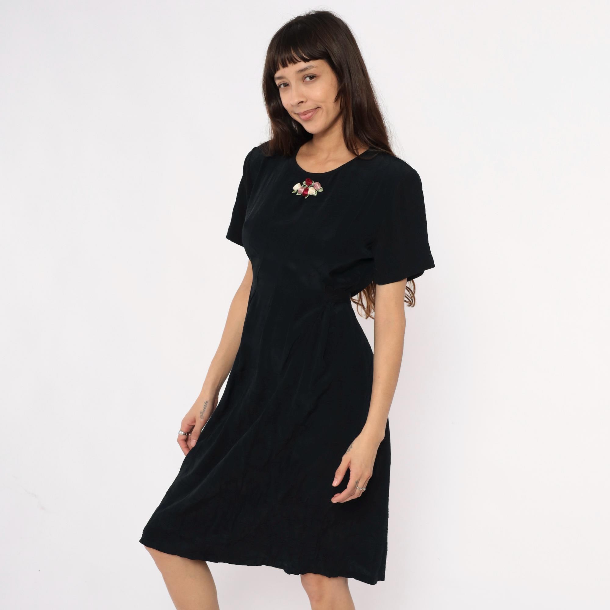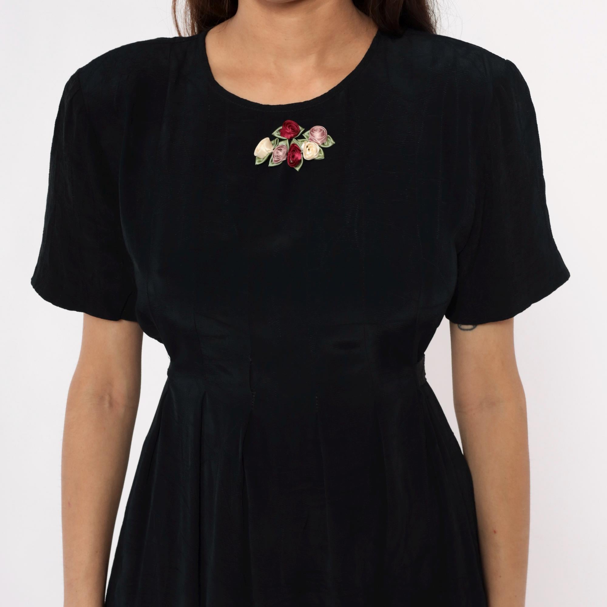 90s black dress from jbs ltd with round neckline, short sleeves, and fitted waist with back tie closure. Decorative floral brooch at neckline in red, pink, and cream. Knee-length straight skirt with side seam pockets.