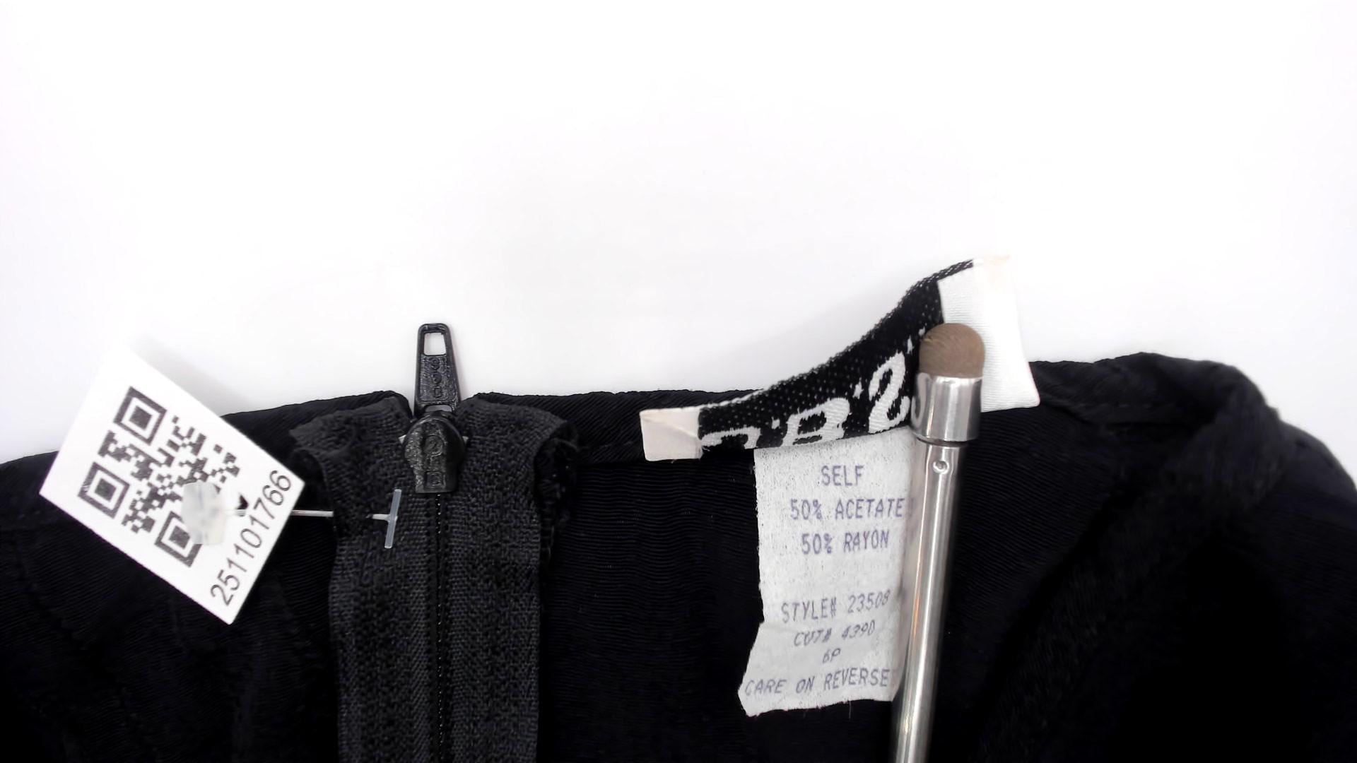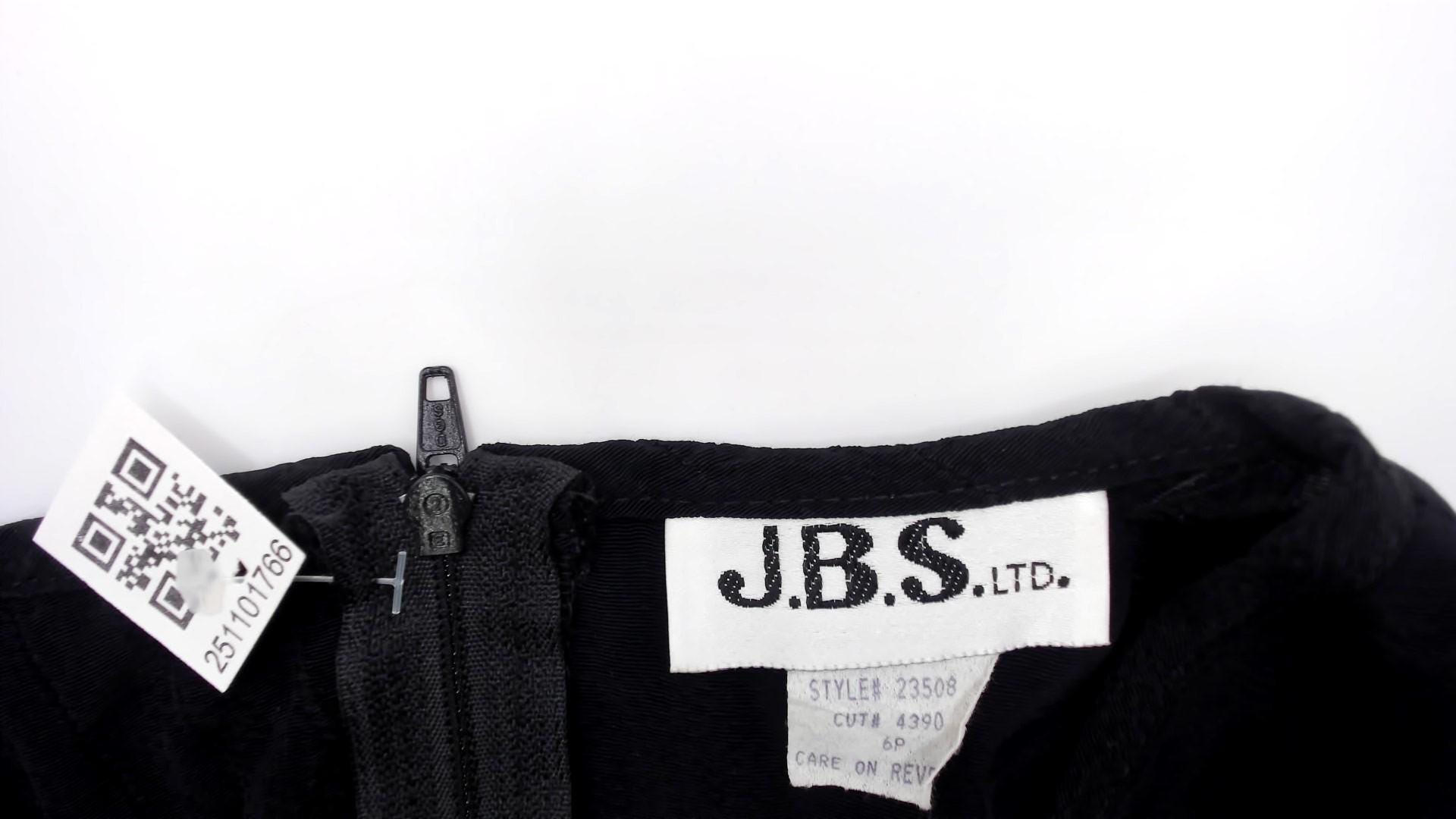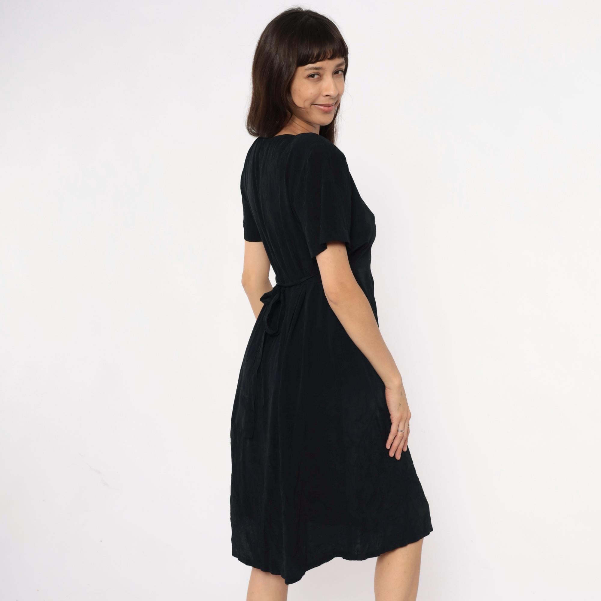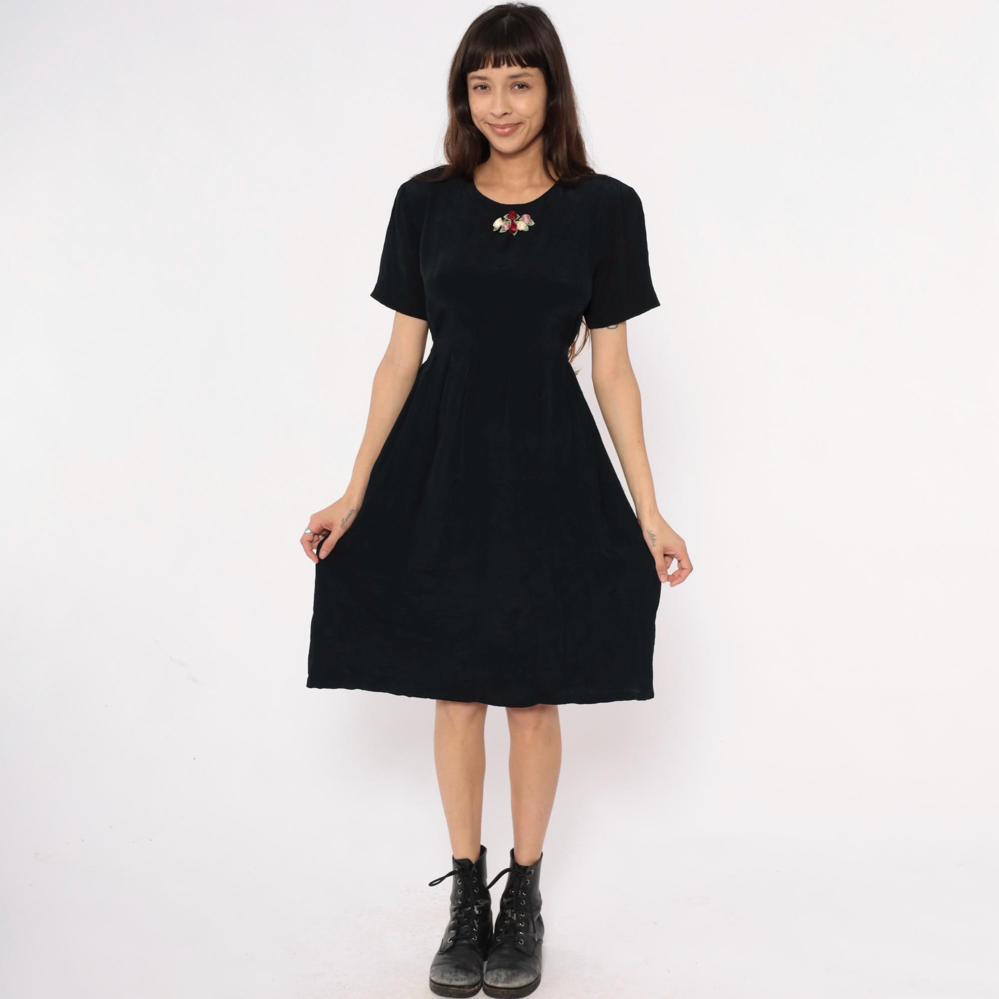 90s black dress from jbs ltd with round neckline, short sleeves, and fitted waist with back tie closure. Decorative floral brooch at neckline in red, pink, and cream. Knee-length straight skirt with side seam pockets.