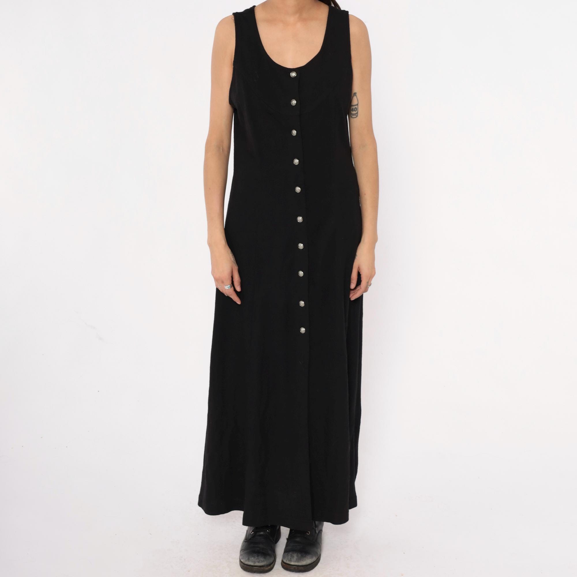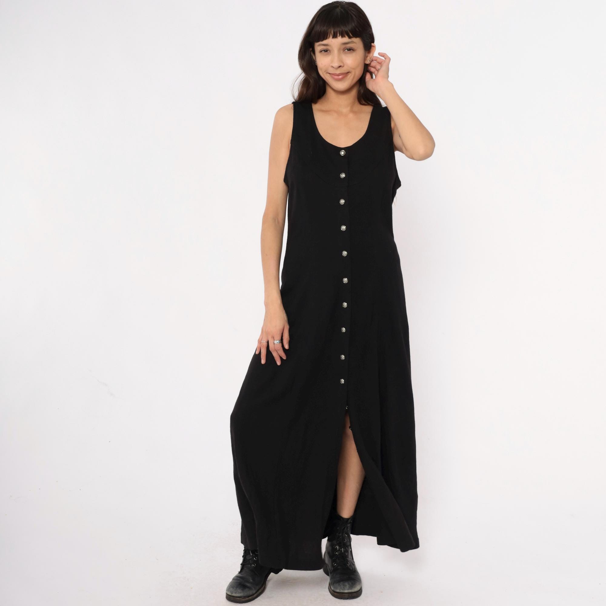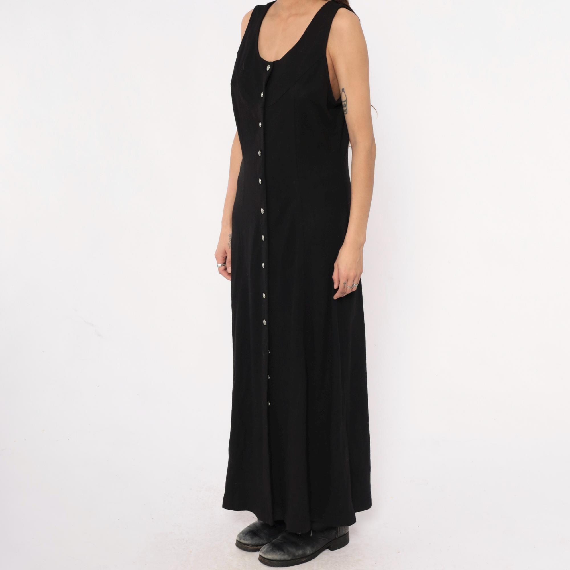 90s black sleeveless maxi dress from clues with scoop neckline and full button front closure with silver-tone decorative buttons. Tank-style shoulders, fitted through bodice with straight column silhouette.
