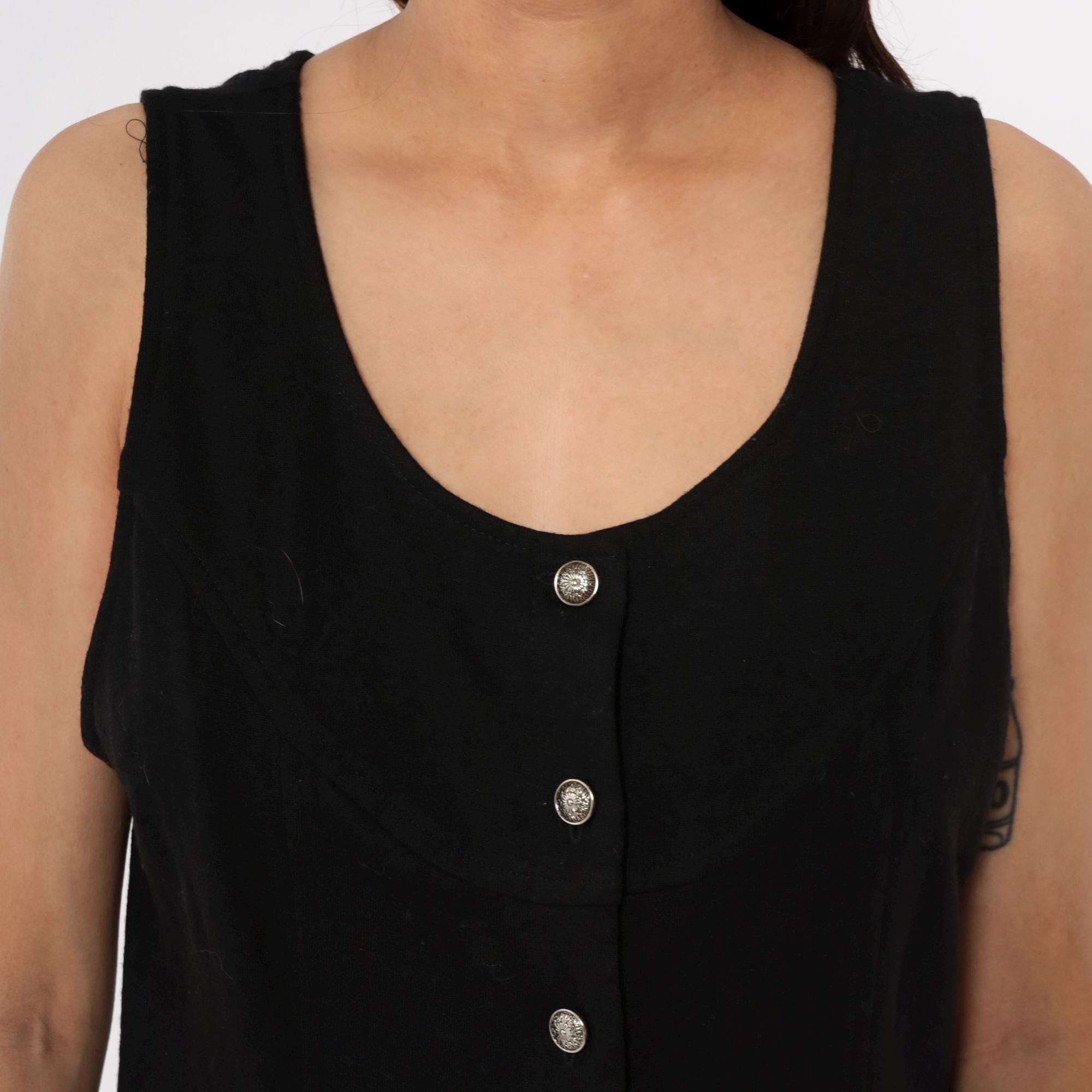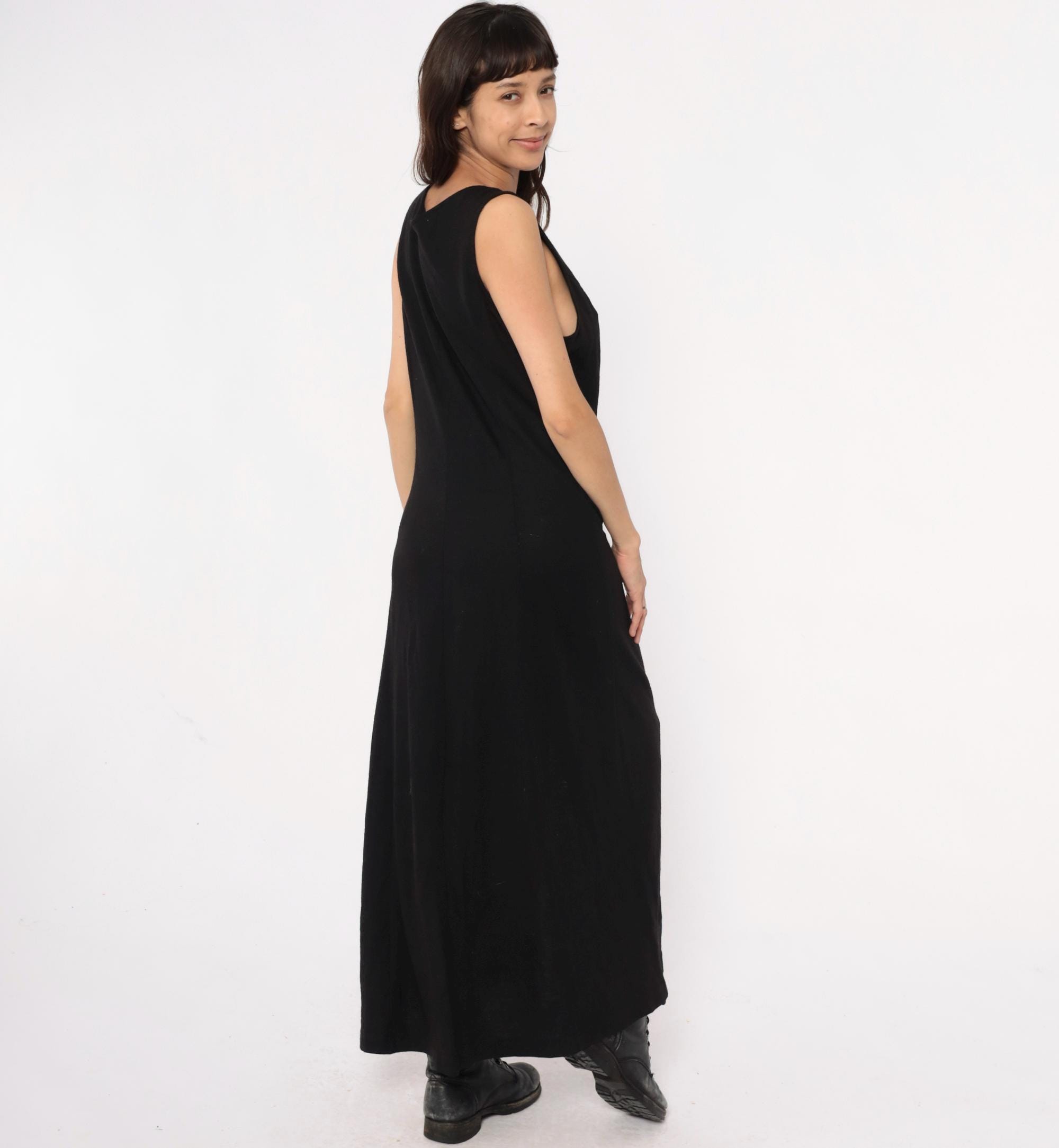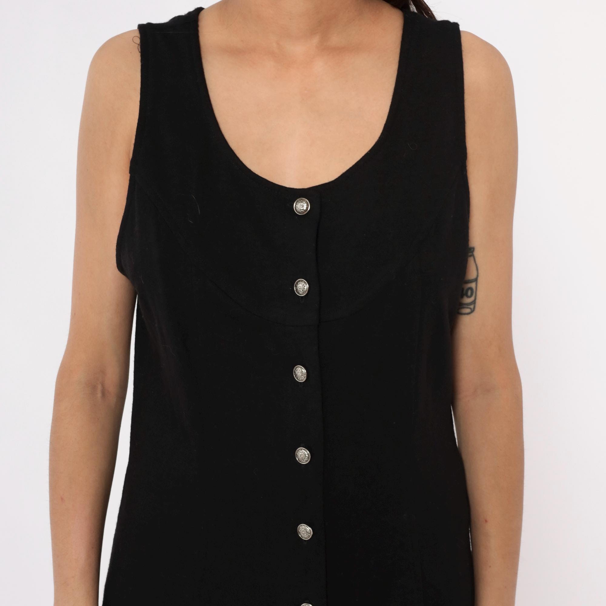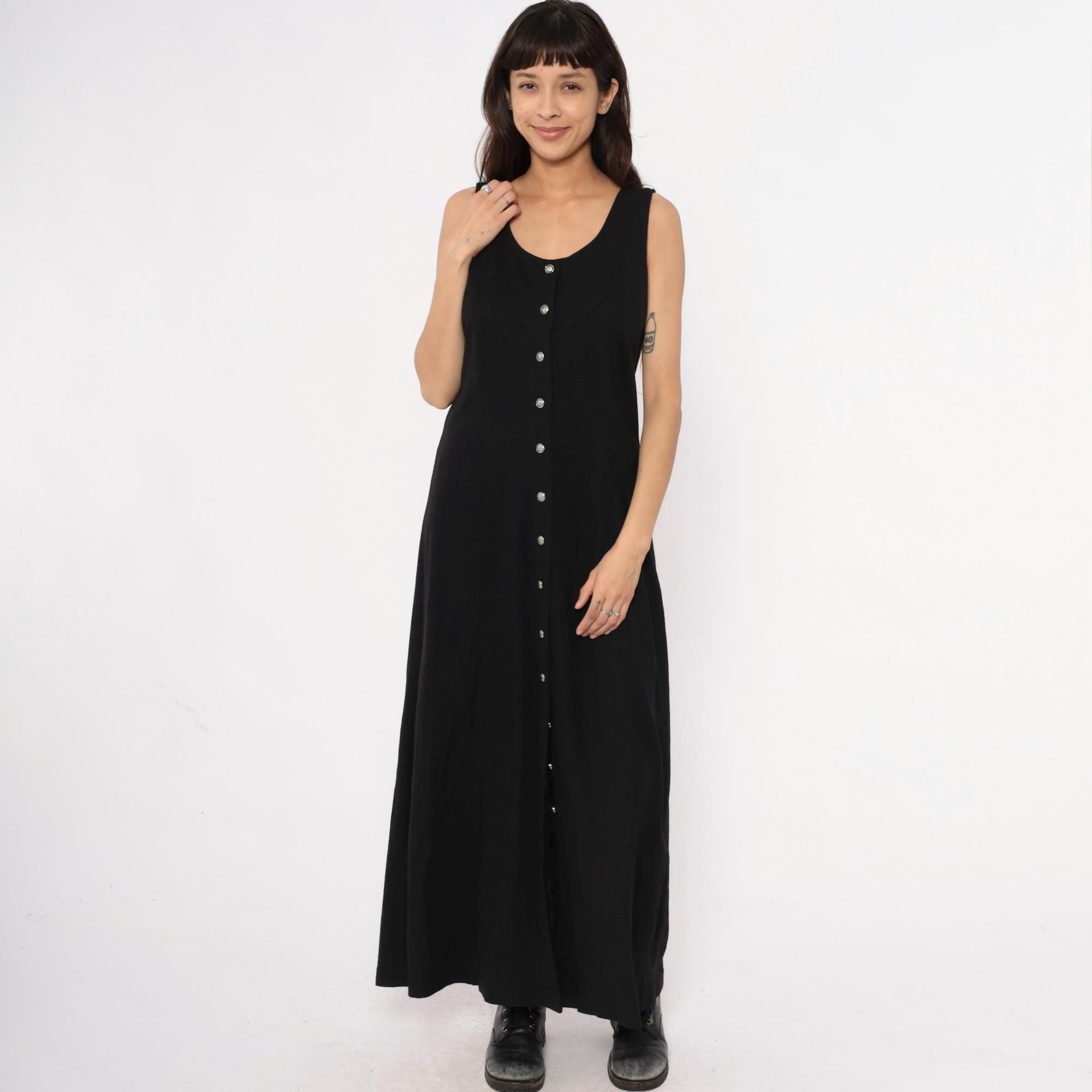 90s black sleeveless maxi dress from clues with scoop neckline and full button front closure with silver-tone decorative buttons. Tank-style shoulders, fitted through bodice with straight column silhouette.